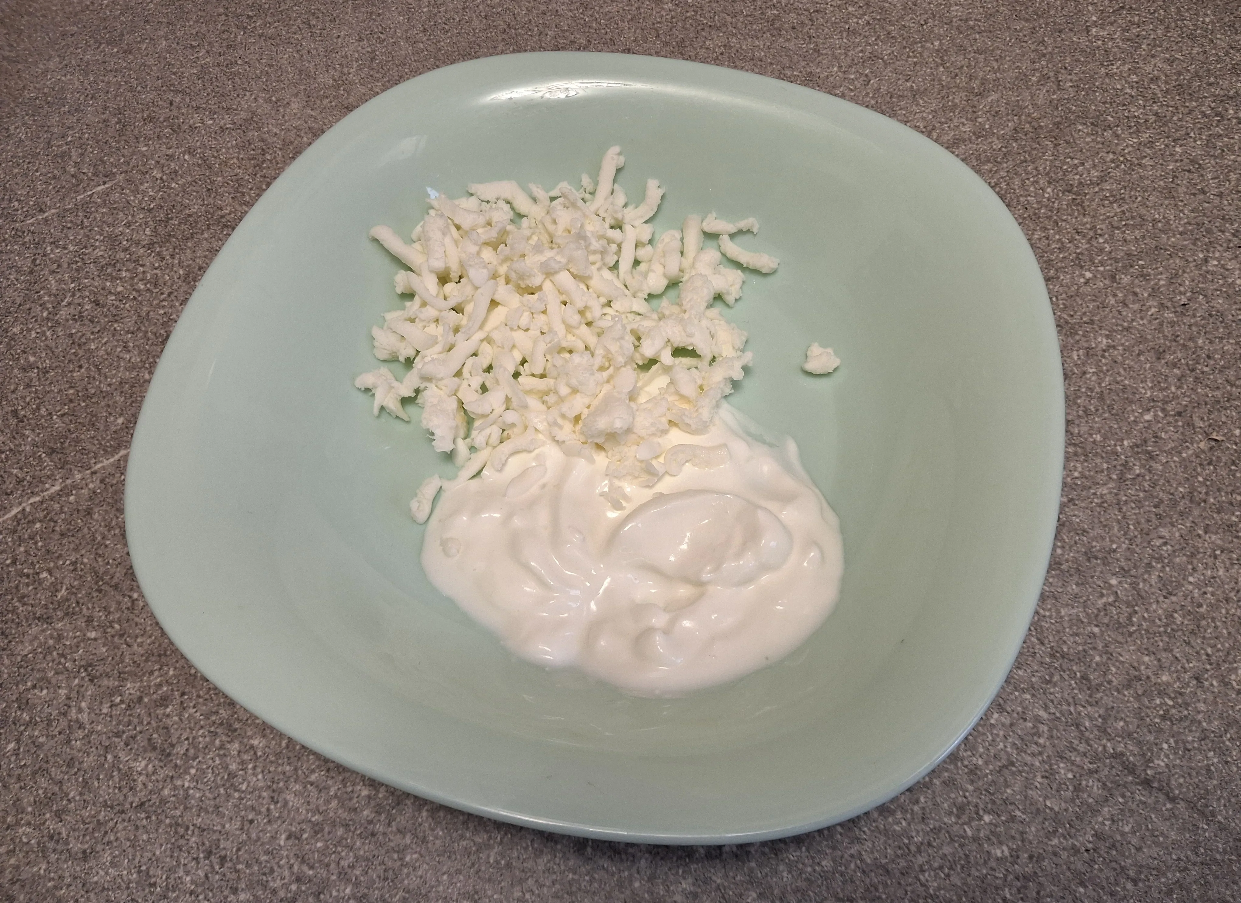 Смешайте натертый сыр и сметану.