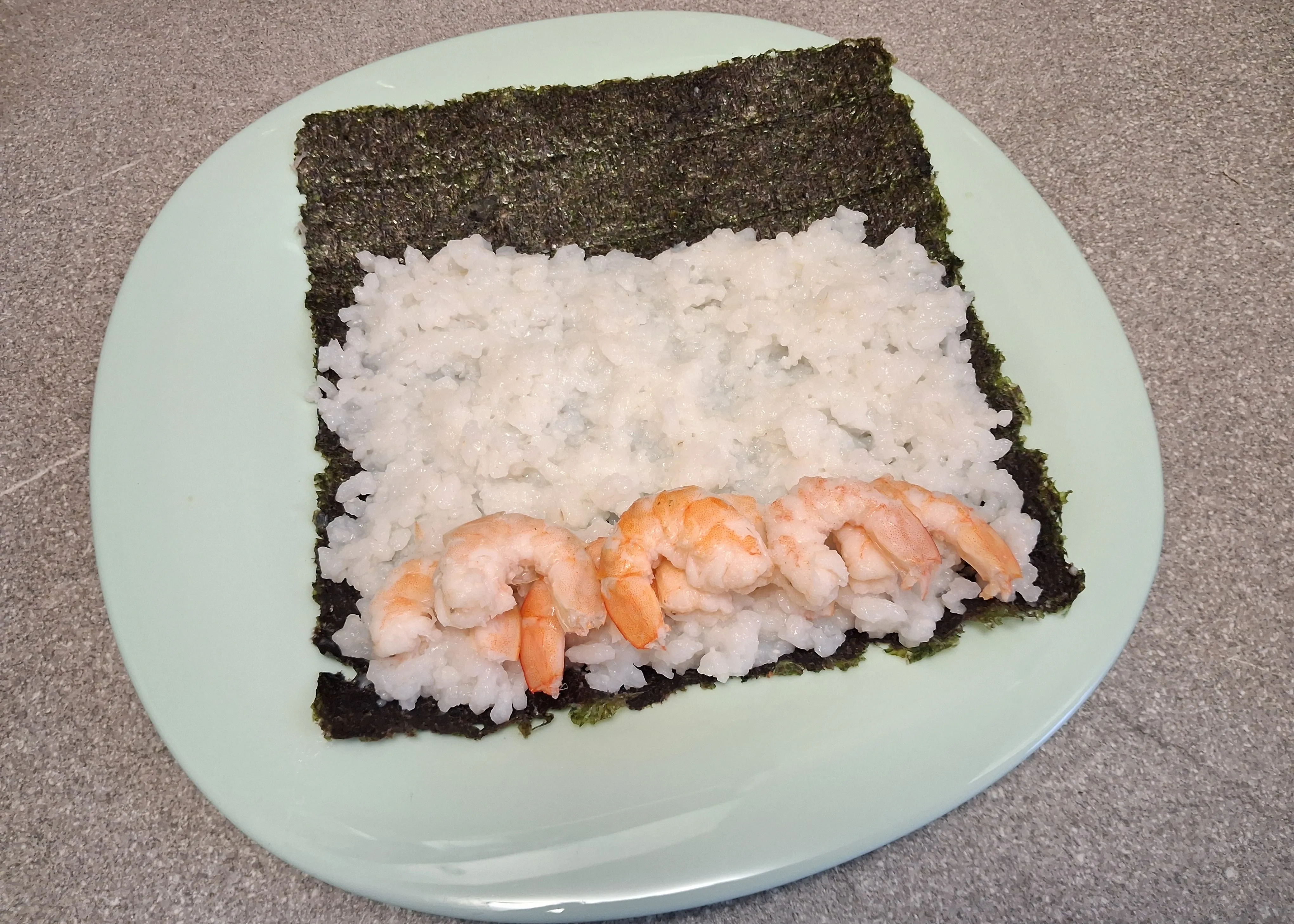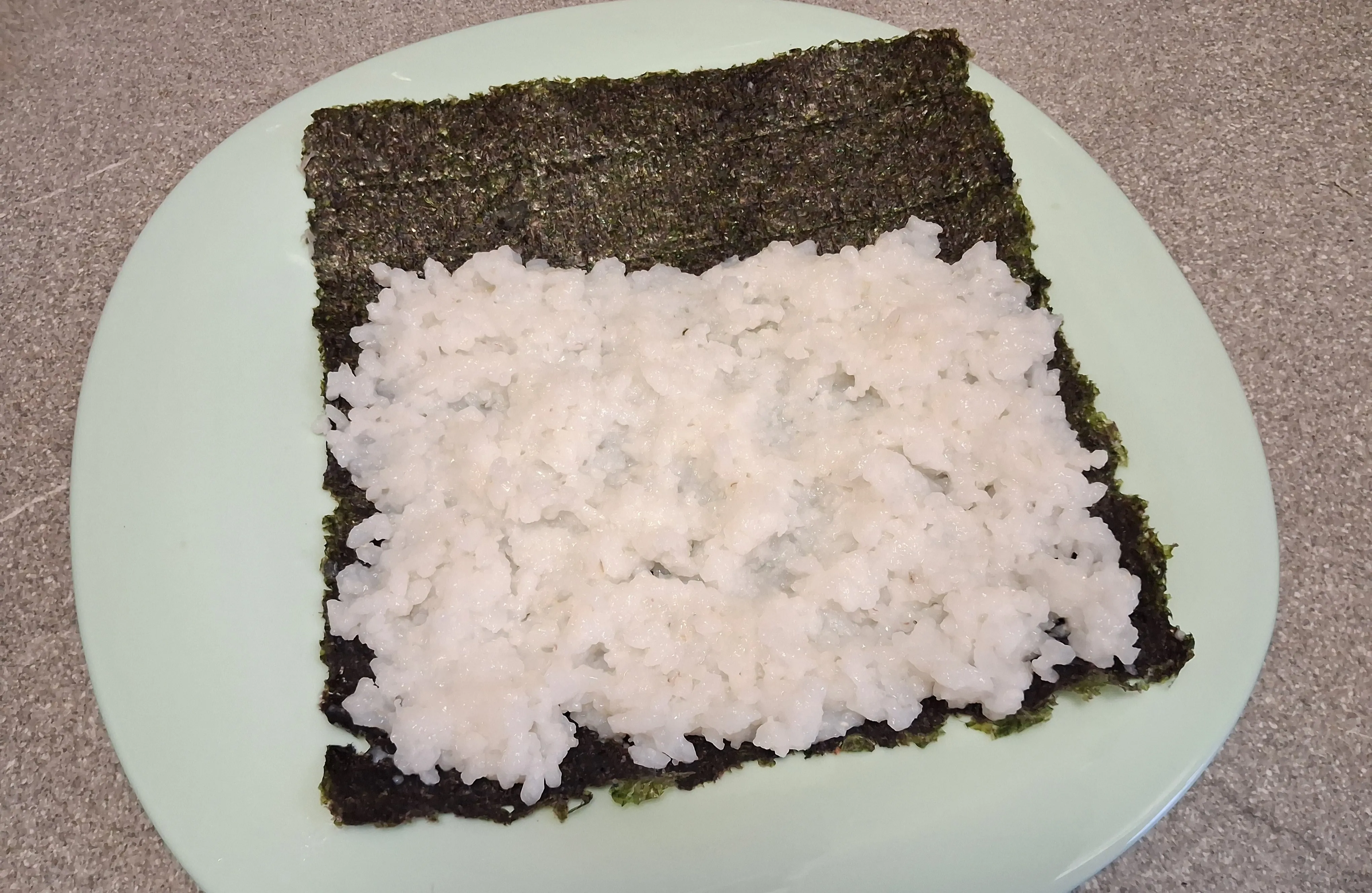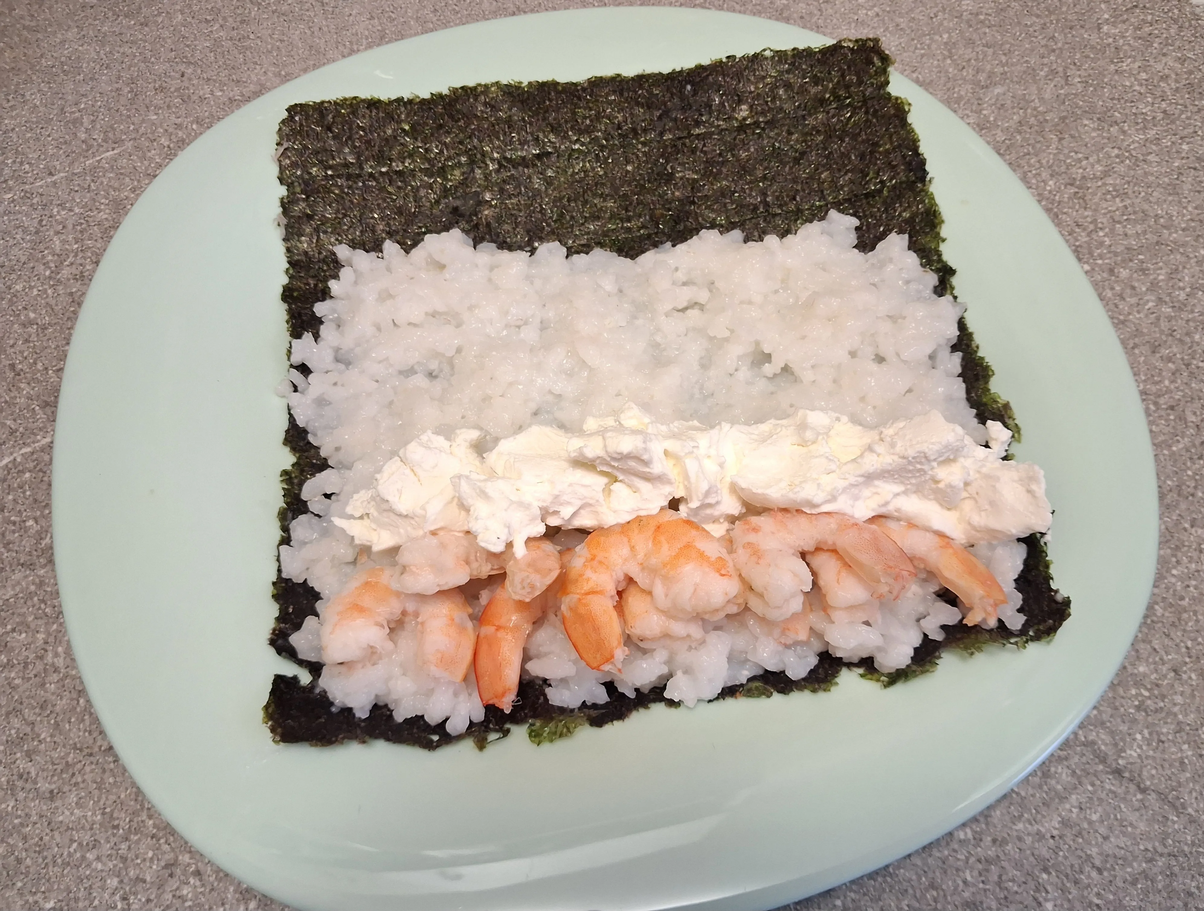 Рис заранее залейте водой и отварите на небольшом огне двадцать минут. Остудите, смешайте с рисовым уксусом и выложите его на лист нори.