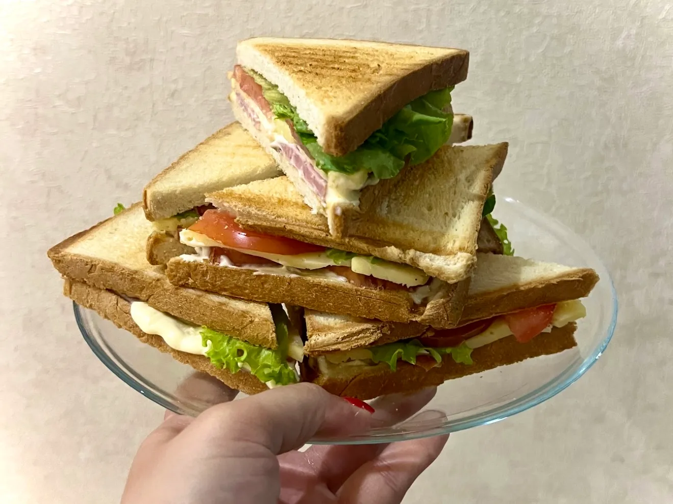 На хлеб намажьте тонким слоем майонез (можно заменить соусом по вашему вкусу), дальше выложите ингредиенты в любом порядке, например, так: ветчина, сыр, лист салата, помидор, огурец.