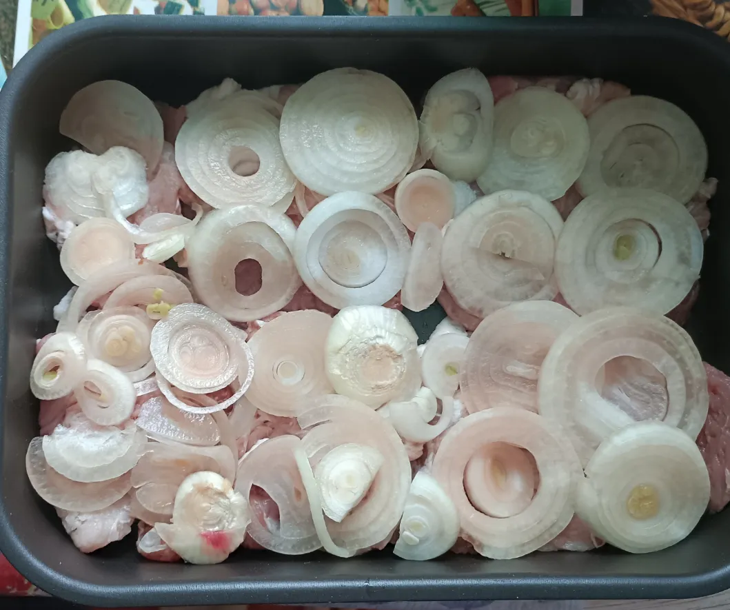 Лук нарежьте кольцами, уложите поверх свинины.