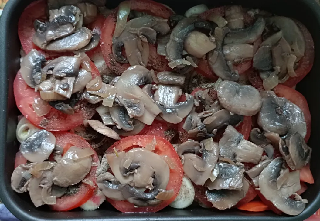 Помойте шампиньоны, нарежьте их произвольно и обжарьте на сковороде. Уложить поверх помидоров.
