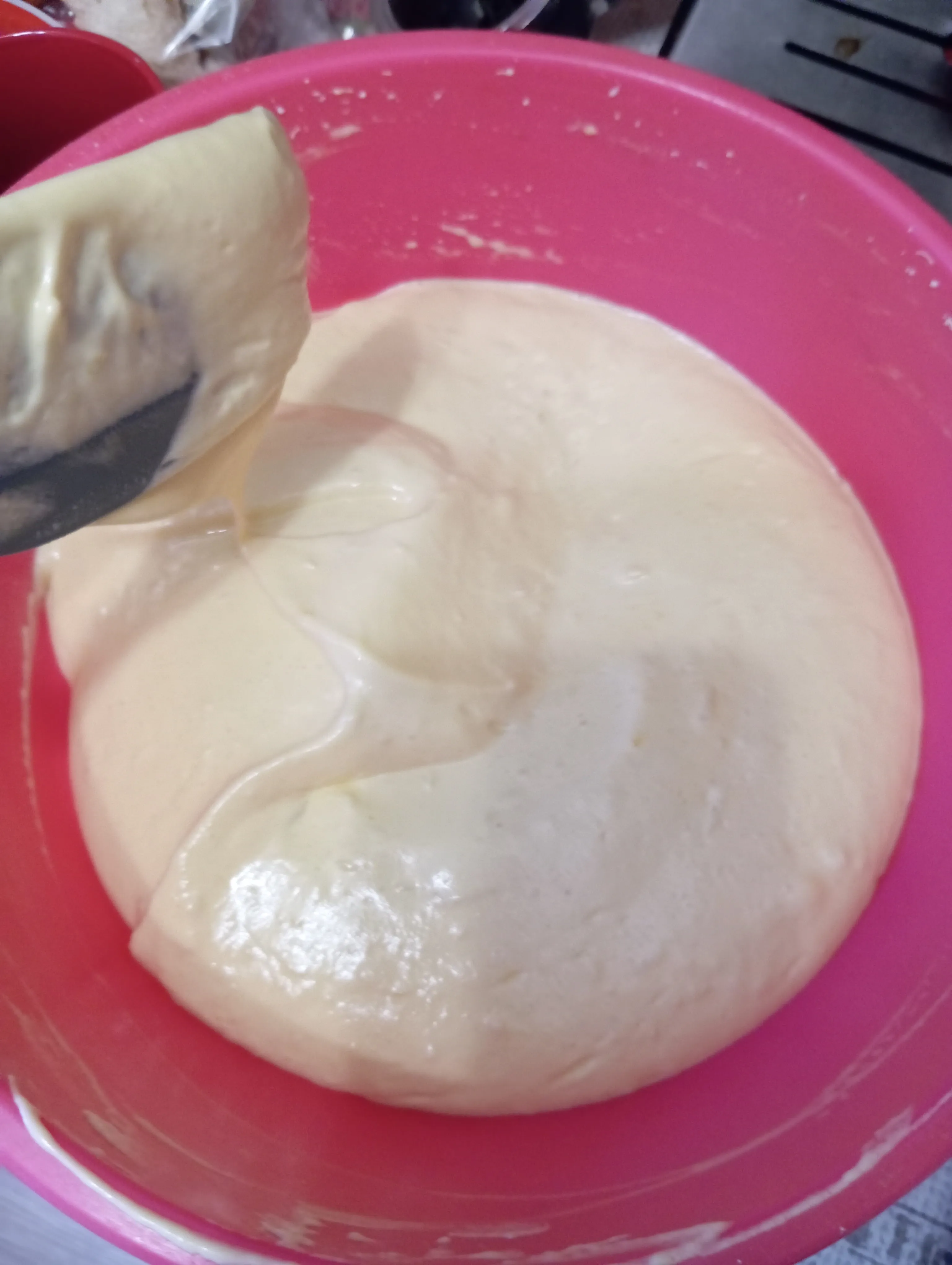 Добавьте муку и вымешивайте лопаткой снизу вверх вручную.