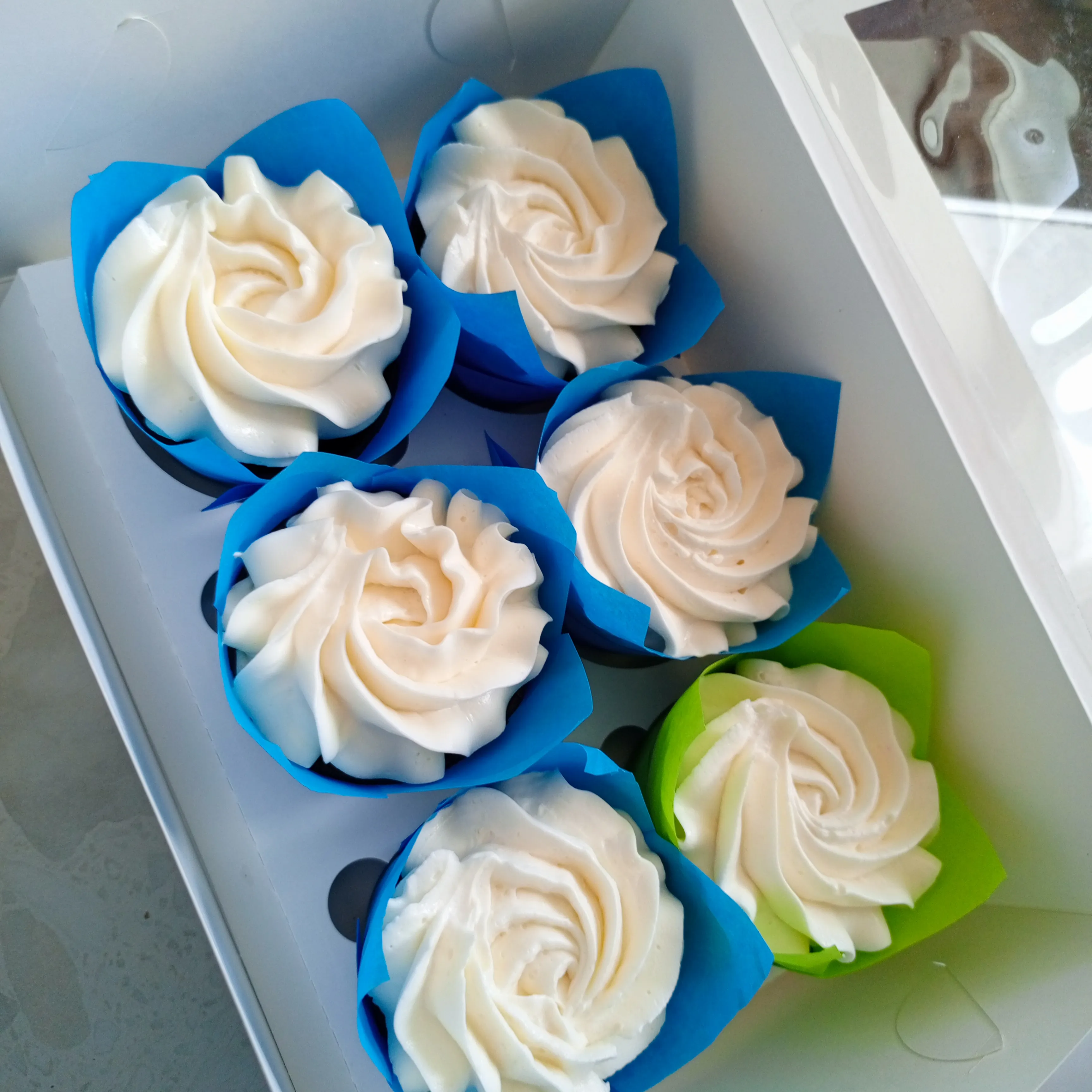 Крем сделайте из творожного сыра, сливок и сахарной пудры. Все взбивайте до пиков. Переложите в кондитерский мешок с насадкой и украсьте капкейки.