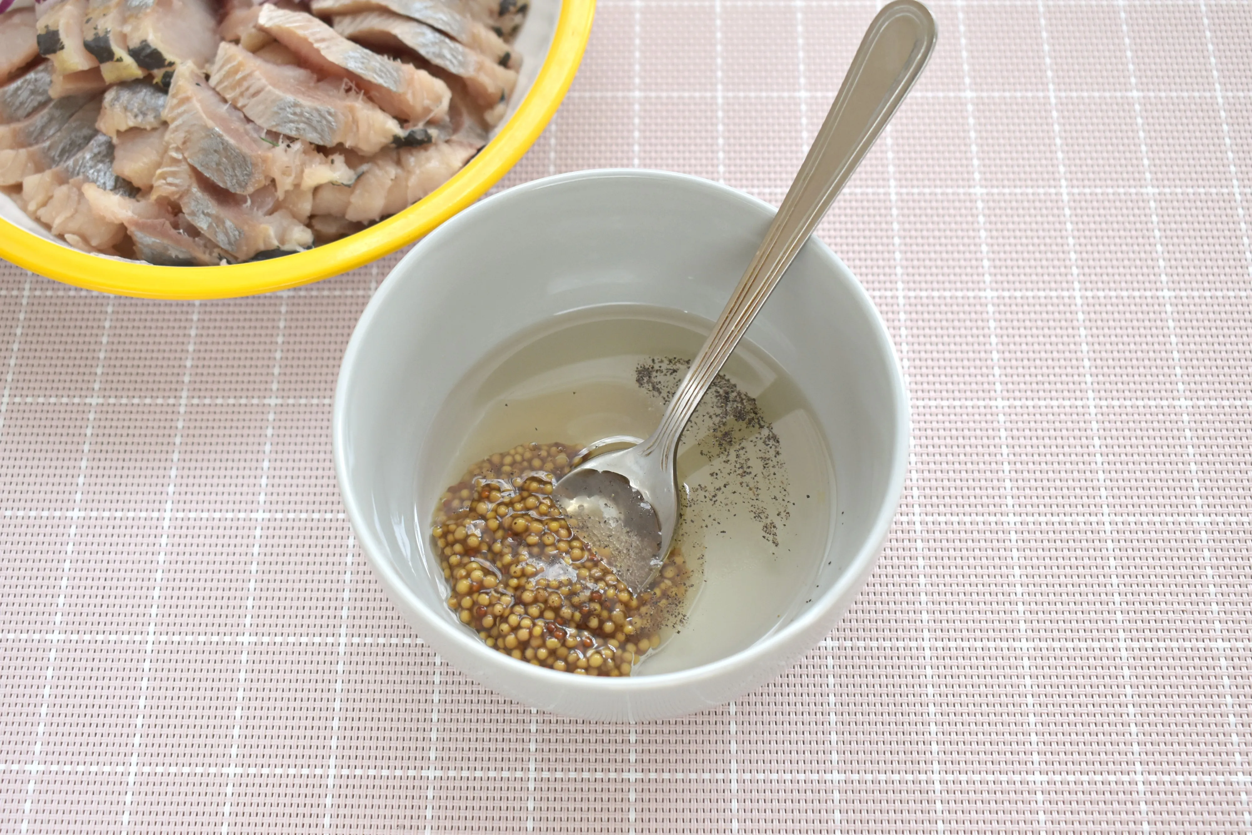 Получившуюся заправку влейте к рыбе и хорошо перемешайте.