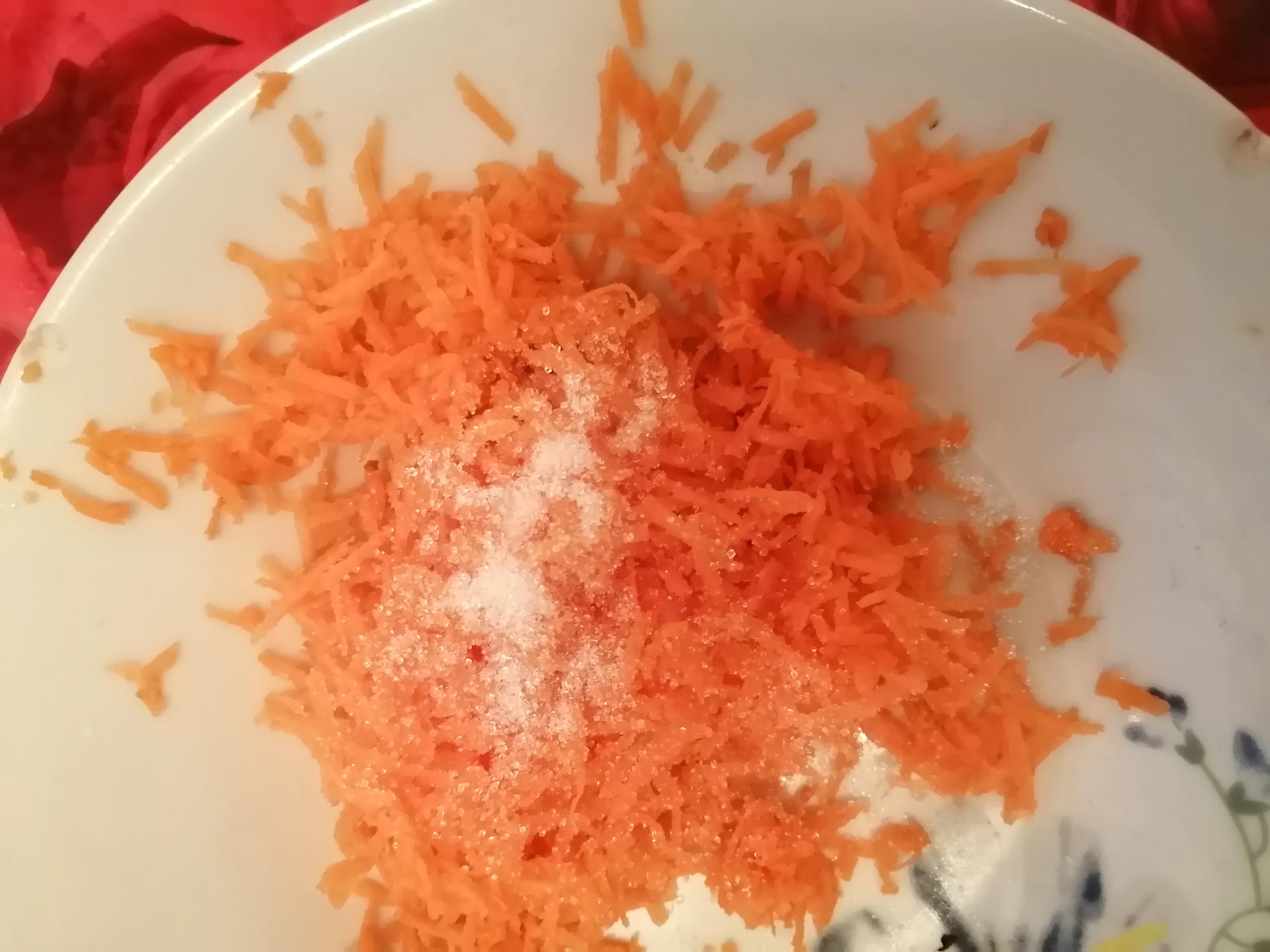 Морковь натрите на мелкой тёрке. Добавьте сахар.