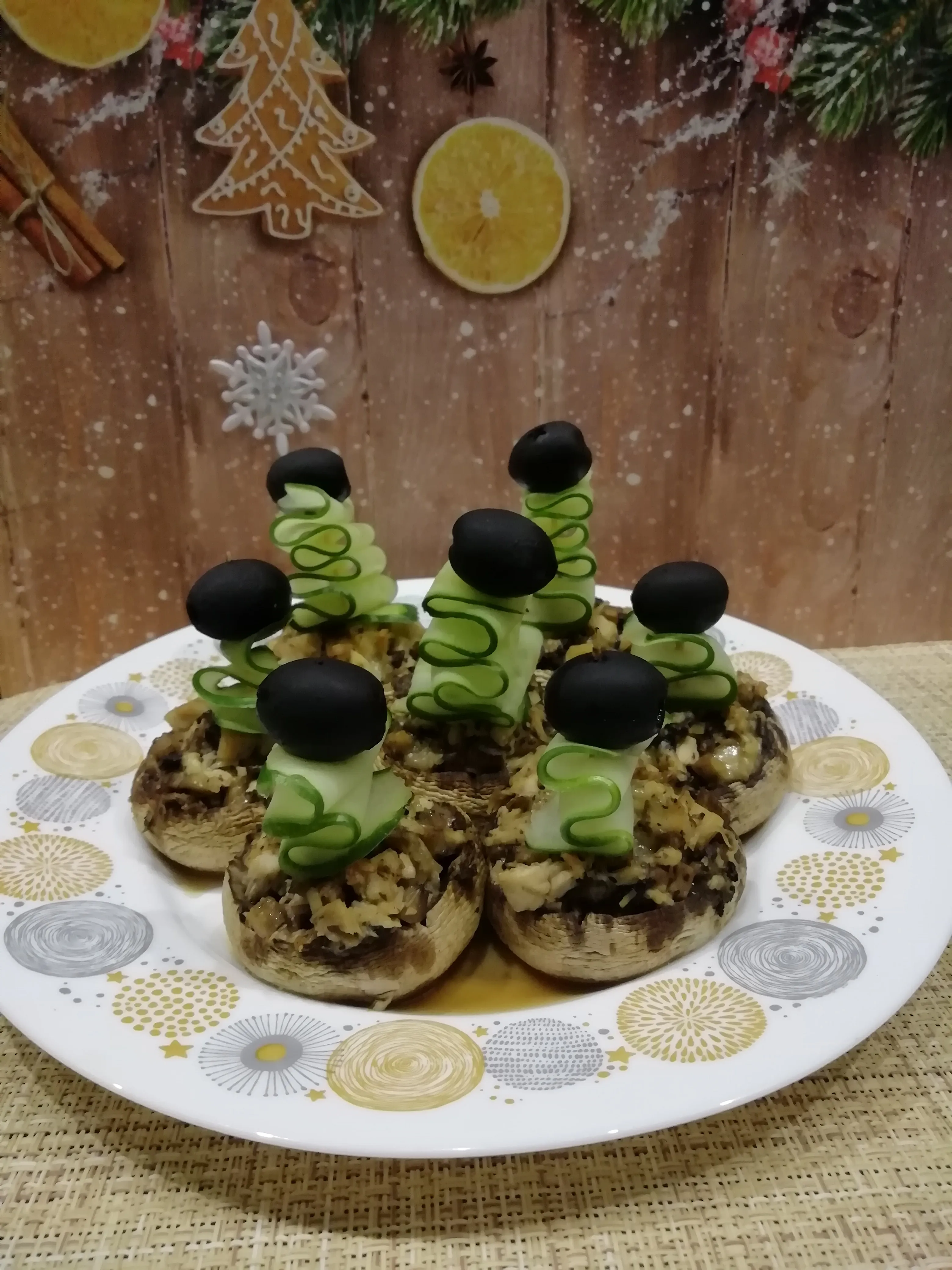Тем, кому снега зимой не досталось, понравится рецепт с фаршированными шампиньонами. Из курицы получится отличный «сугроб» — одеяло грибам и сыру. Ёлочки помогут создать новогоднее настроение!