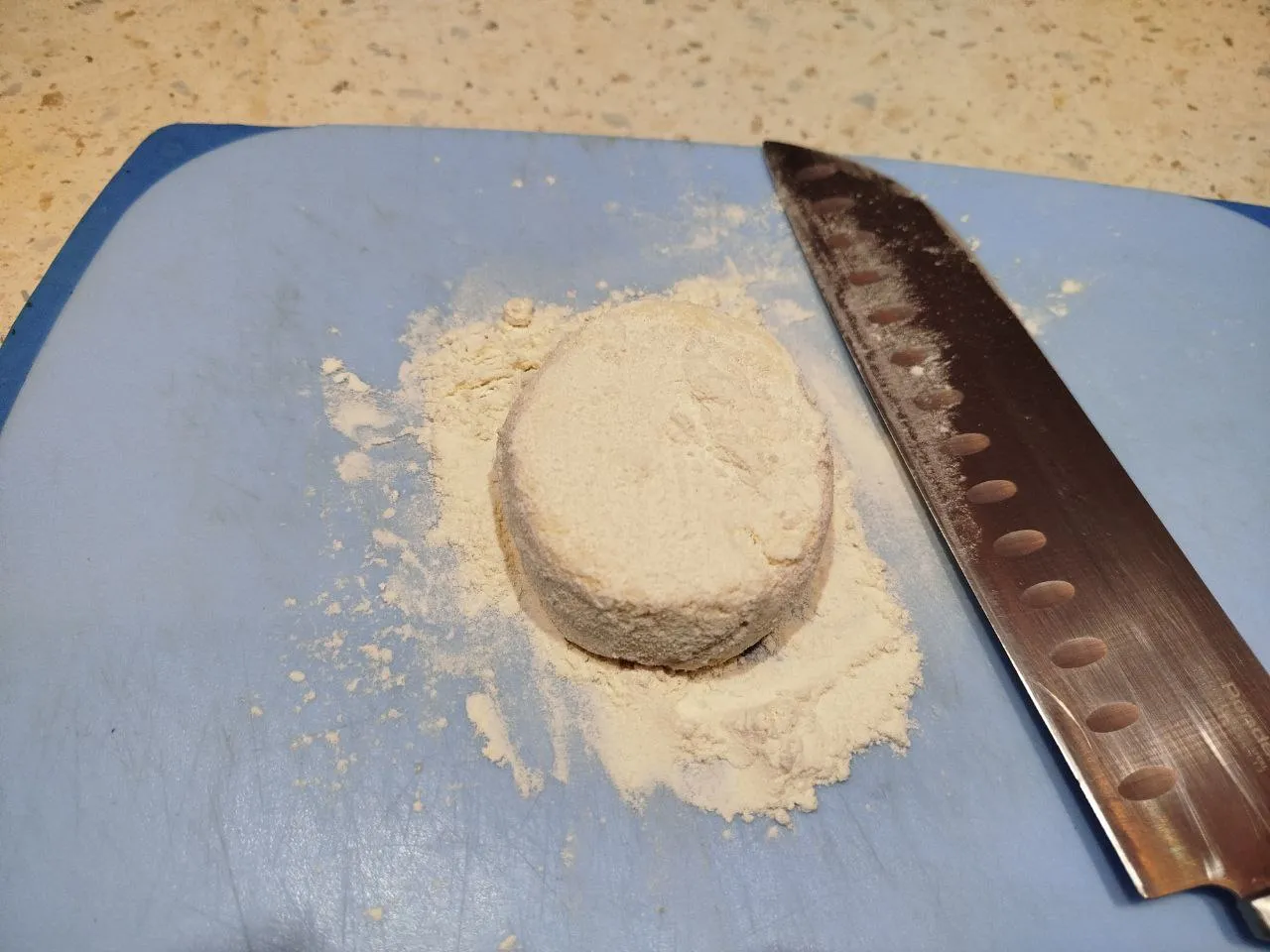 Сформируйте с помощью ножа с широким лезвием на кухонной доске, присыпанной мукой, сырник в форме медальона. На один сырник используйте две столовых ложки теста. Количество муки для формовки сырников — приблизительно 3-4 столовых ложки.