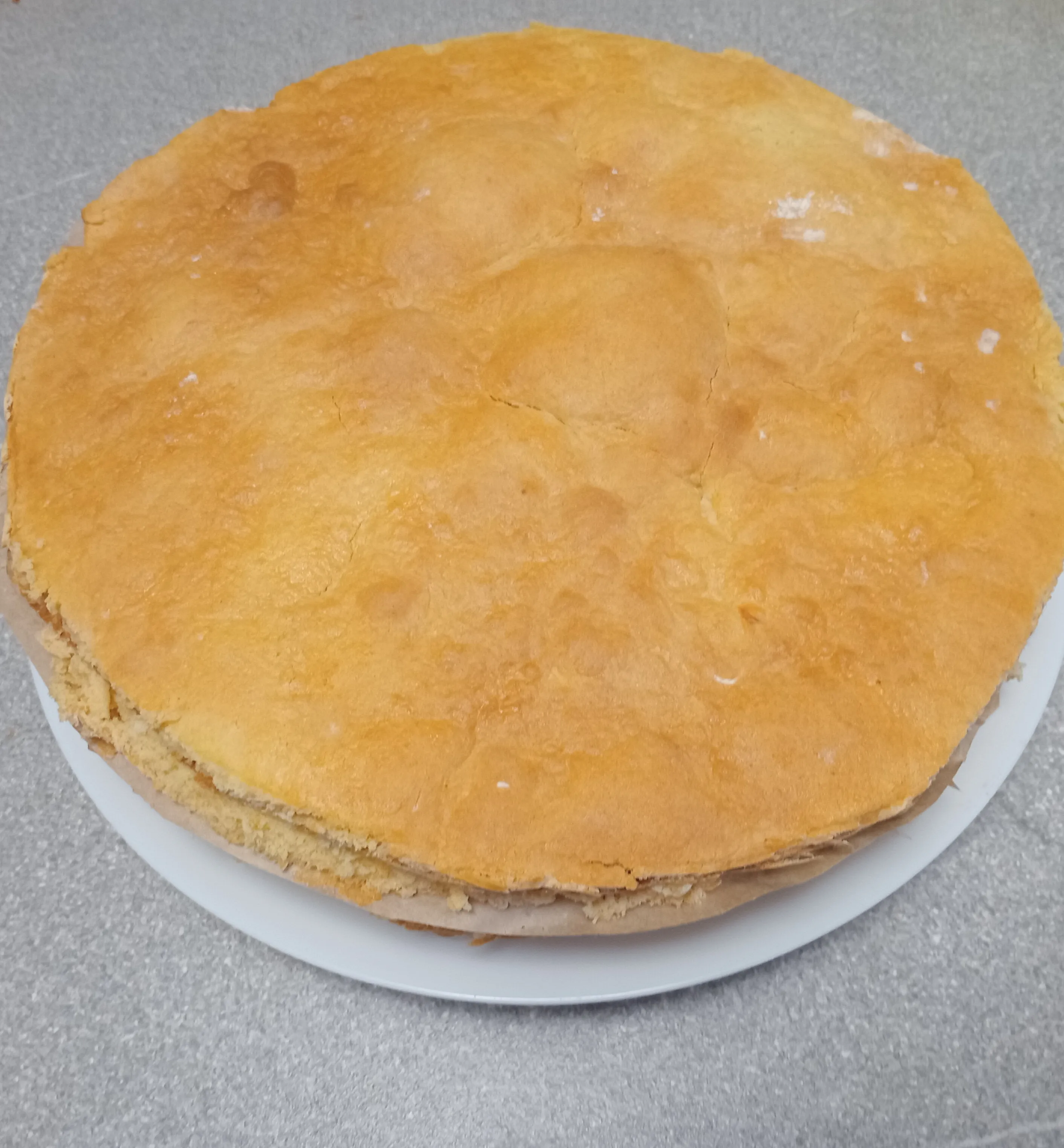 Тесто разделите примерно на 10 частей. Каждую часть тонко раскатайте на пергаментной бумаге. Выложите в форму и выпекайте каждый корж примерно по две минуты при температуре 180°C.