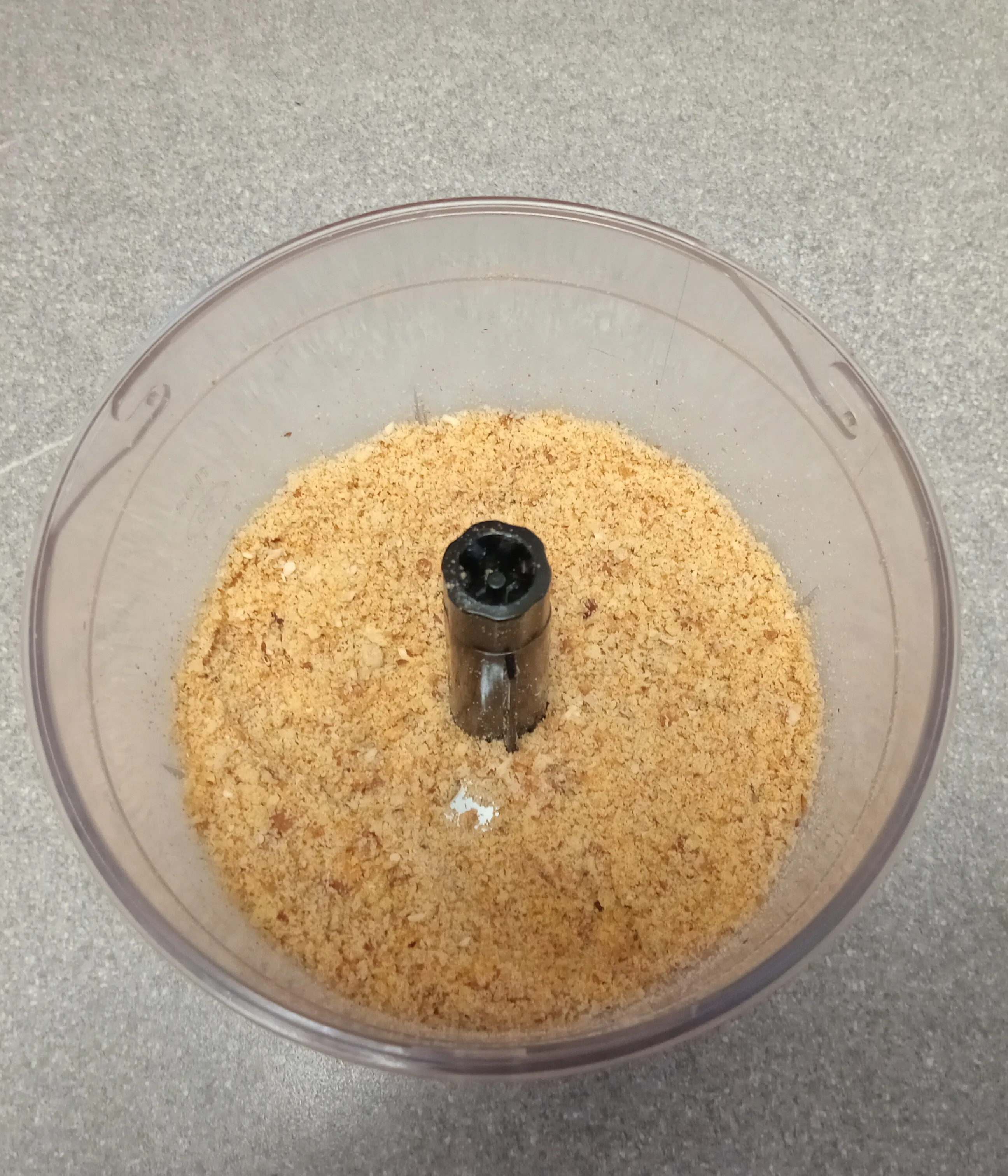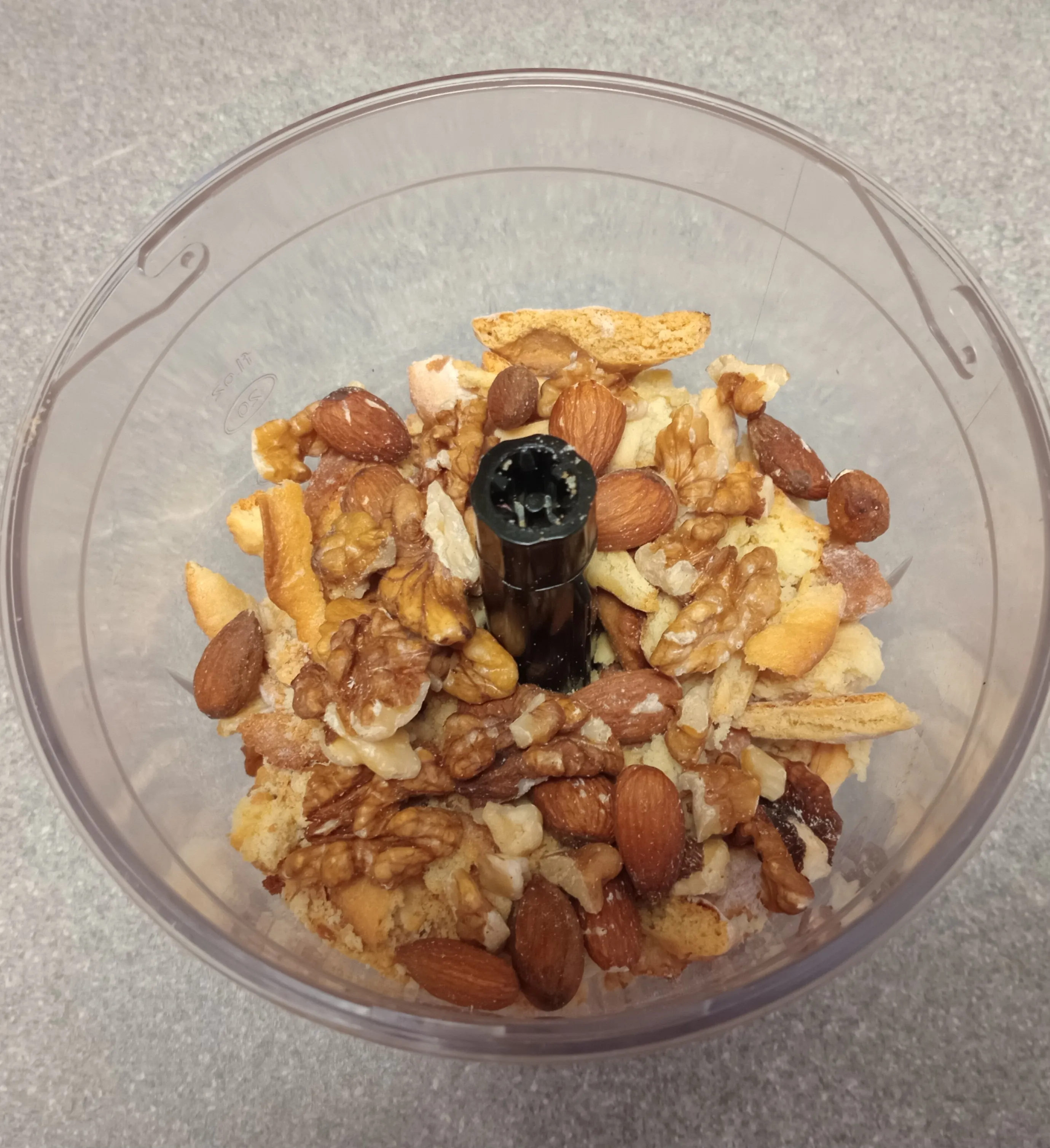 В чашу блендера выложите обрезки коржей, миндальные и грецкие орехи.