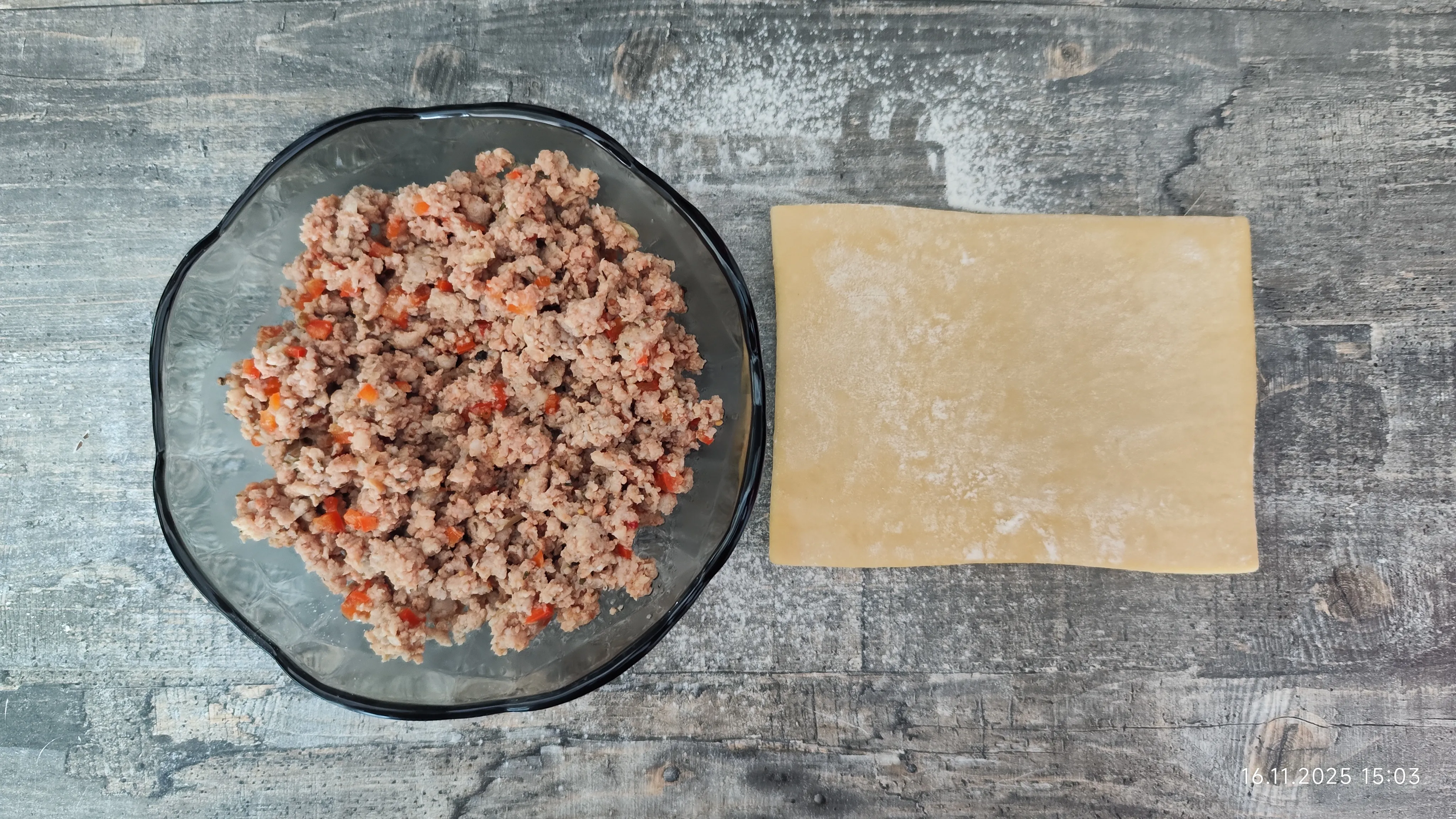 Приготовьте начинку. Обжарьте фарш с луком, томатной пастой и любимыми специями.