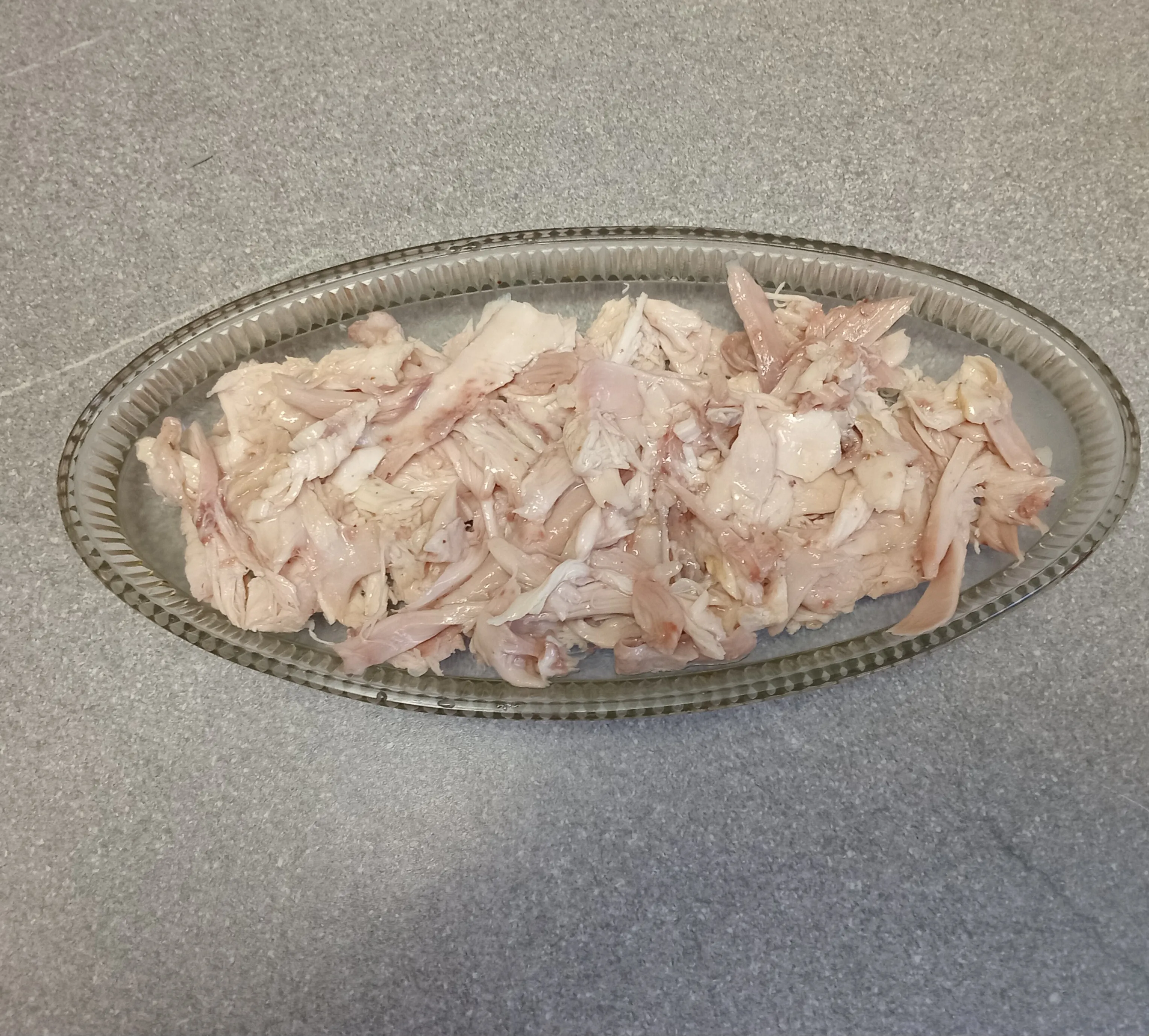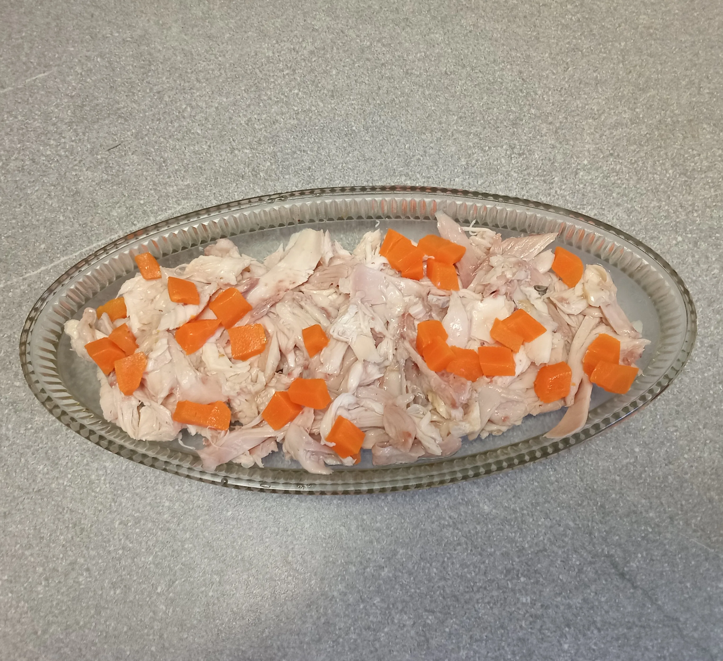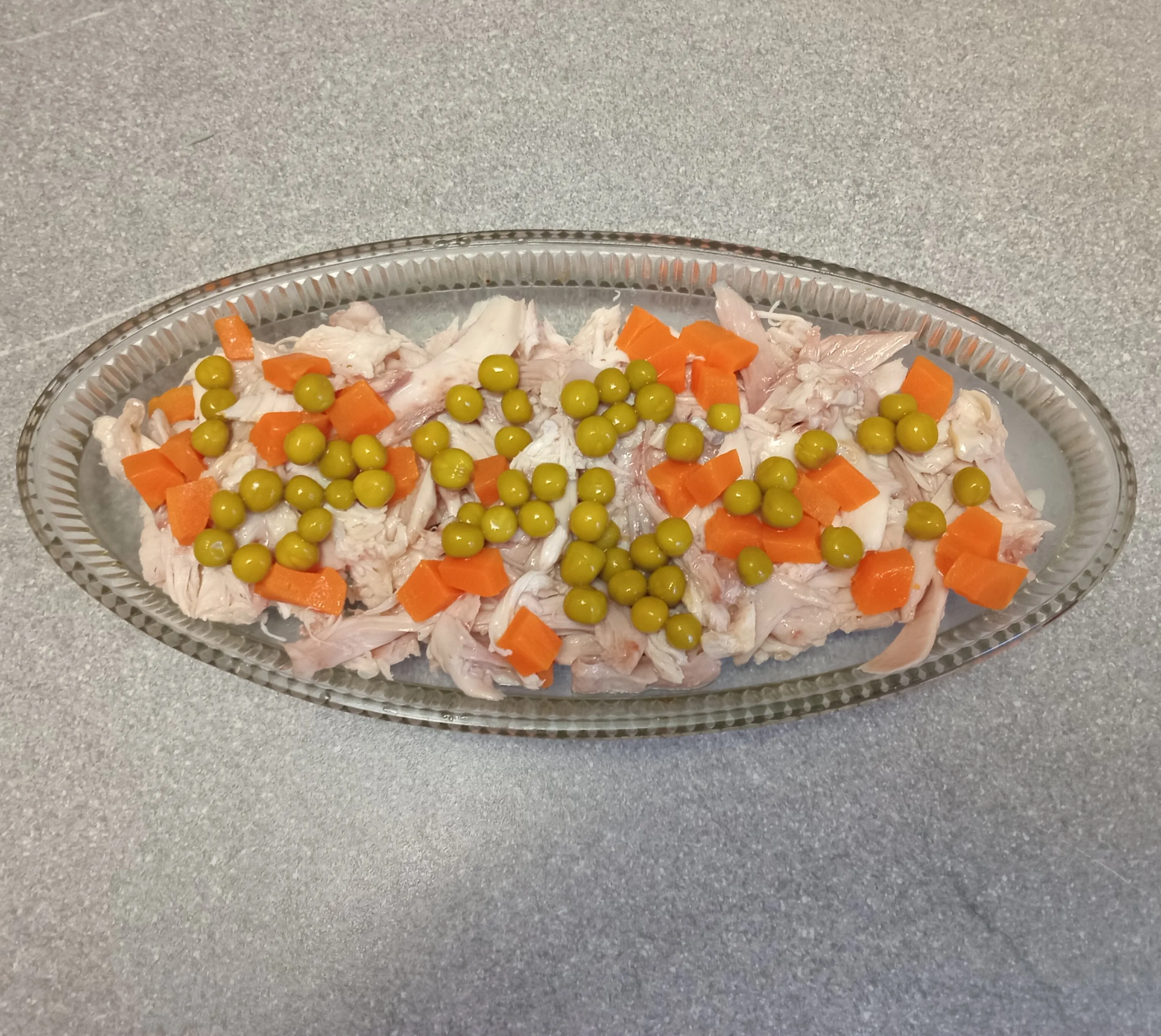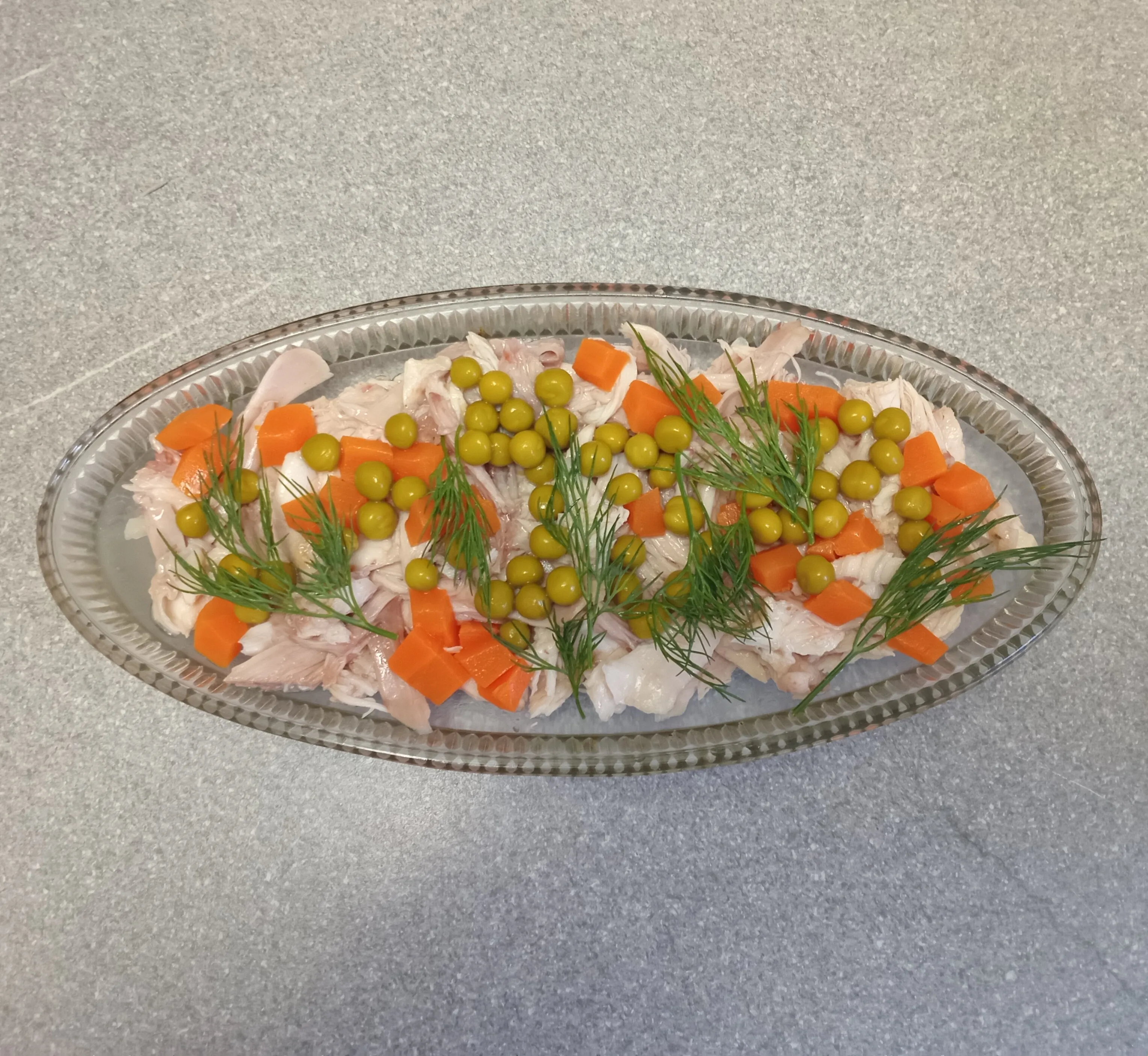 Варёное куриное филе нарежьте и выложите в форму.