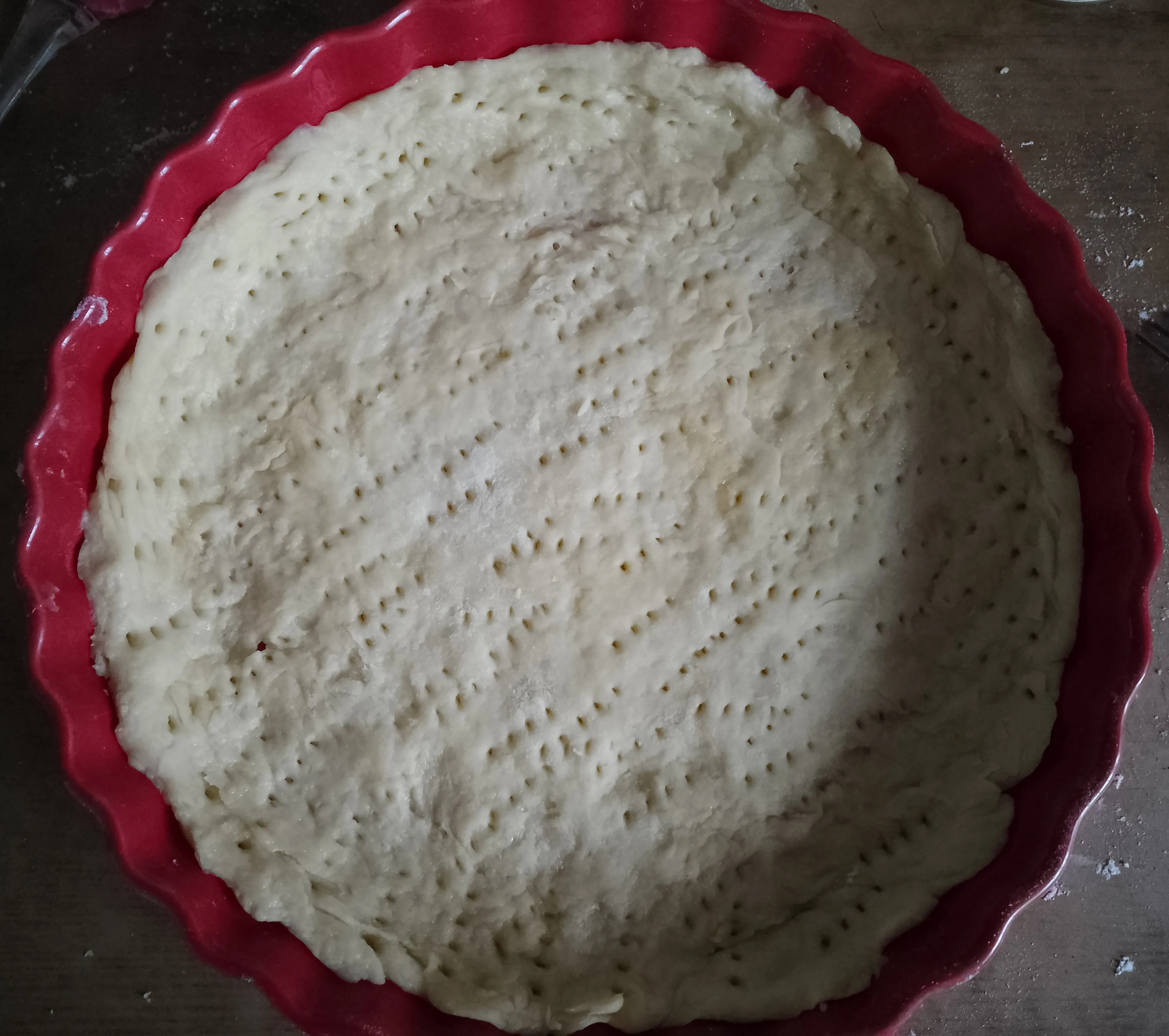 Достаньте тесто из холодильника, немного раскатайте, переложите в форму и руками сформируйте бортики. Затем заготовку проколите вилкой и уберите в морозилку на 10 минут.