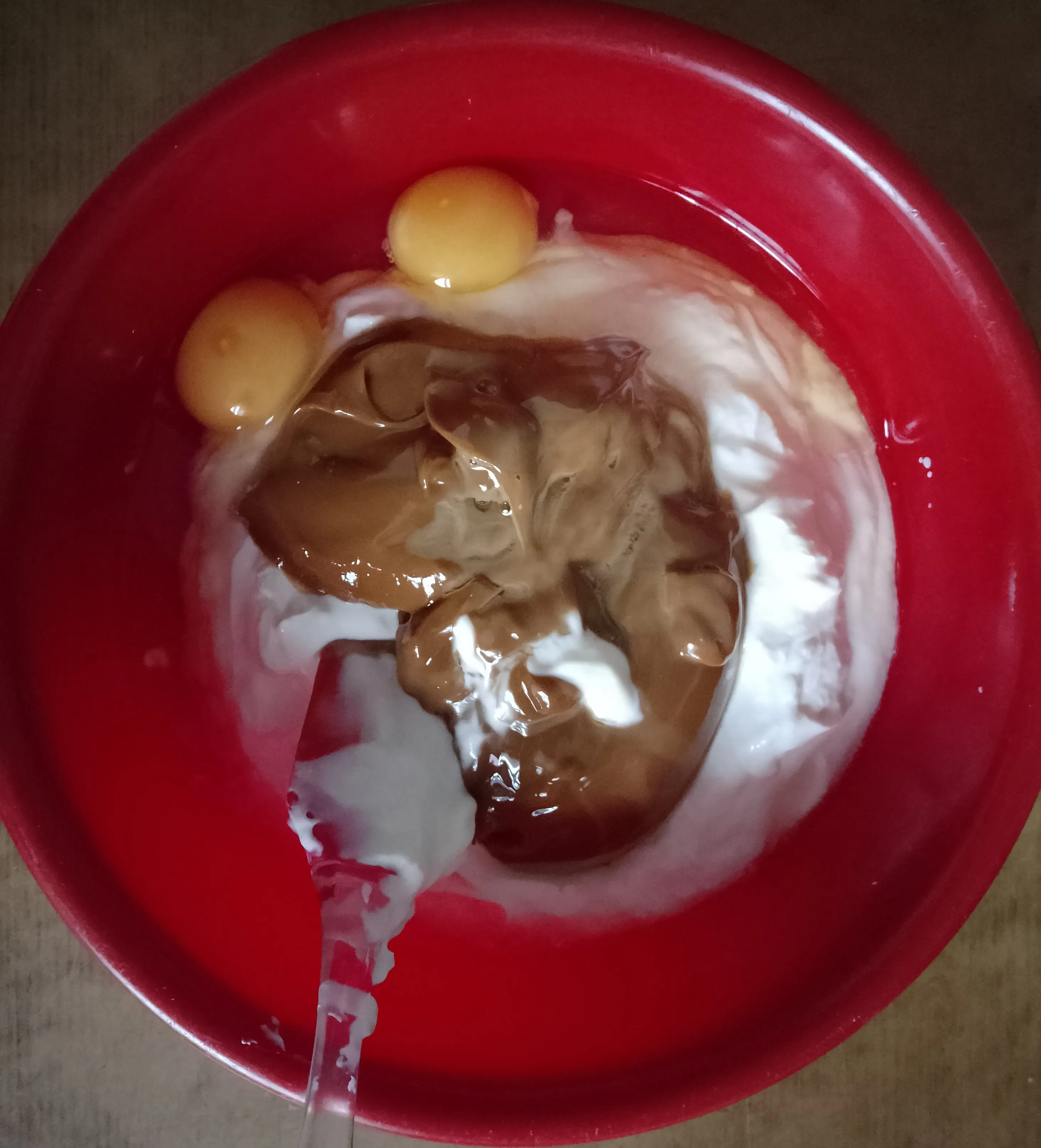 Для заливки в сметану добавьте варёную сгущенку и два яйца. Все хорошо перемешайте до однородности.
