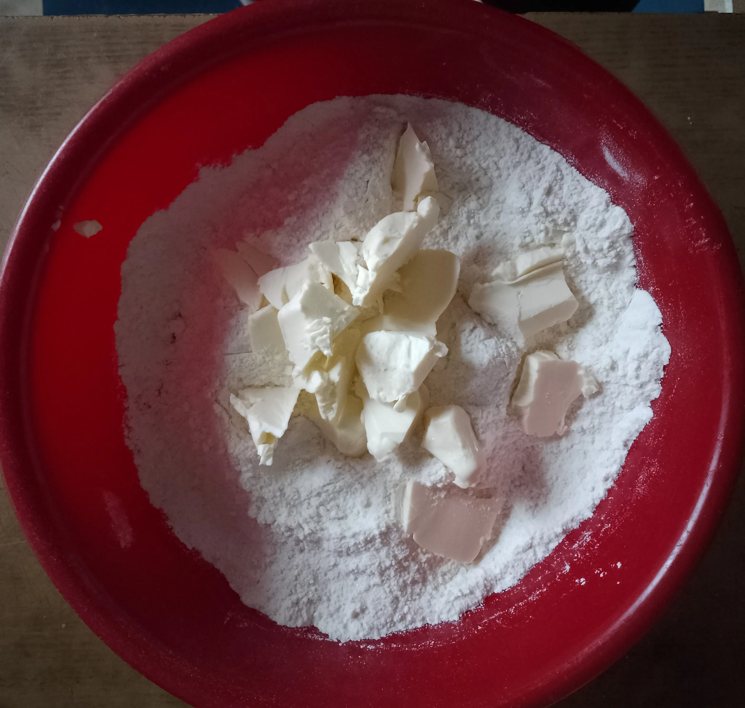 Смешайте в ёмкости муку, щепотку соли, разрыхлитель и сахар, добавьте холодное сливочное масло. Руками перетрите всё в крошку.
