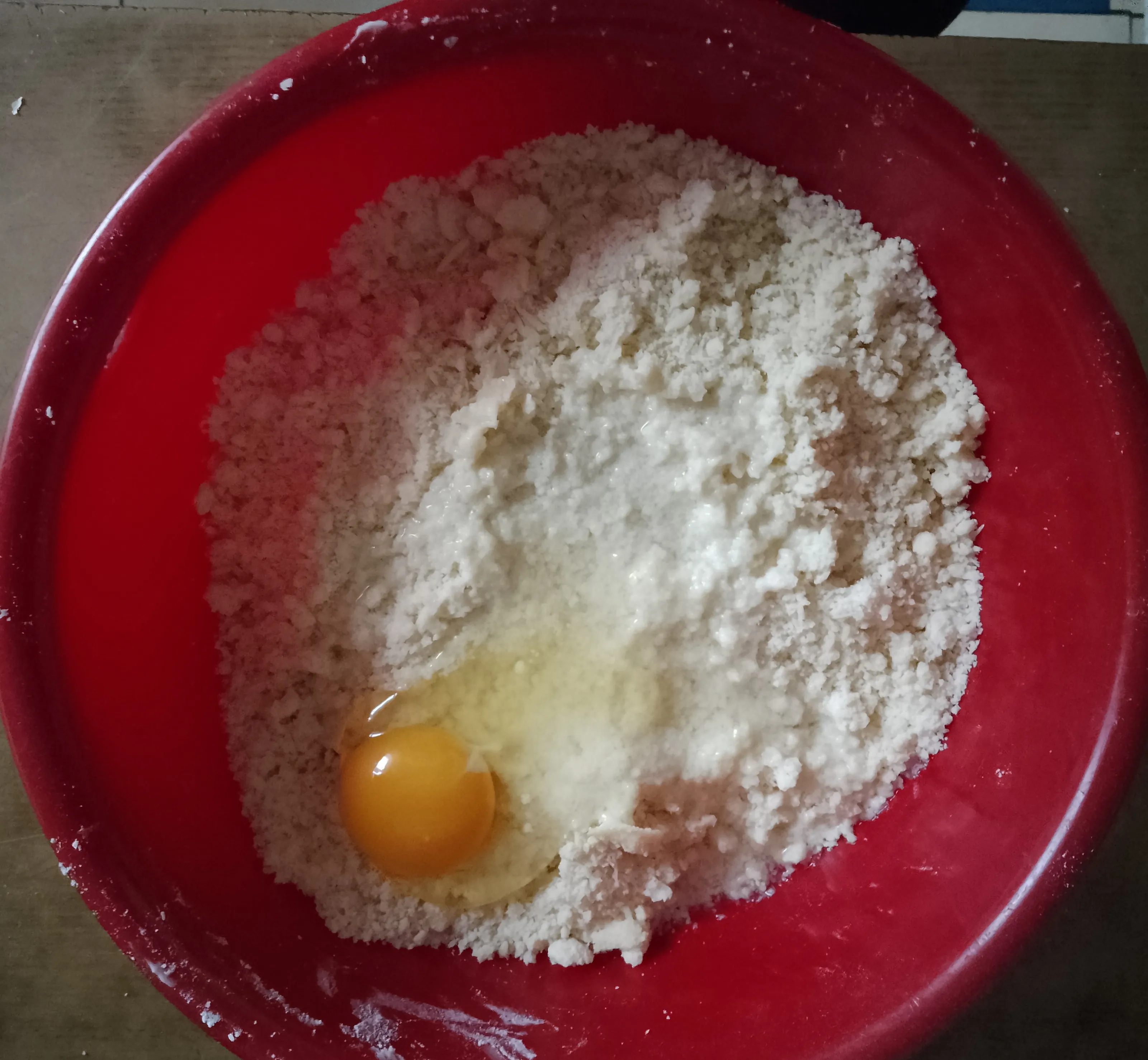 Затем в крошку вбейте одно яйцо, добавьте воду и замешайте мягкое тесто.