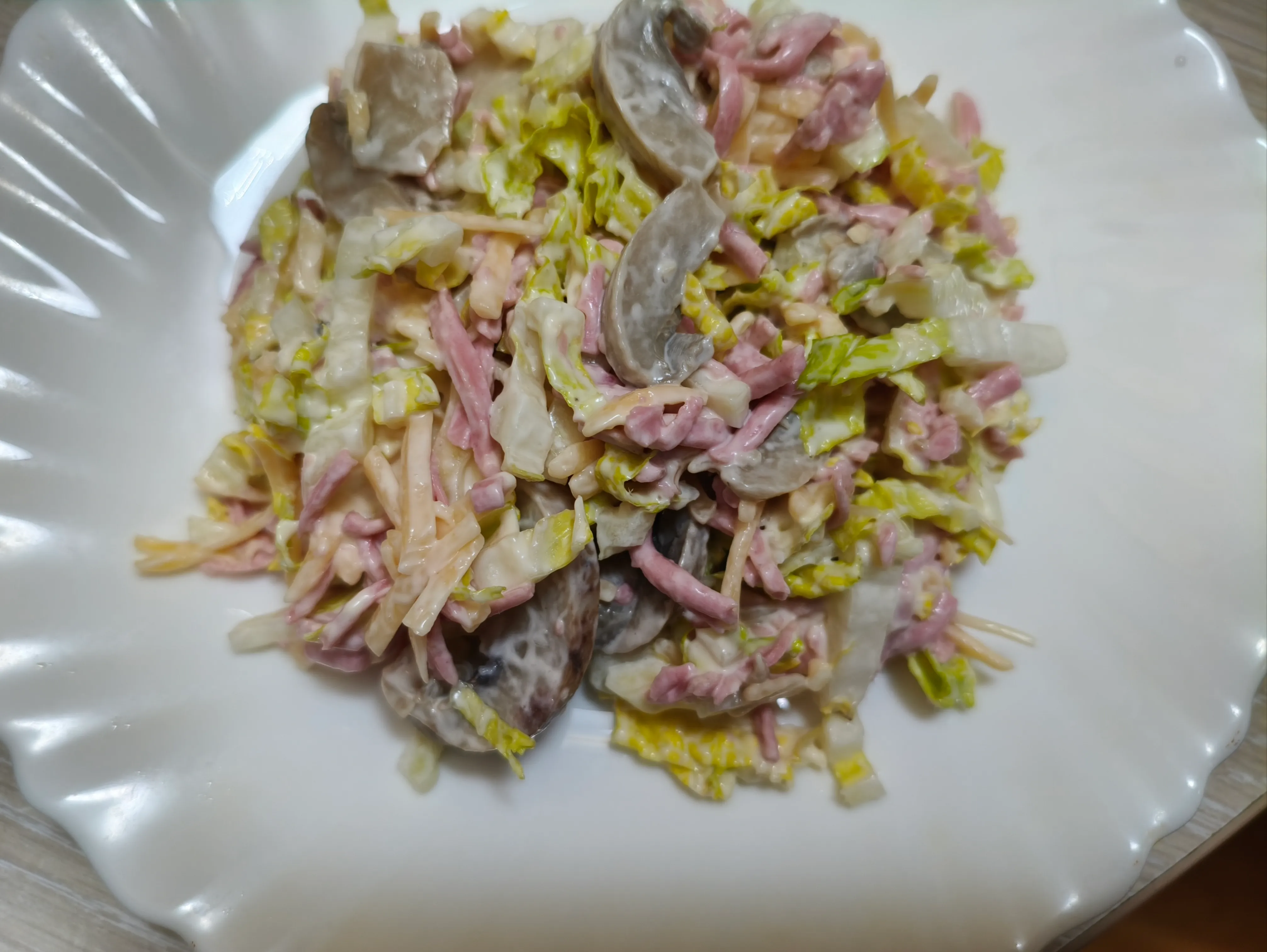 Универсальность этого салата заключается в том, что можно использовать как обжаренные шампиньоны, так и консервированные. Варёную колбасу можно заменить на копчёную или ветчину — в любом случае будет вкусно благодаря хрустящей пекинской капусте, сыру и немного острому привкусу чеснока.