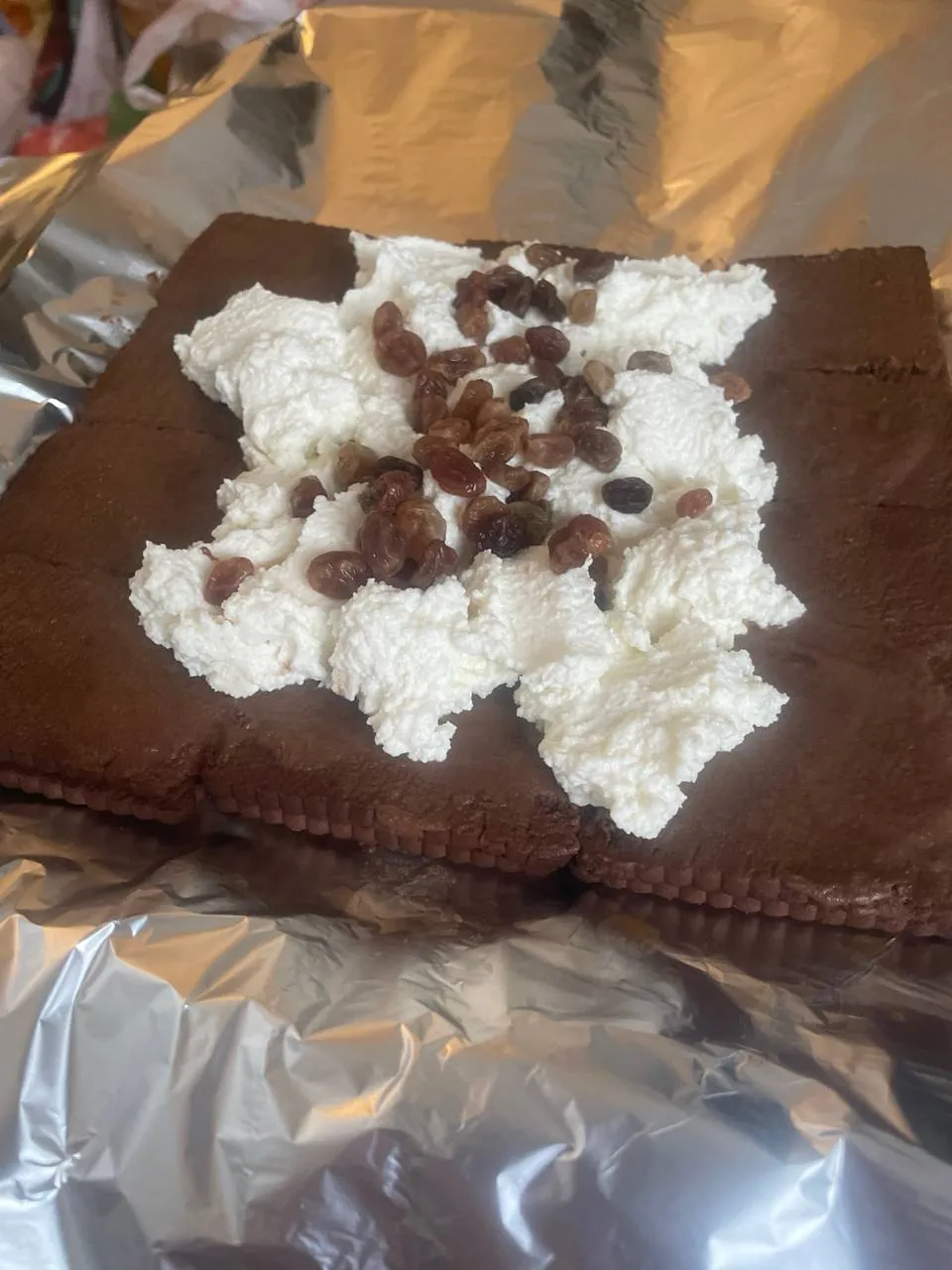 Выложите крем, полностью покрывая центральный «столбец» печений и частично заходя на соседние. Аккуратно слейте воду с изюма. Добавьте изюм в предполагаемый центр будущего десерта.