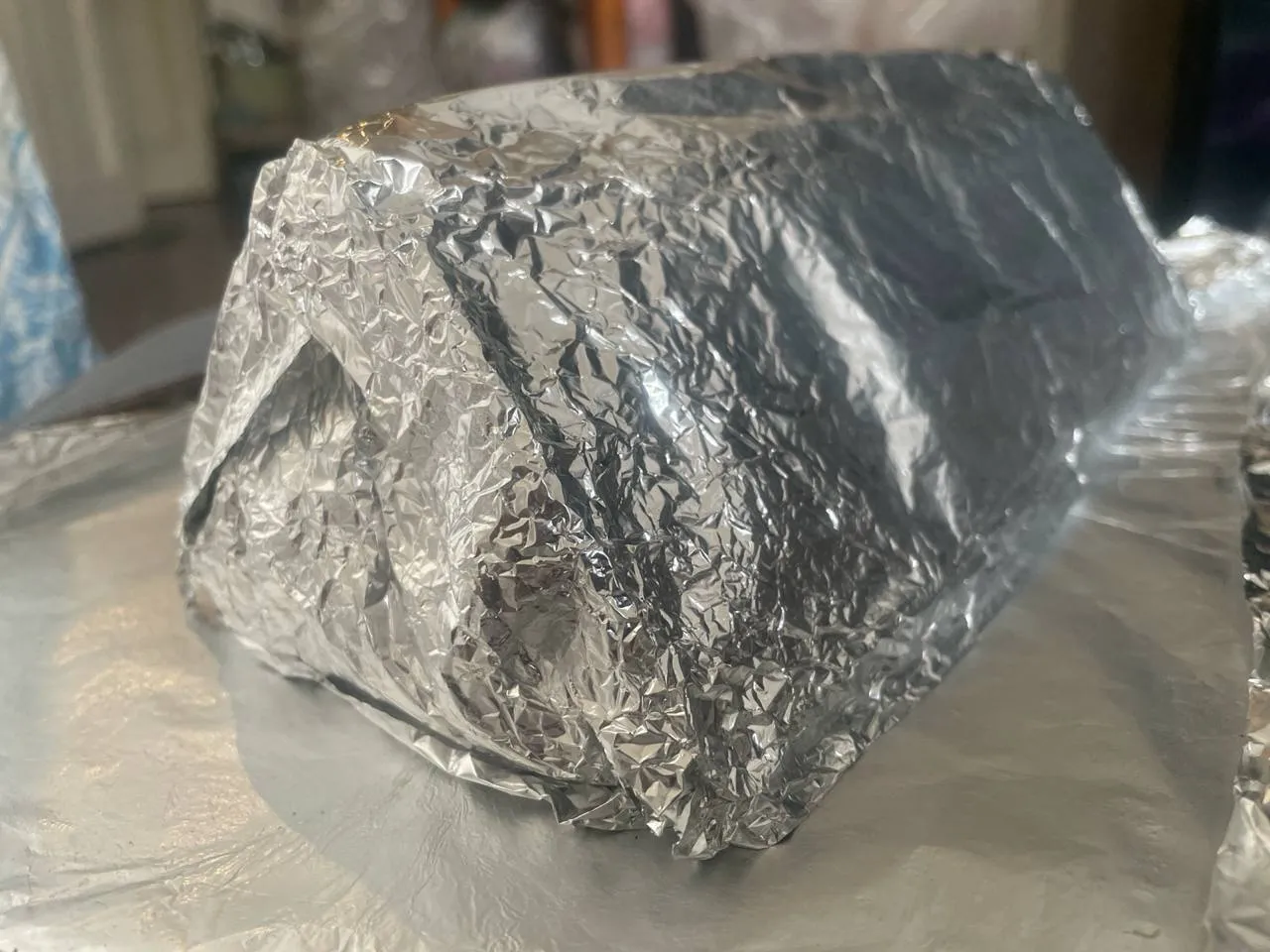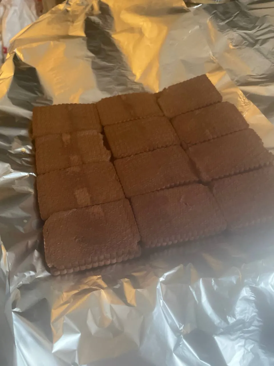 На ровной поверхности расстелите квадрат фольги или пищевой плёнки стороной около 45 см. Выложите 12 печений в четыре ряда по три штуки, широкой стороной вдоль ряда. Обильно смачивая остальные, поместите их вторым слоем, повторяя узор.