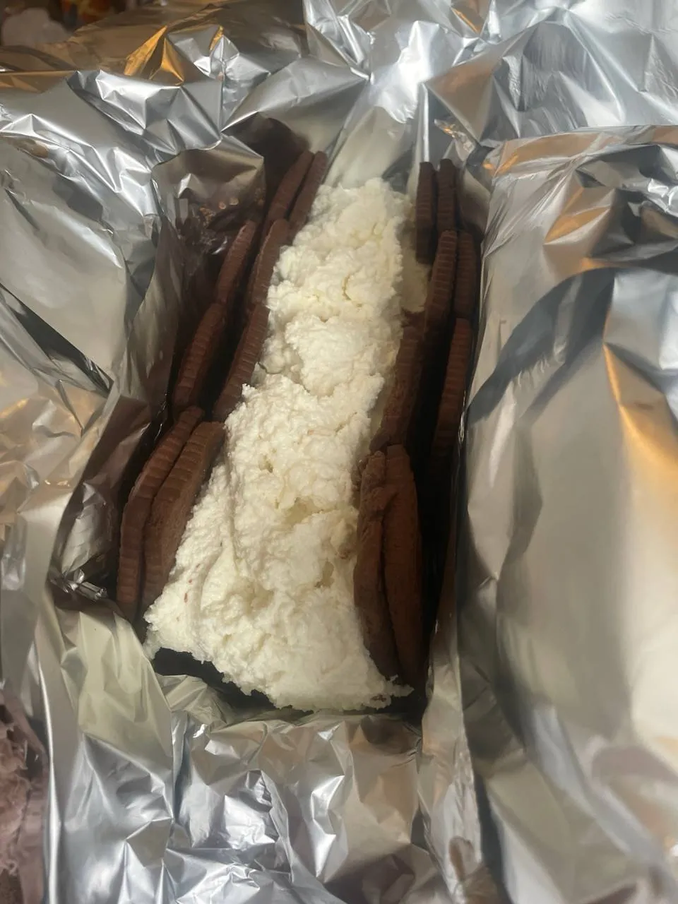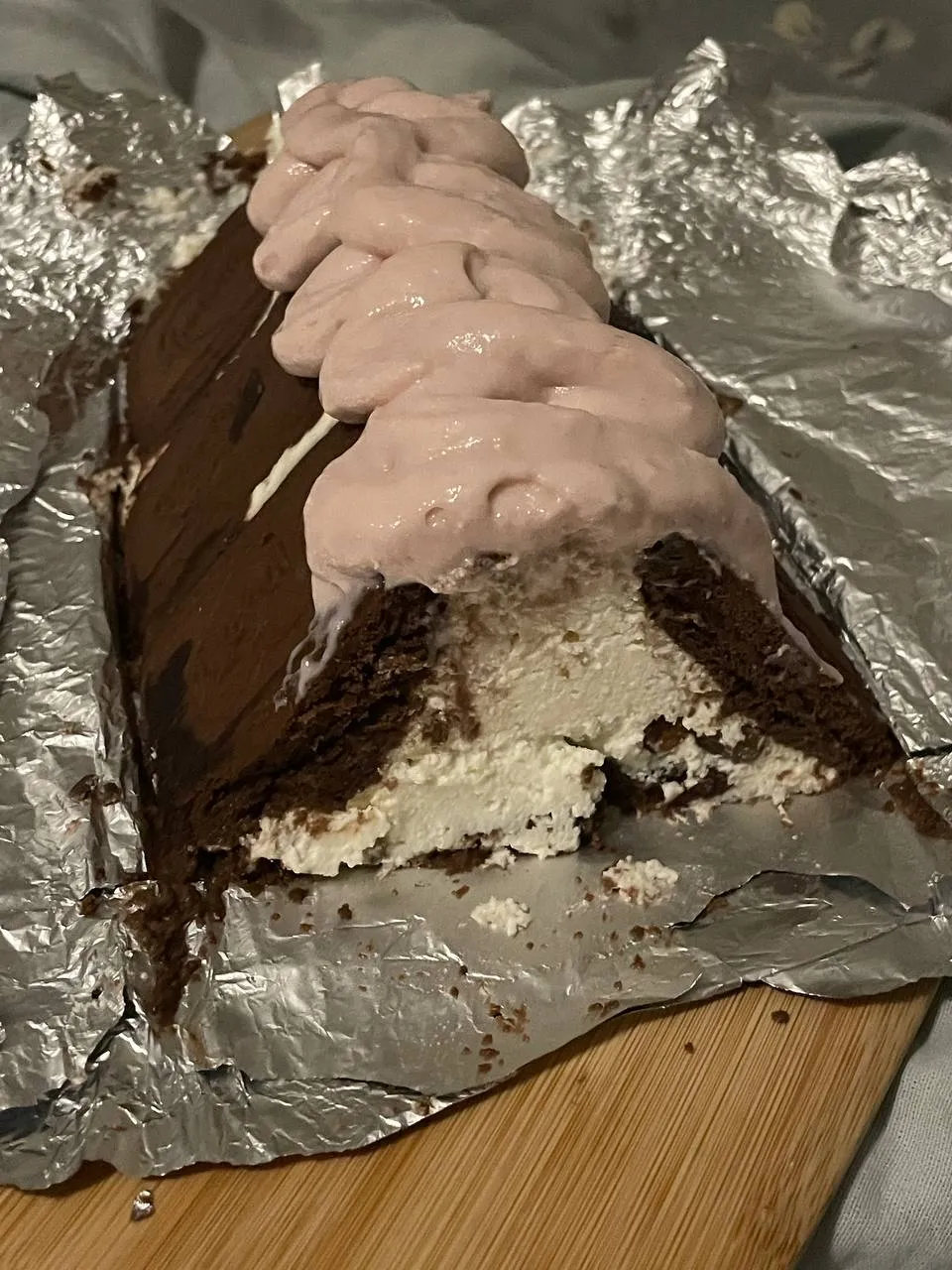 Запакуйте десерт так, чтобы он держал форму, дайте настояться в холодильнике в течение часа. Будет лучше, если есть возможность дать ему пропитаться целую ночь. Внутренний слой печенья превратится в нежнейший крем, начинка застынет и легко поддастся ножу.