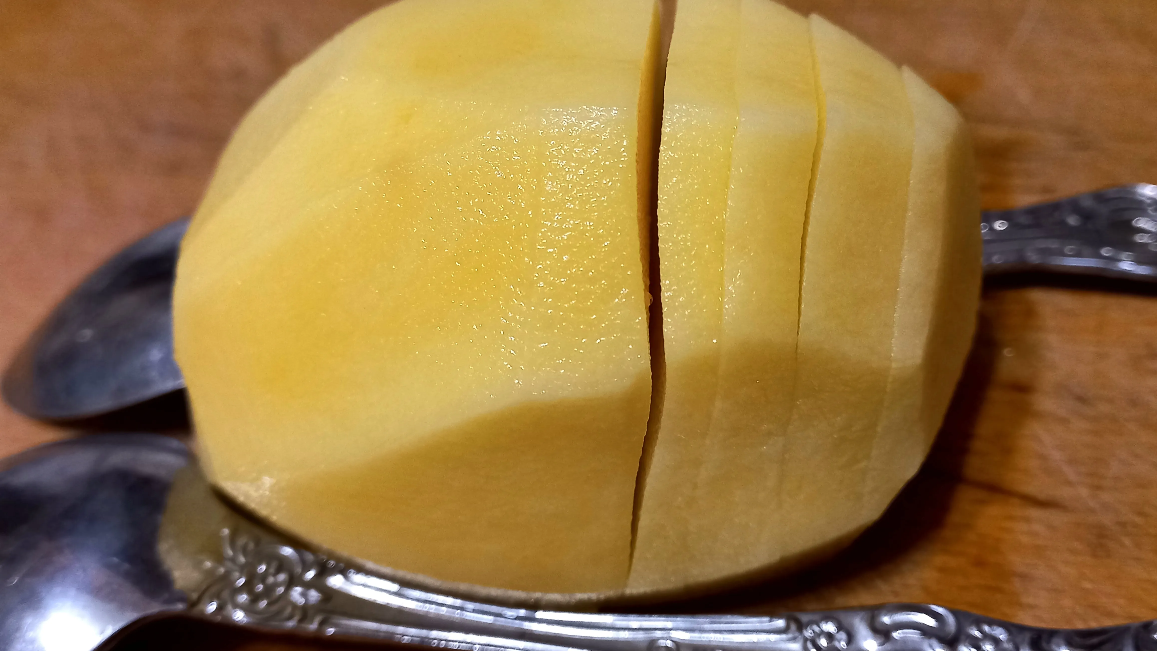 Картофель, не дорезая до конца, нарежьте тонкими ломтиками. По бокам картофеля подложите чайные ложки, тогда нож не прорежет насквозь — получится красивая «гармошка».