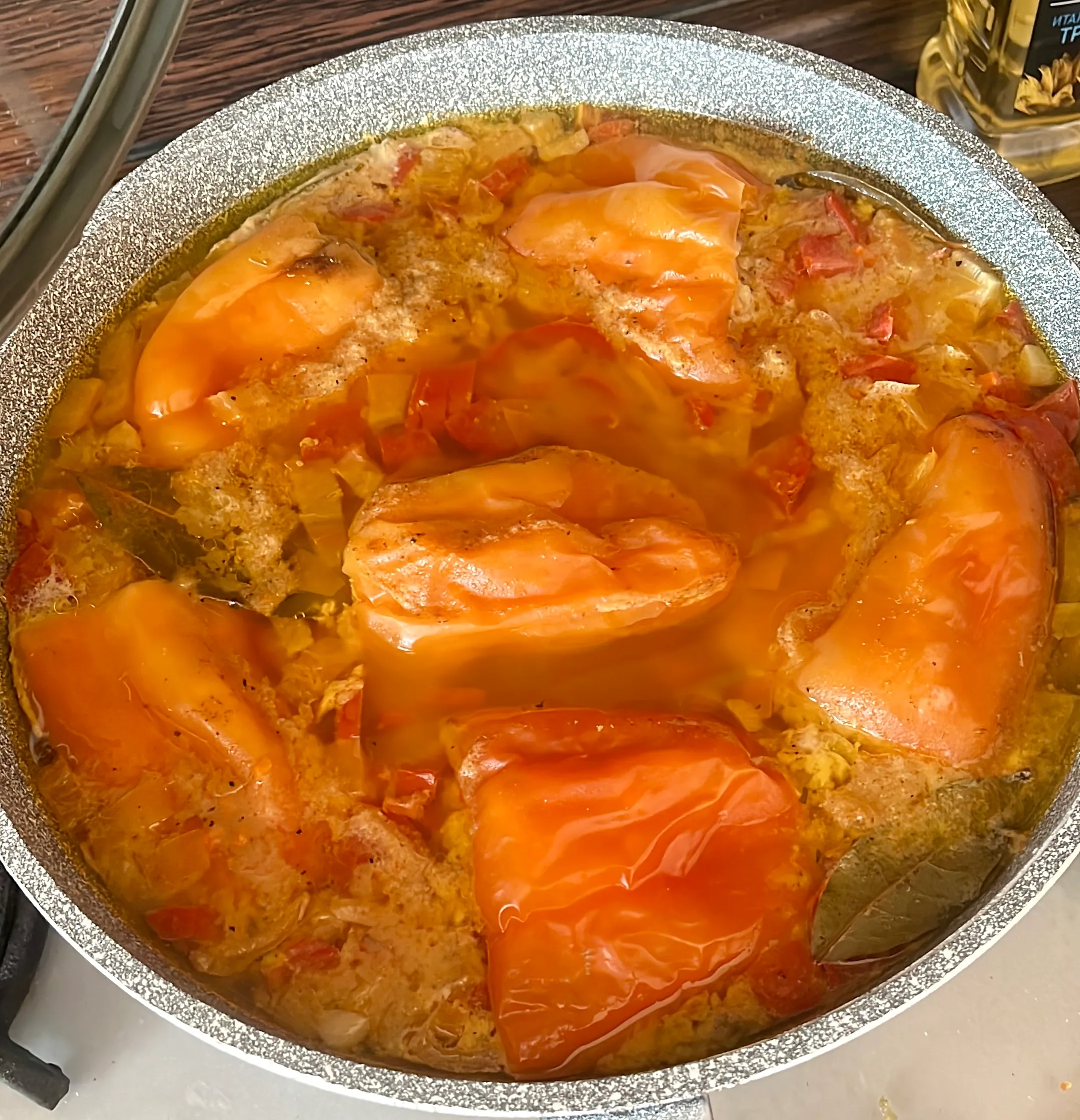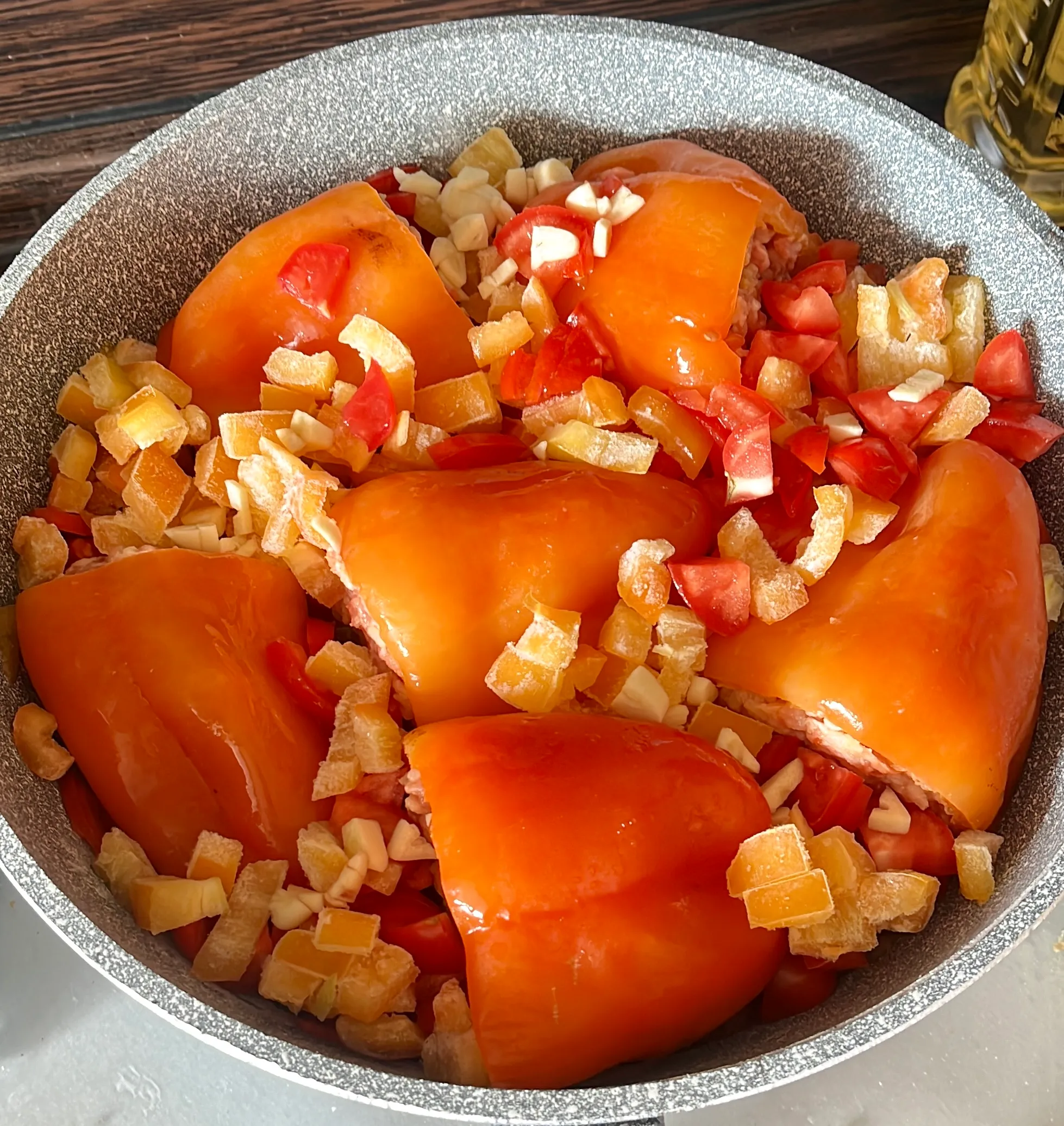 Возьмите свежий фарш, специи, отварной рис, смешайте в начинку. Заполните фаршем подготовленный перец. Если планируете использовать как заготовку позже, то аккуратно уложите в контейнер и отправьте в морозилку до дня приготовления. В нужный день переложите контейнер из морозилки утром в холодильник и дайте перцам разморозиться. За час до подачи на стол уложите перцы в глубокую сковороду.