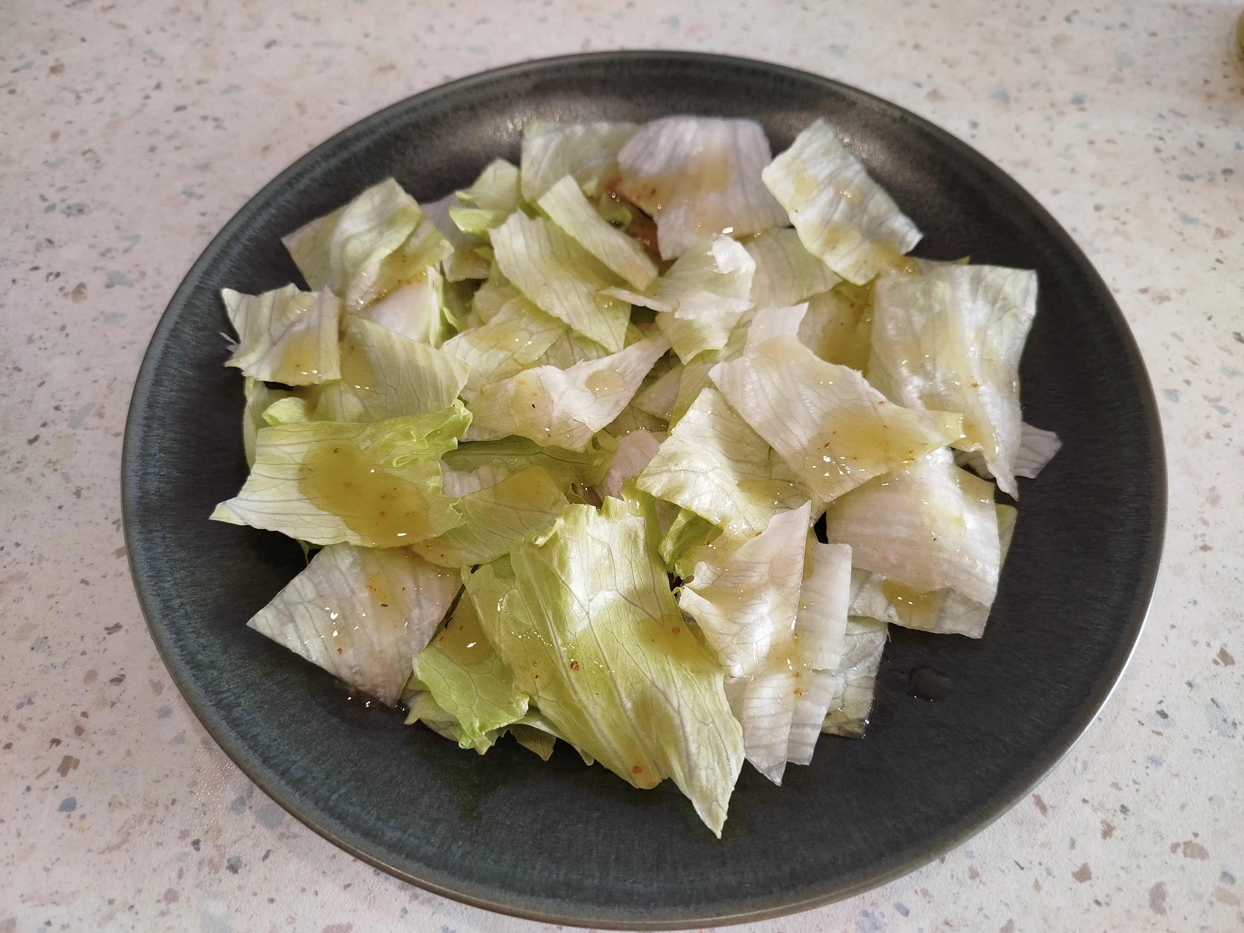 Выложите салат на тарелку и равномерно полейте 1/3 соуса.