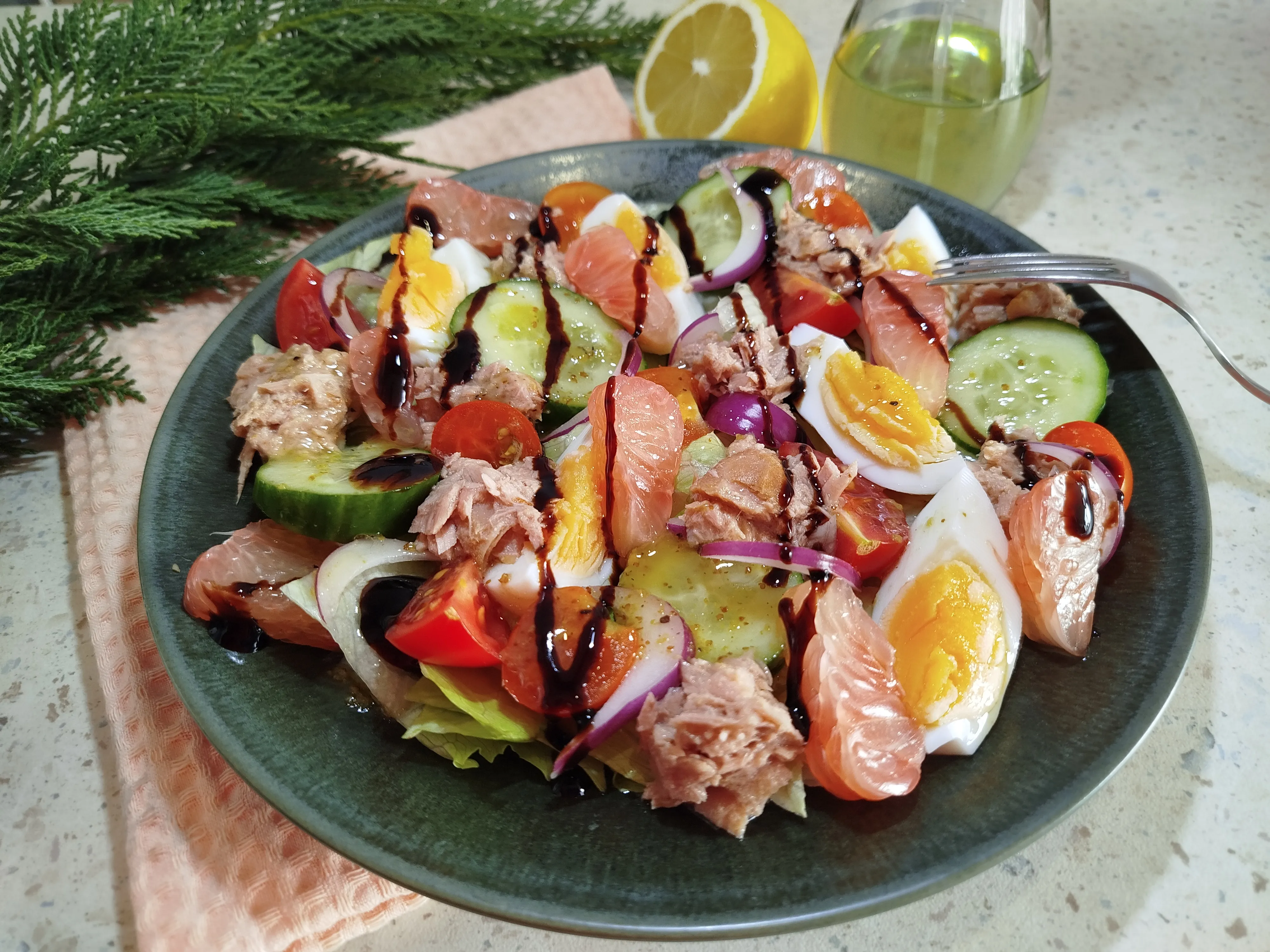 Сверху салата выложите остальные ингредиенты, разложите тунец, полейте оставшейся заправкой и украсьте соусом бальзамик.