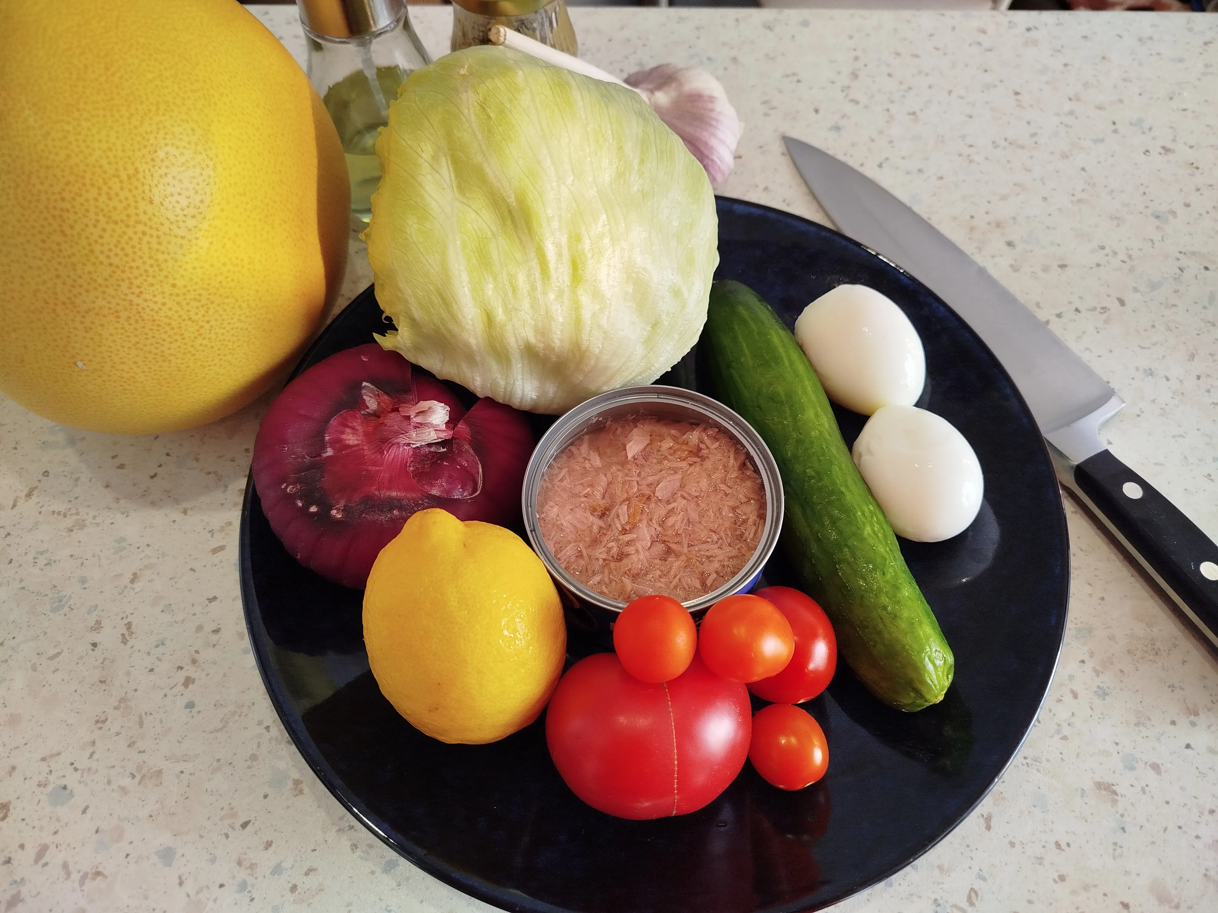Подготовьте все ингредиенты. Листья салата нарвите руками или нарежьте ножом и выложите на тарелку. Отварные яйца разрежьте на 4 части, огурец и помидоры нарежьте ломтиками, лук — полукольцами. Помело разделите на дольки и нарежьте их на части.