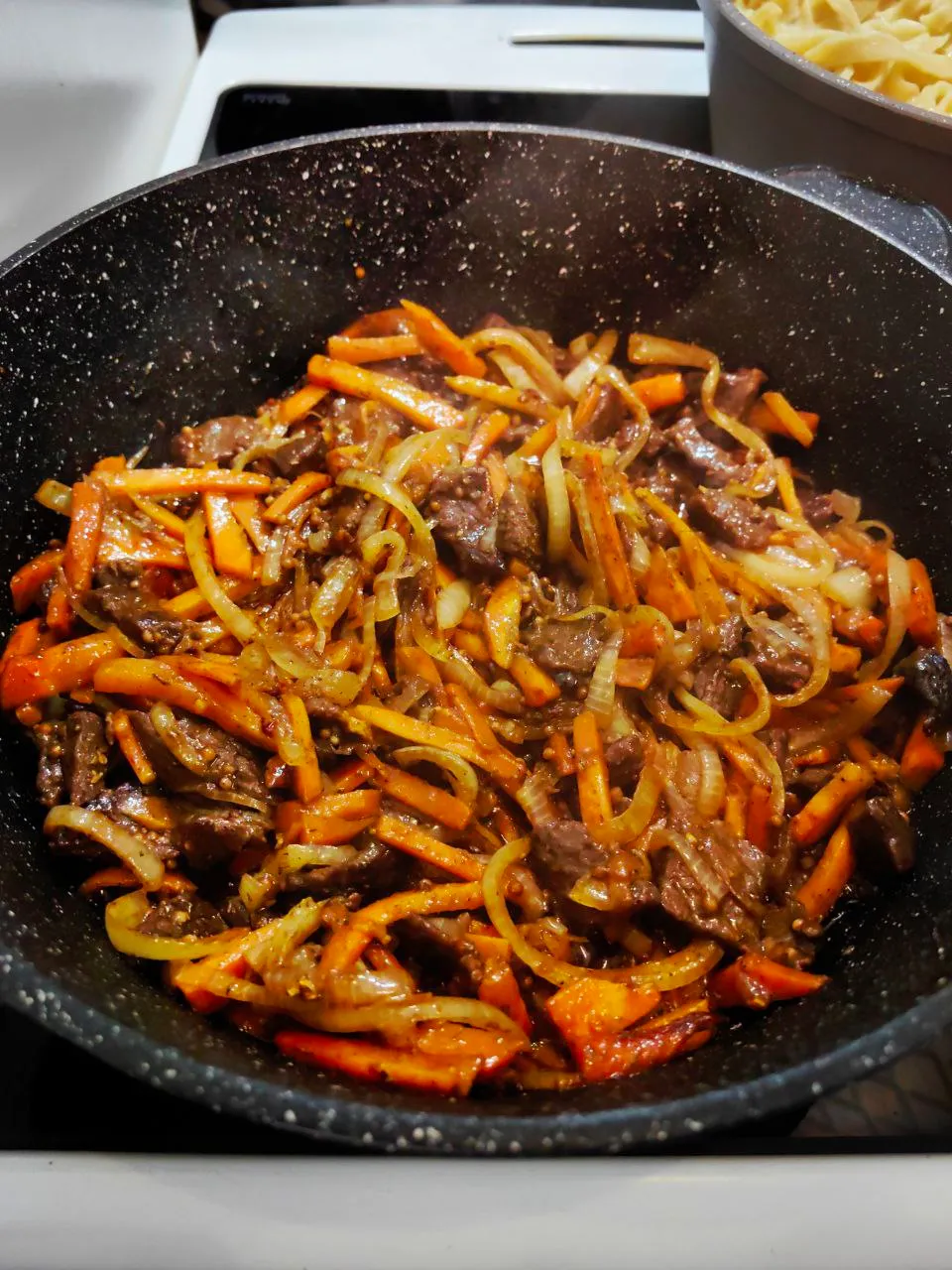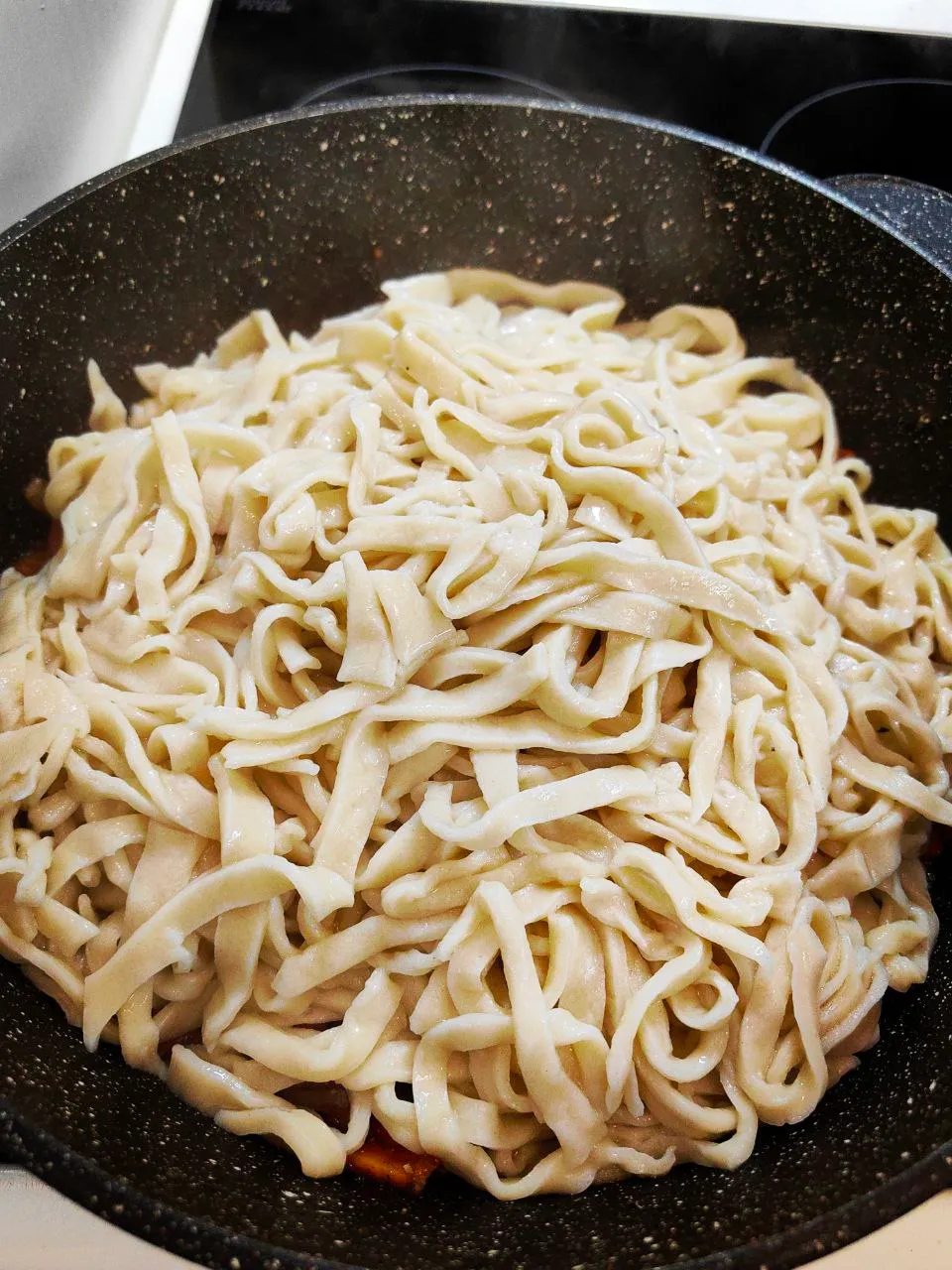 В сковороду переложите лапшу. Не накрывая крышкой, обжарьте на сильном огне минут 15-20.