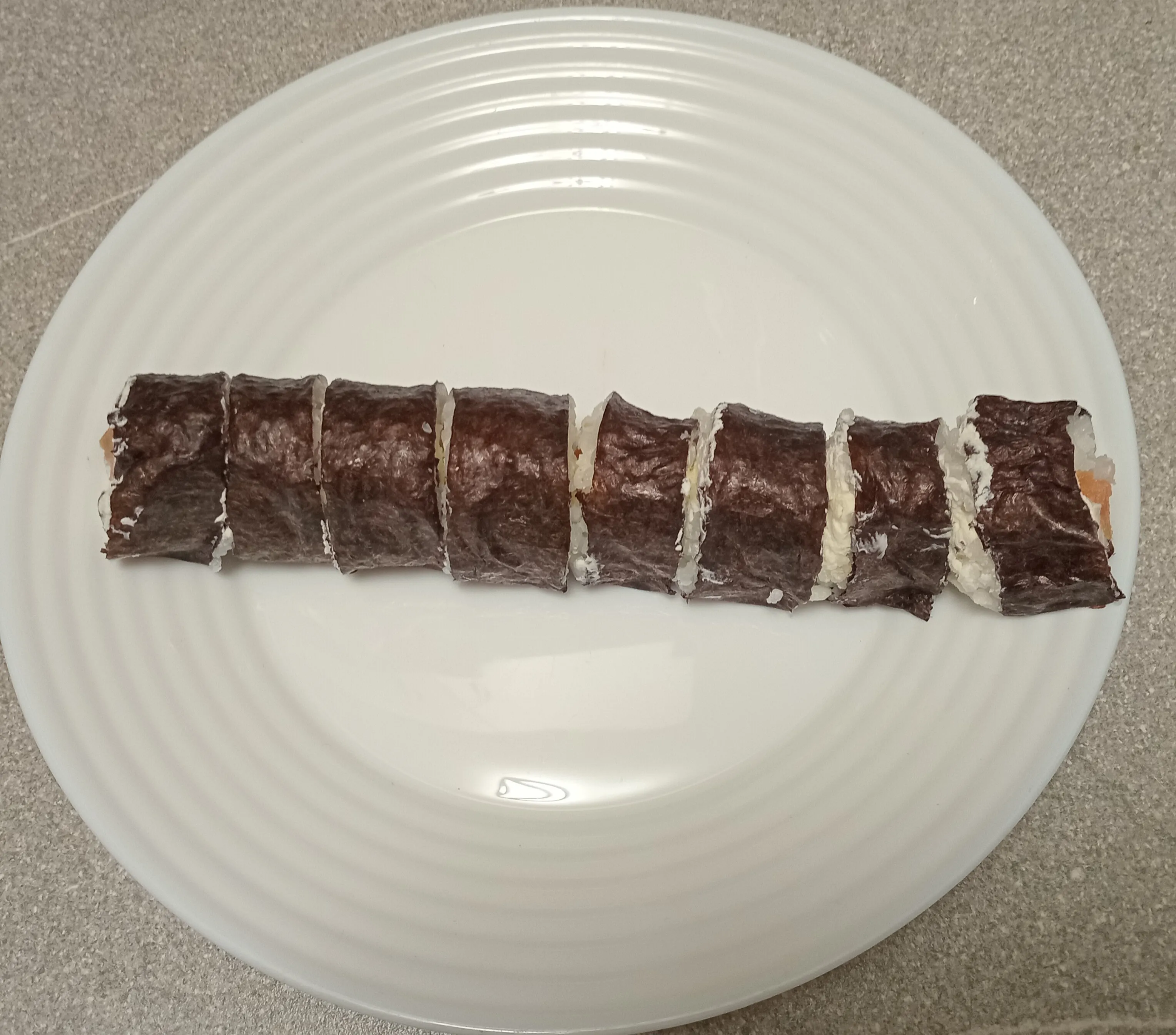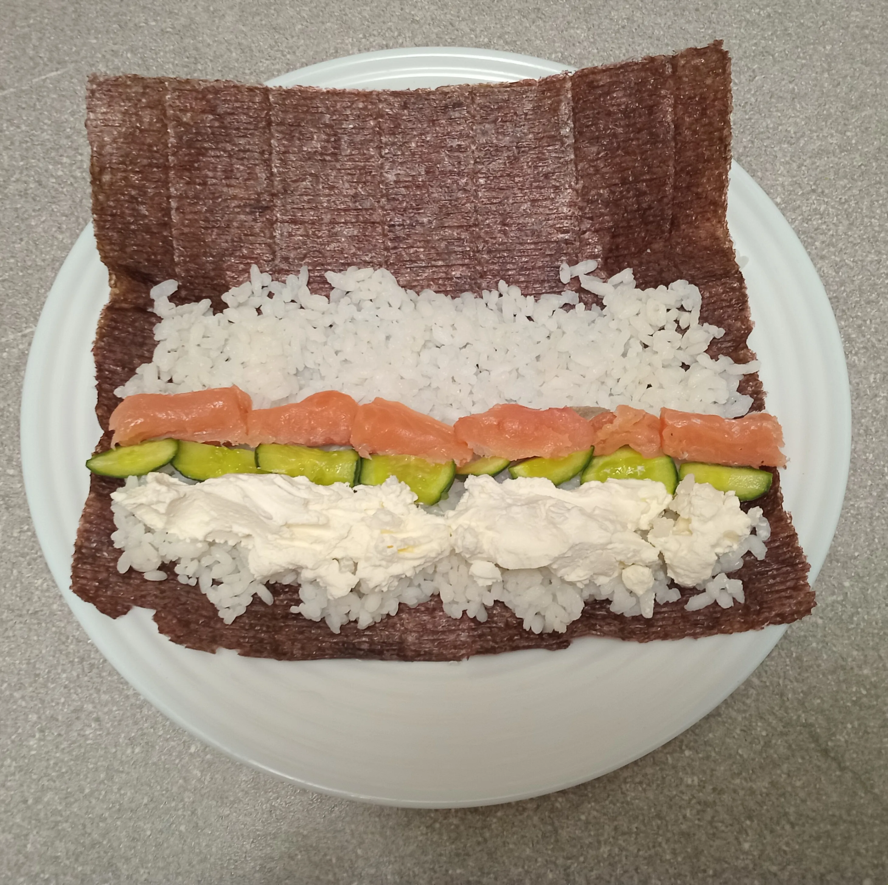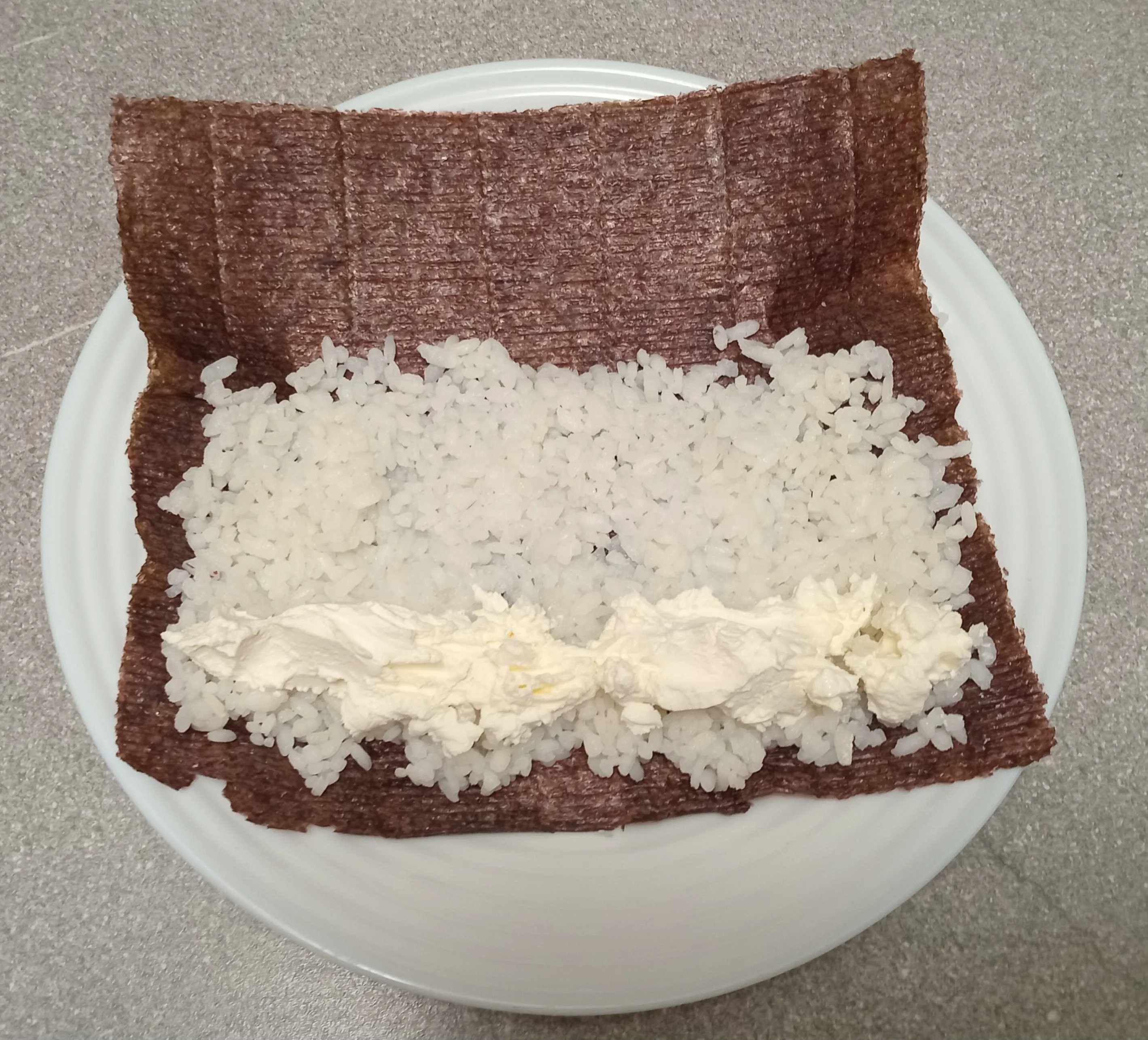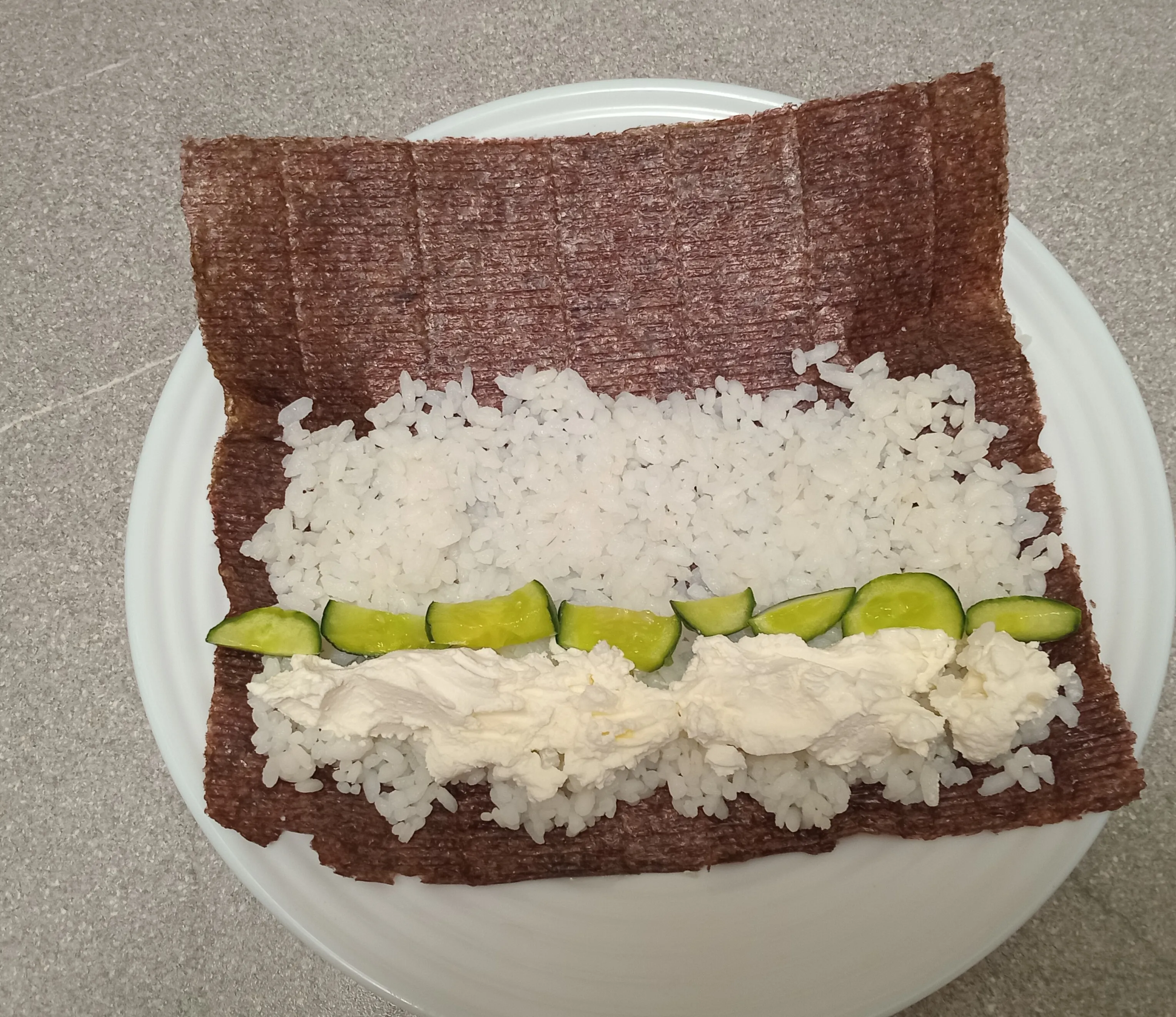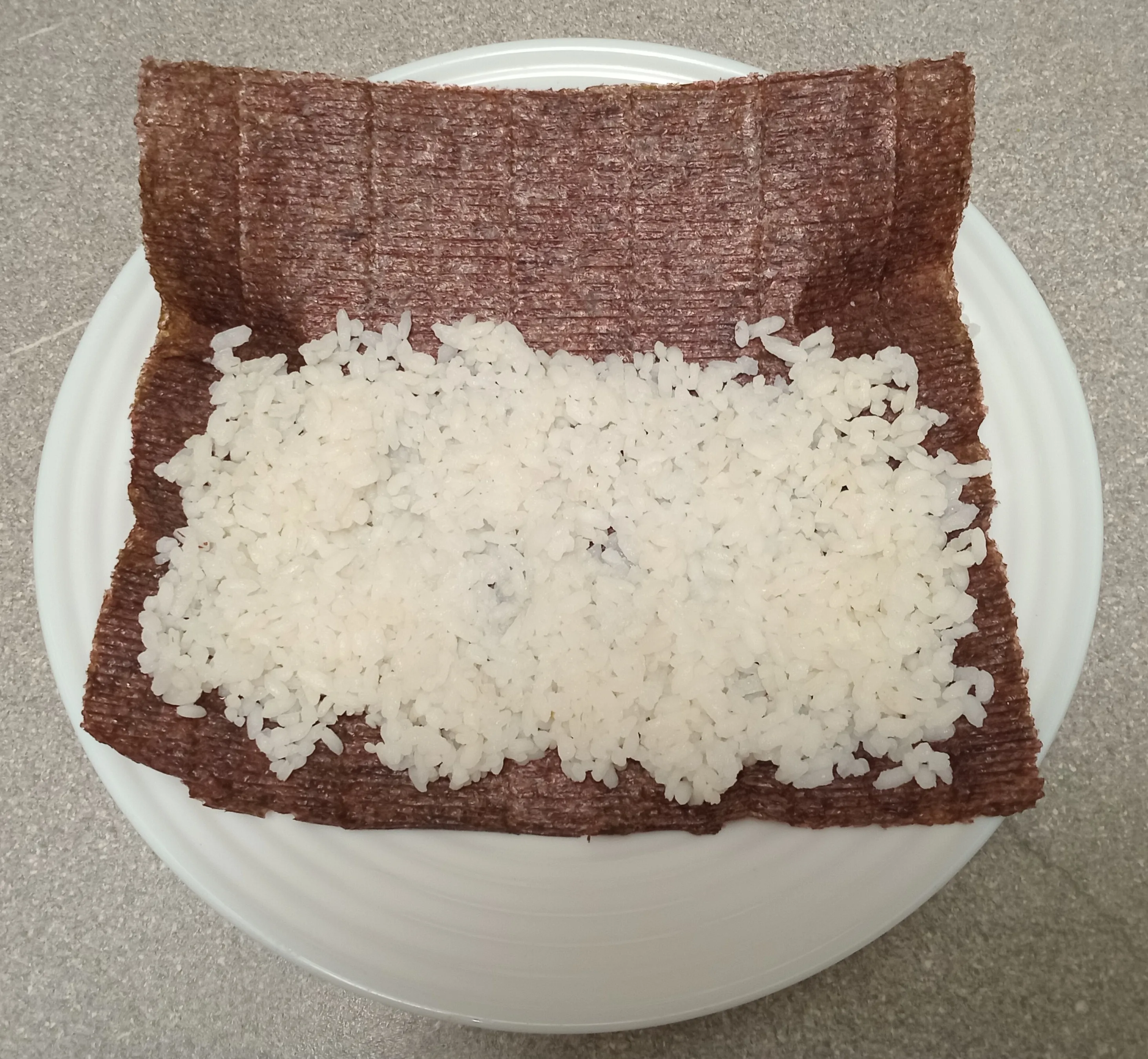 Рис залейте водой и варите 20 минут на небольшом огне. Остудите и добавьте рисовый уксус. Выложите рис на нори.