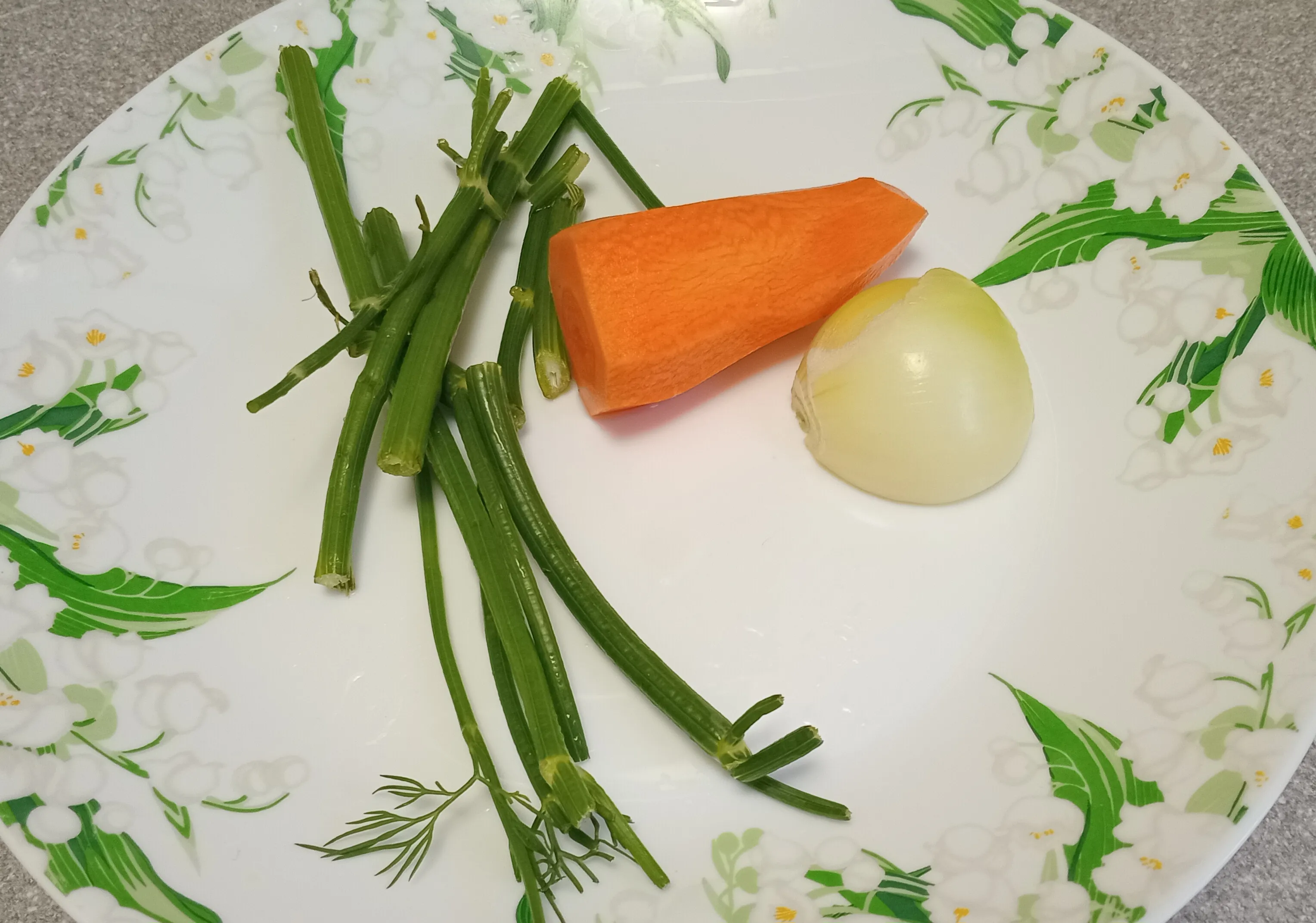 Добавьте очищенную морковь, лук, соль и стебли укропа.