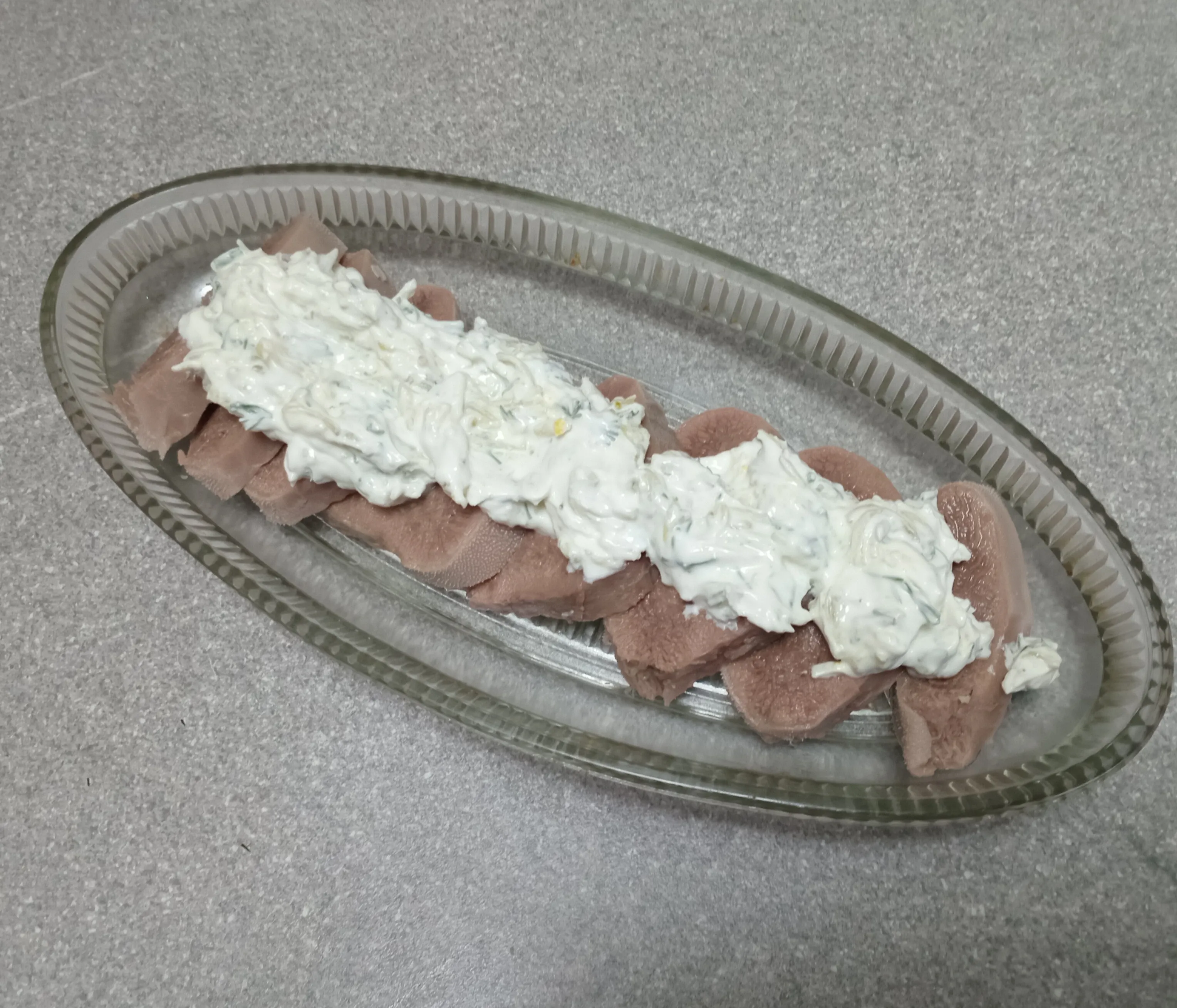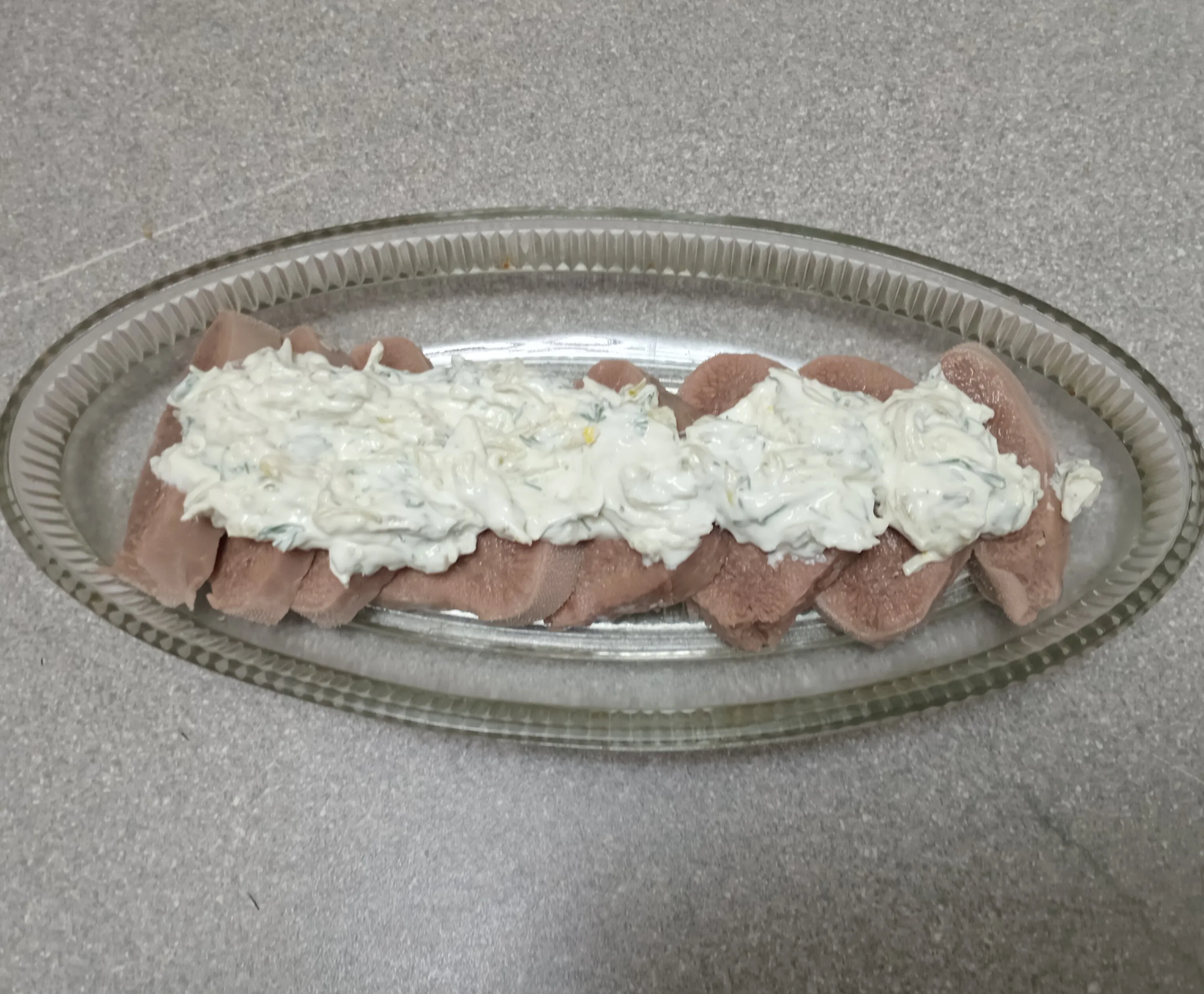 Выложите соус на ломтики языка.