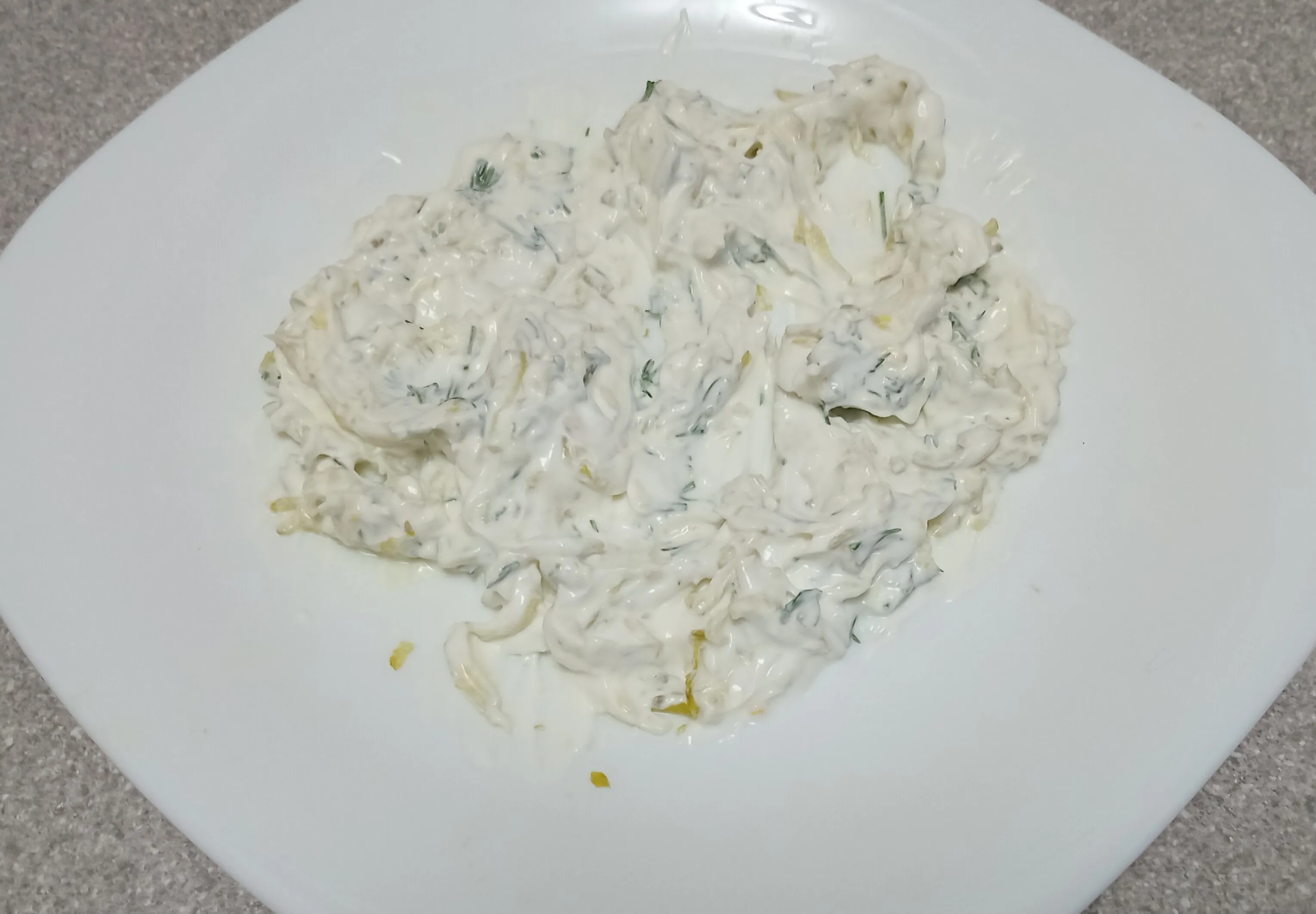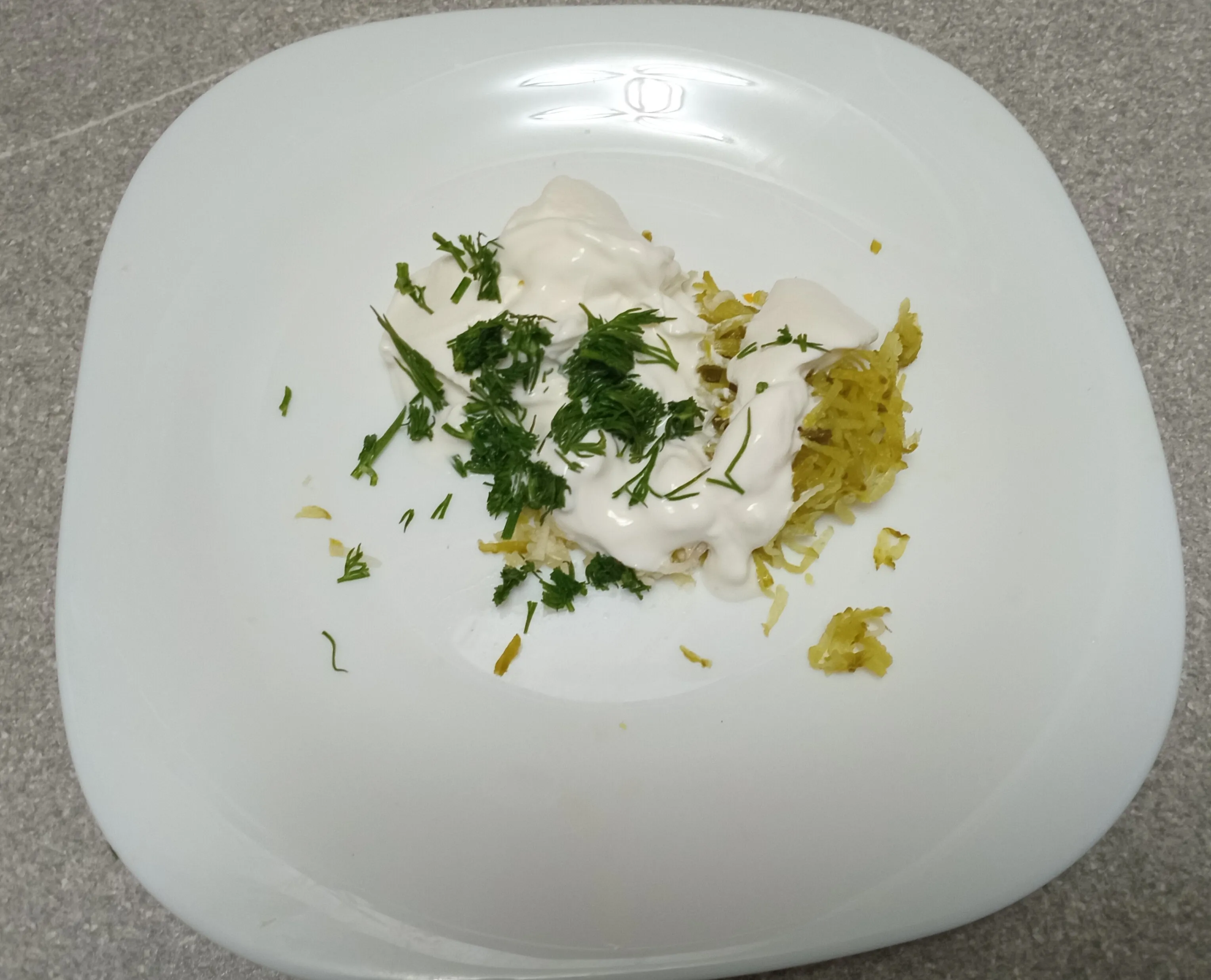 К сметане добавьте натёртый на мелкой тёрке огурец и чеснок, а также нарезанный укроп.