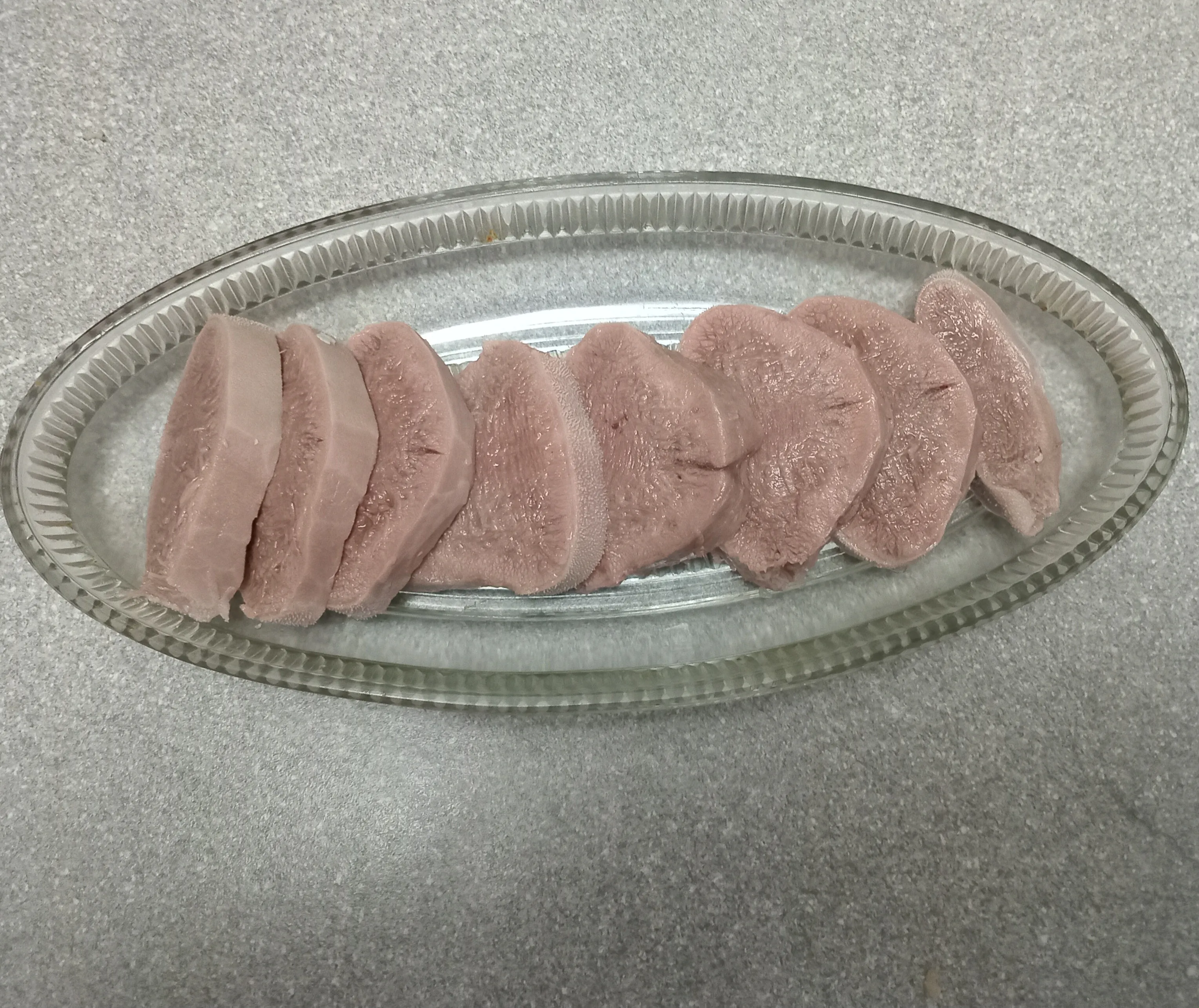 Нарежьте язык ломтиками и разложите на тарелке.
