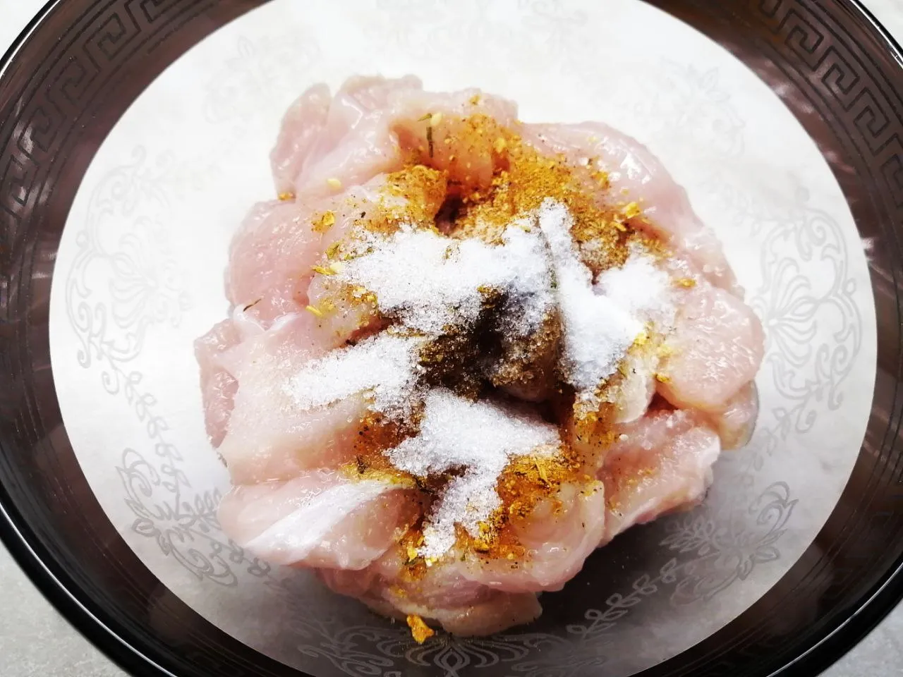 Куриное филе нарежьте кусочками. Добавьте приправы для курицы, соль, растительное масло. Оставьте мариноваться.