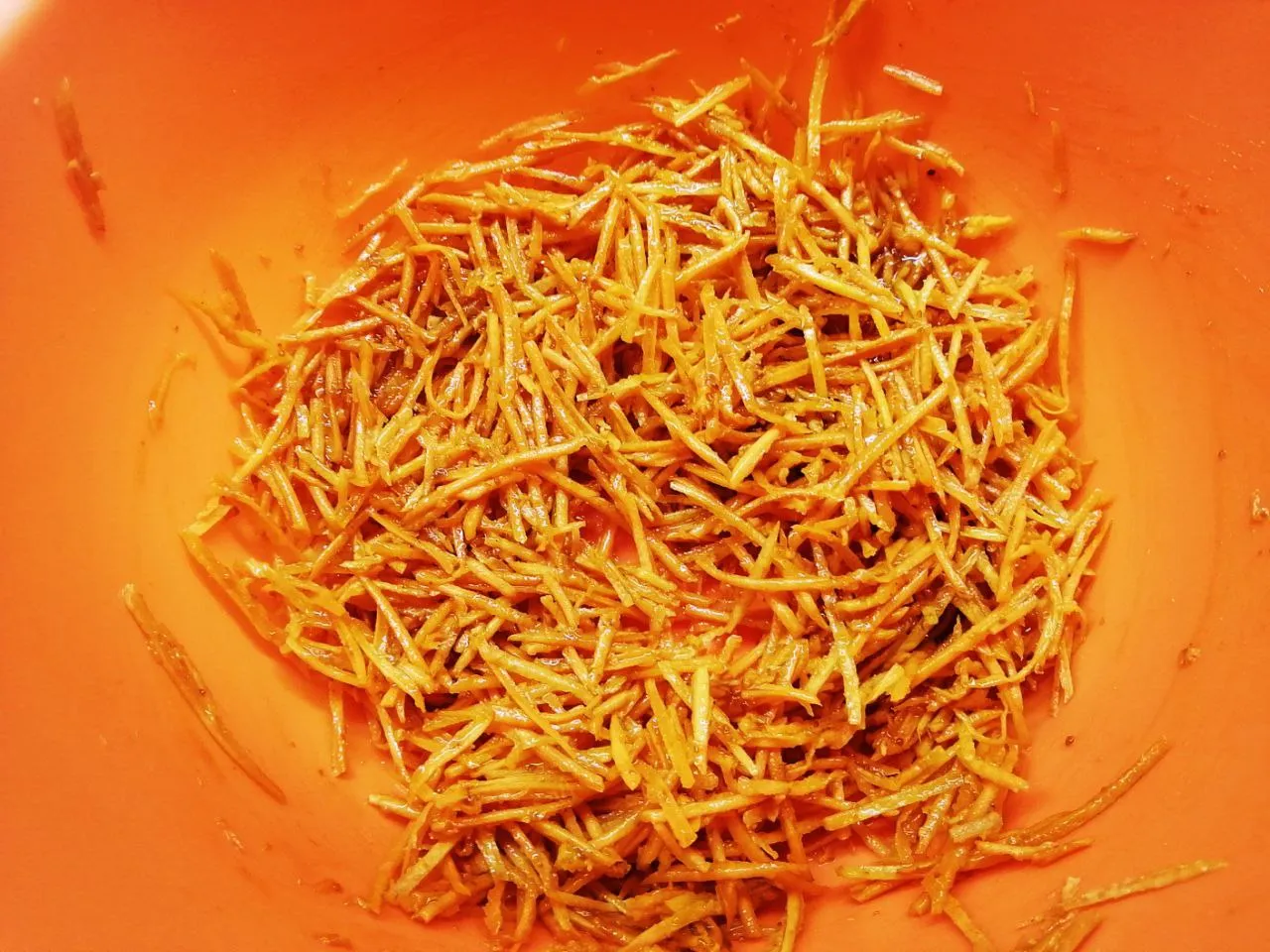 Морковь натрите на тёрке. Добавьте приправу для моркови по-корейски.