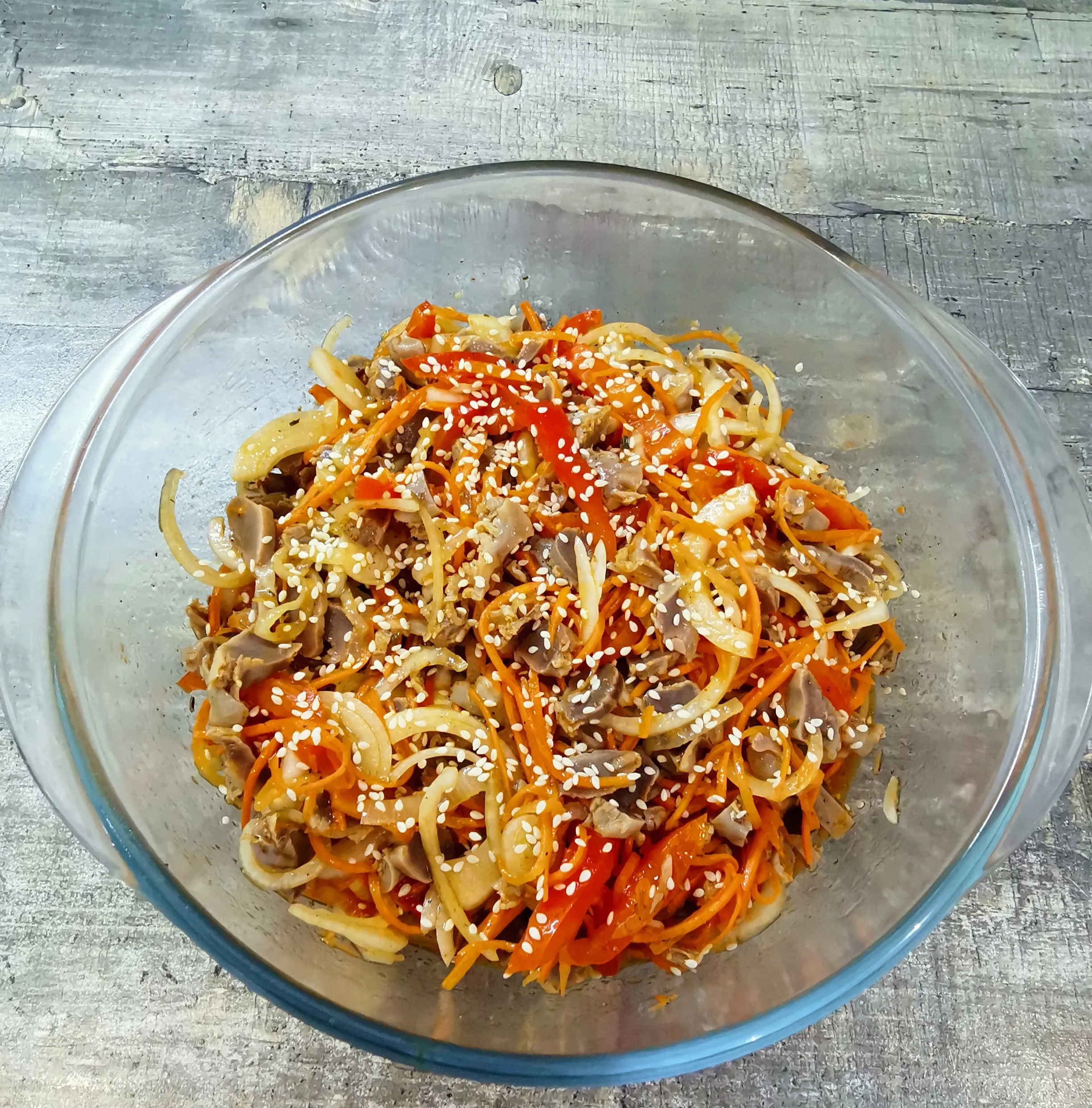 Овощи, морковь по-корейски и желудки выложите в салатник. Добавьте приправу, масло, соус, уксус. Всё перемешайте.