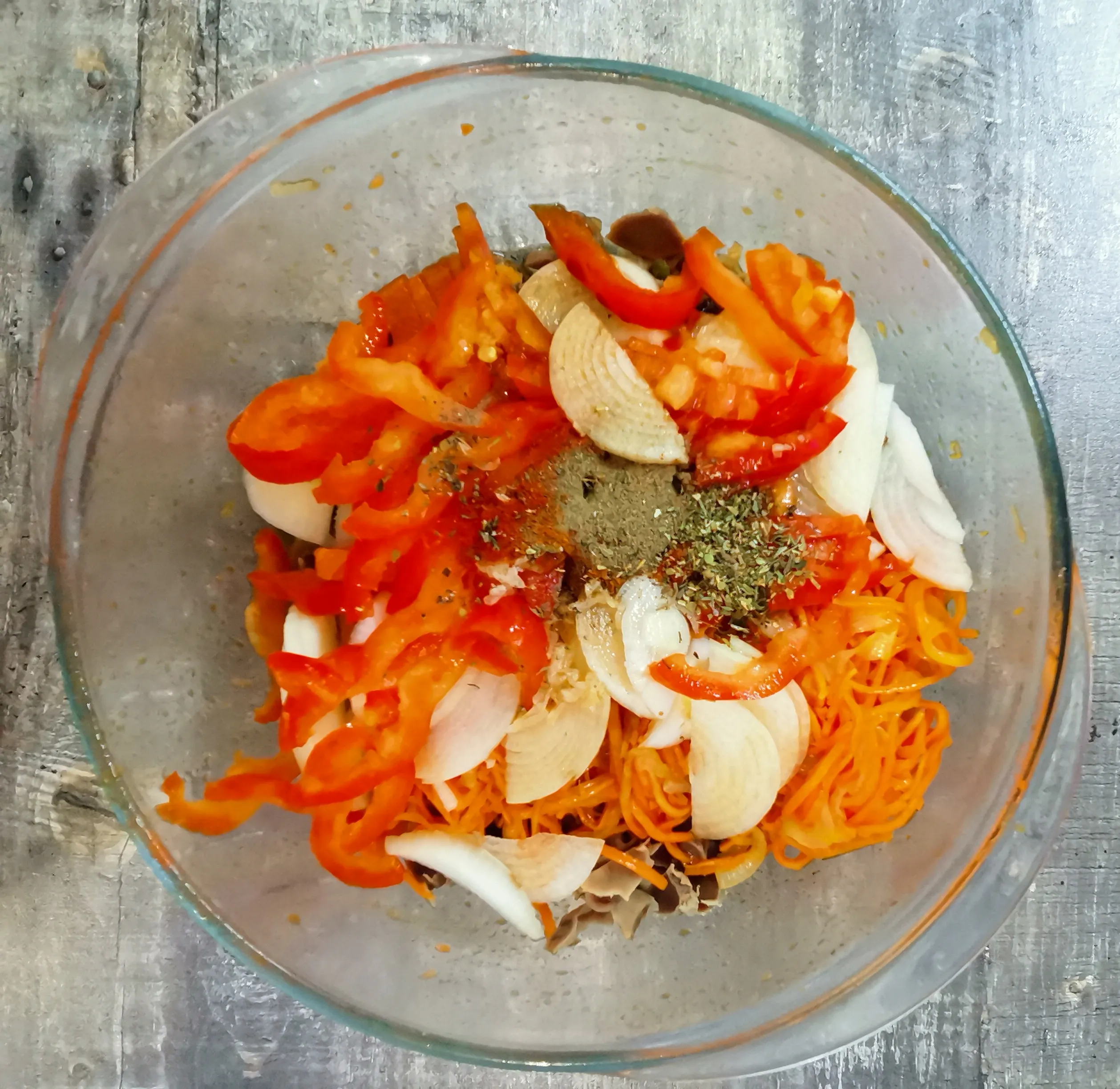 Пока варятся желудки, приготовьте овощи. Перец порежьте соломкой, лук — полукольцами, чеснок пропустите через пресс.