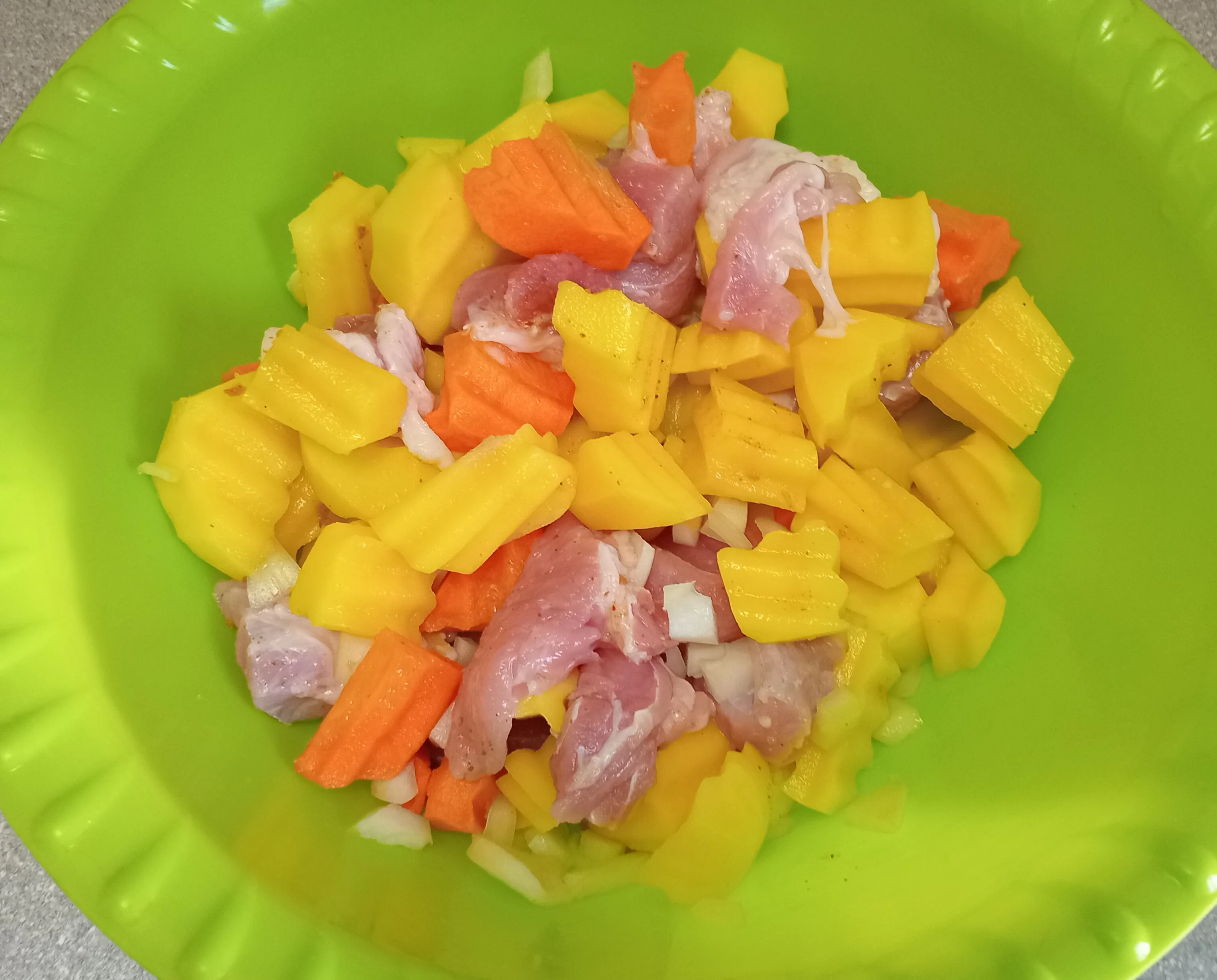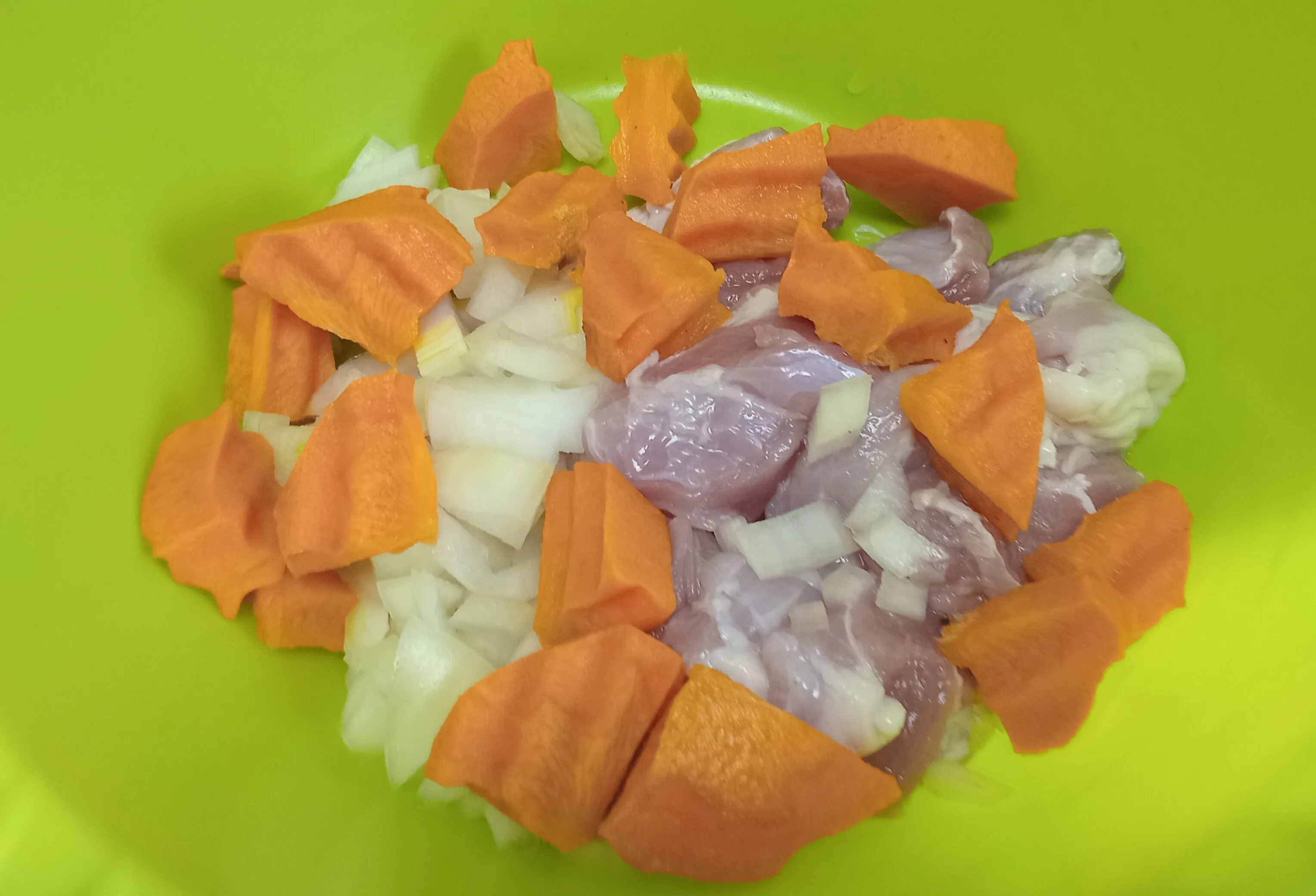 Нарежьте свинину и репчатый лук.