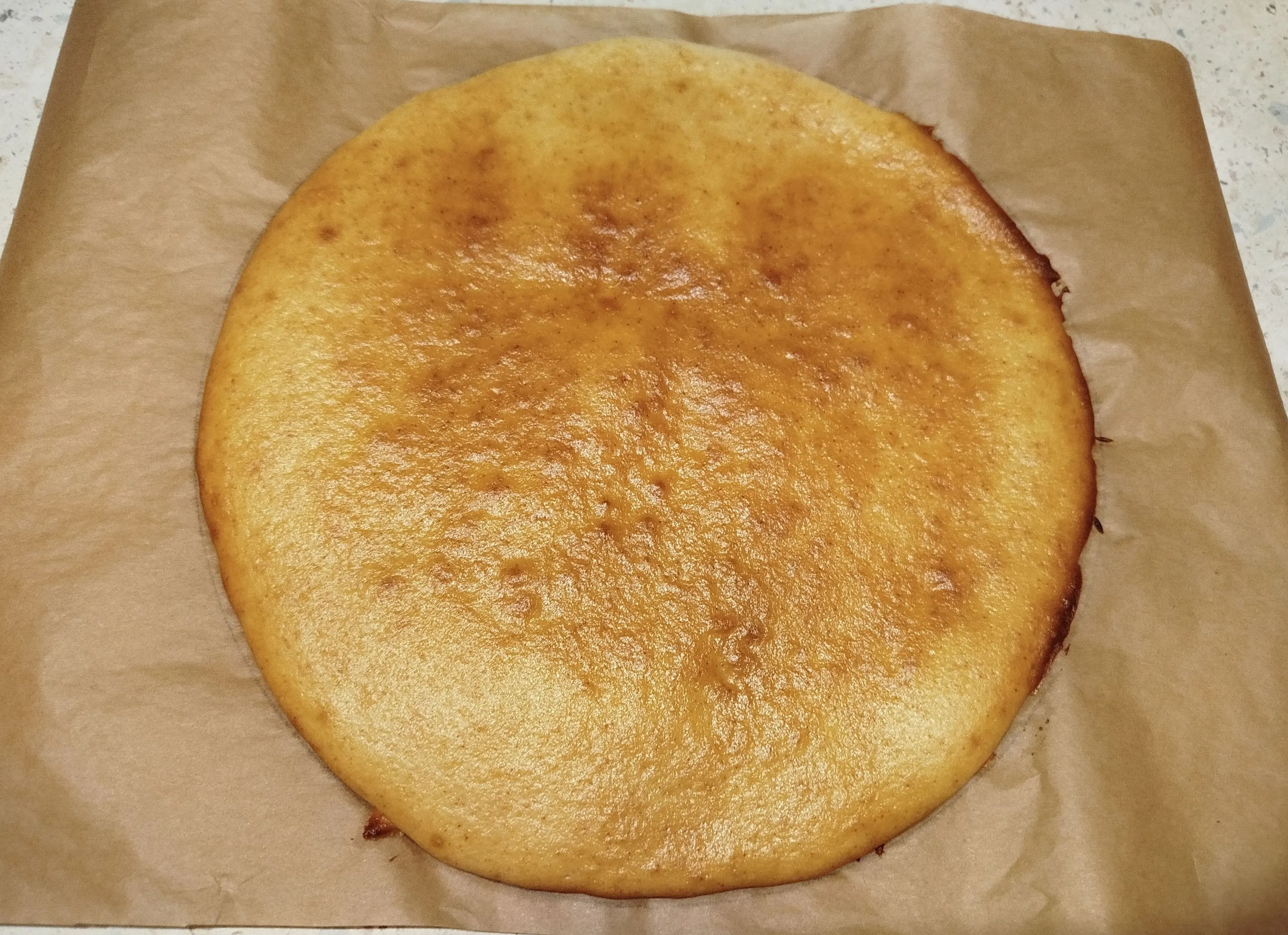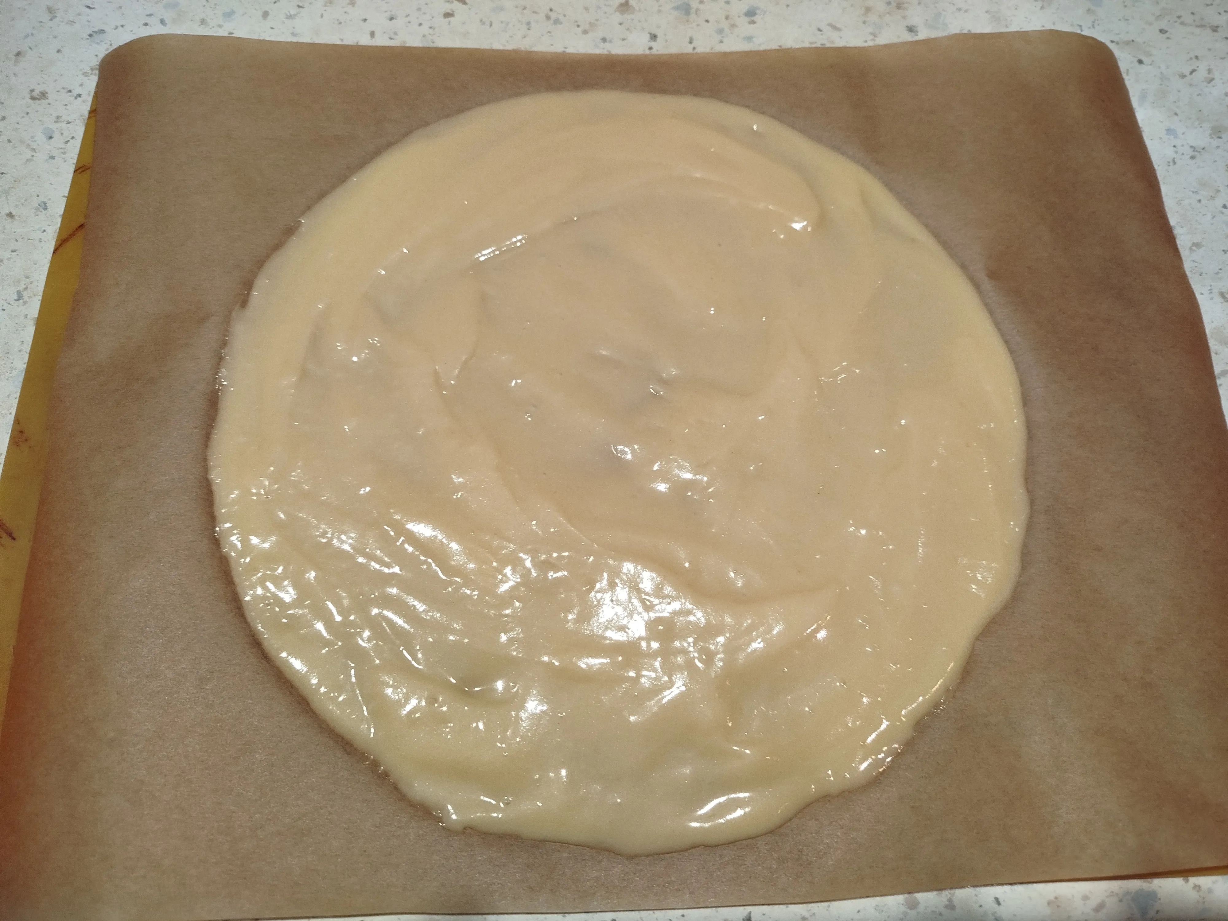 На бумаге для выпечки нарисуйте простым карандашом круг диаметром 30 см. Всё тесто распределите на четыре коржа. Тесто удобно распределять силиконовой лопаткой в пределах нарисованной формы.