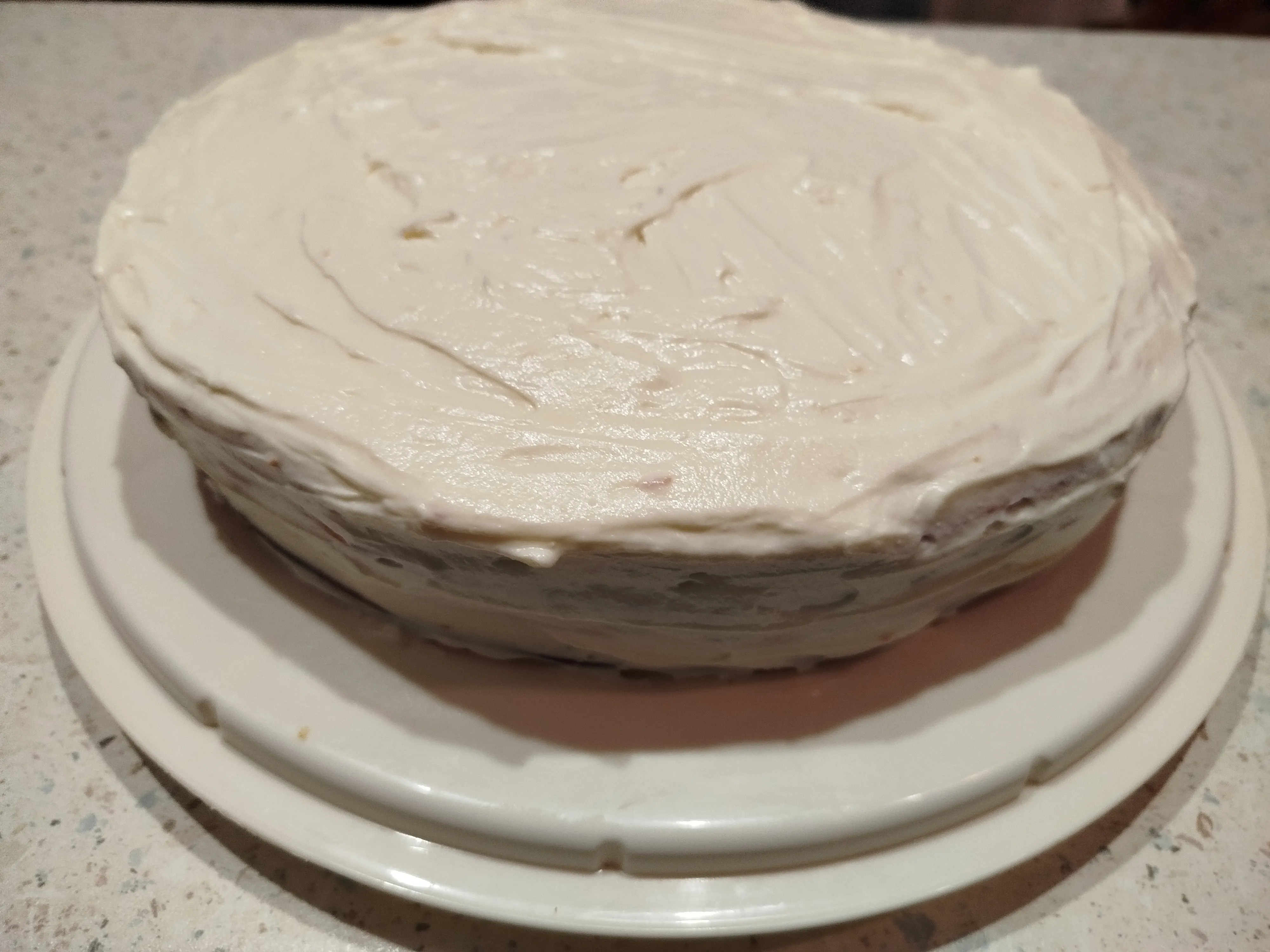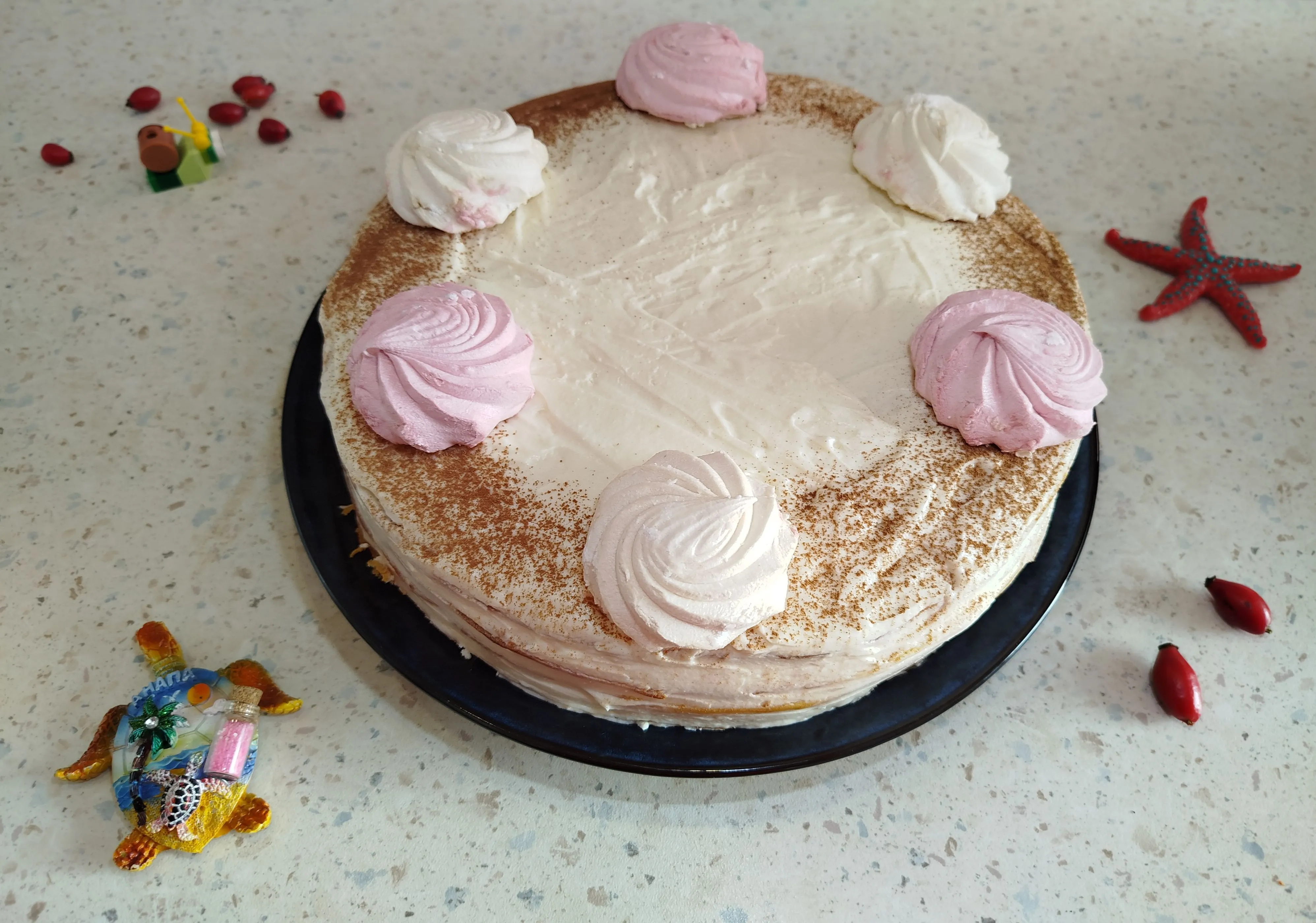 Смажьте коржи кремом, распределив весь крем на торт (минимум по 200 грамм на 1 корж). Коржи выкладывайте вверх дном. Затем нужно выровнять бока торта кремом (оставив 200 грамм крема для боков и, если необходимо, для украшения торта).