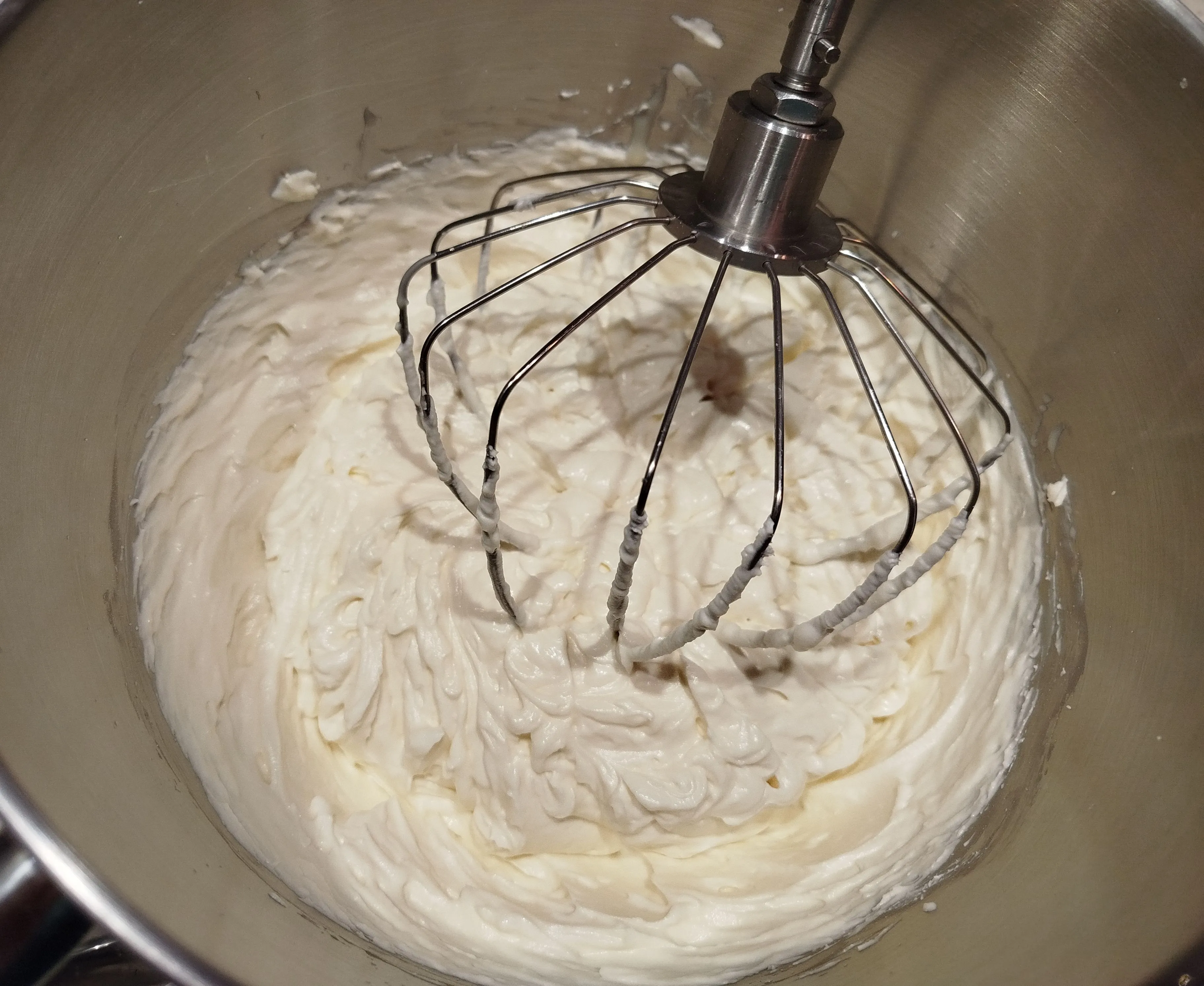 Соедините в миске ингредиенты для крема (сыр, сгущённое молоко, размягчённое сливочное масло). Взбейте миксером на оборотах выше среднего до увеличения в объеме и образования воздушной текстуры крема. Добавьте сухое молоко и еще раз взбейте миксером.