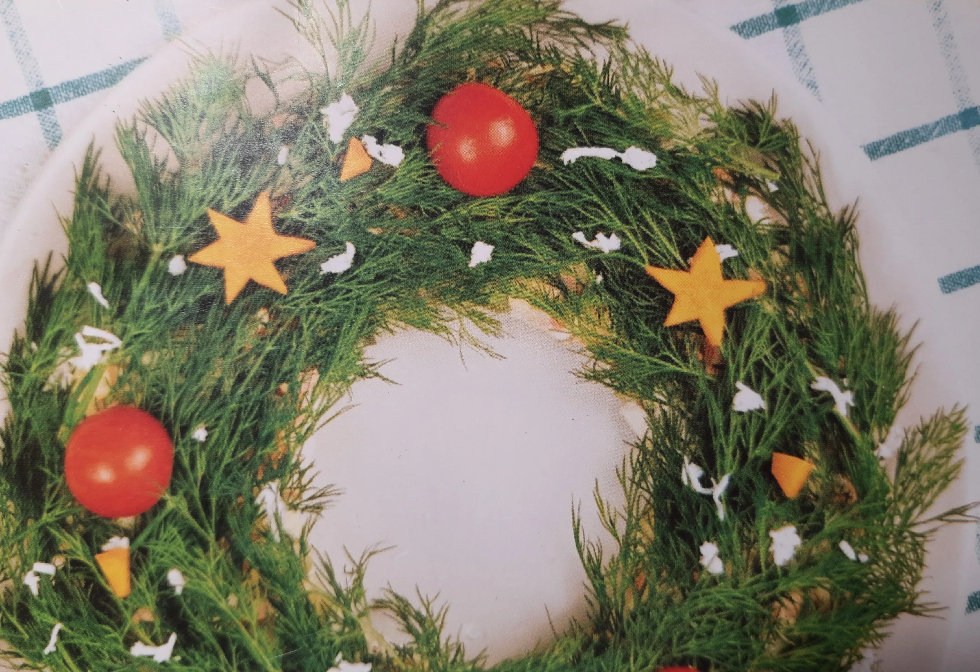 Нанесите сетку из майонеза, сверху положите укроп. Украсьте звёздочками из сыра и зелёным горошком.