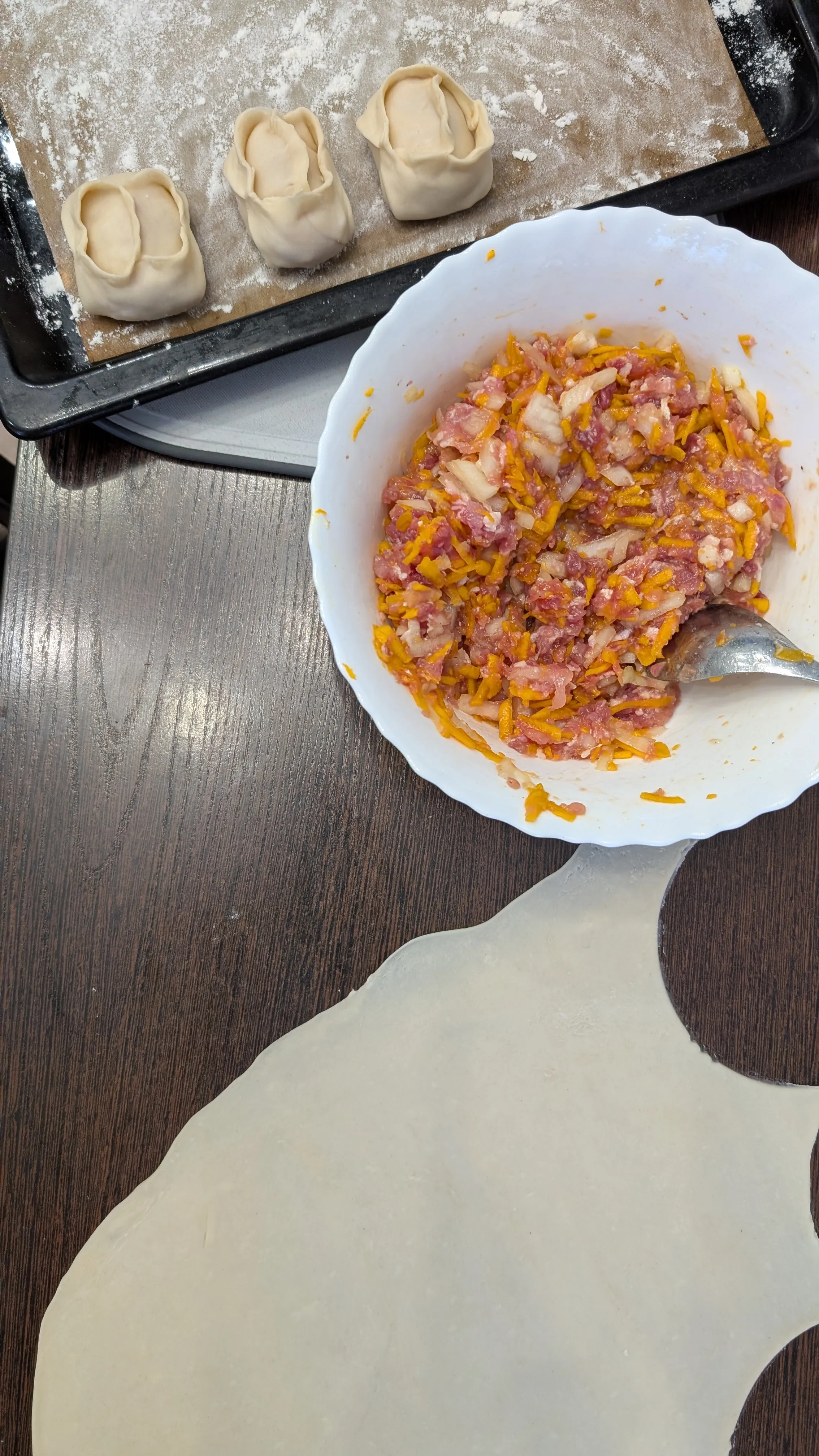Тонко раскатайте тесто, вырезайте тарелкой круги по размеру мант. Выложите начинку. Слепите как конвертик, а потом ещё кончики между собой.