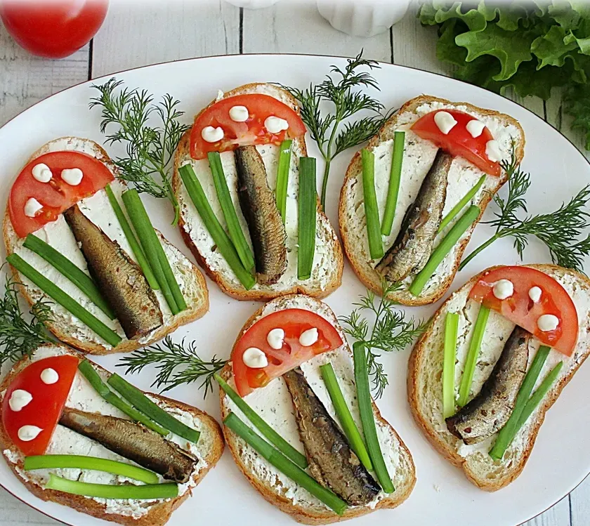 Разложите шпроты, нарежьте помидор пластинками, положите рядом с рыбой, имитируя шляпку мухомора.