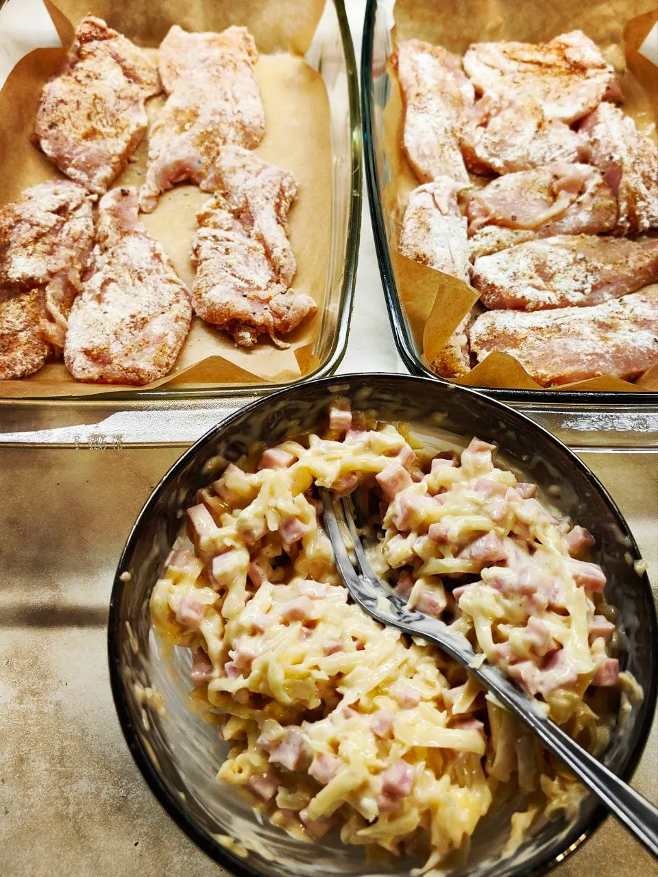 Филе нарежьте толщиной 2 см. Посолите, поперчите, посыпьте специями, обваляйте в муке. Выложите на бумагу. Натрите сыр на тёрке, измельчите ветчину, смешайте всё с яйцом и сыром.