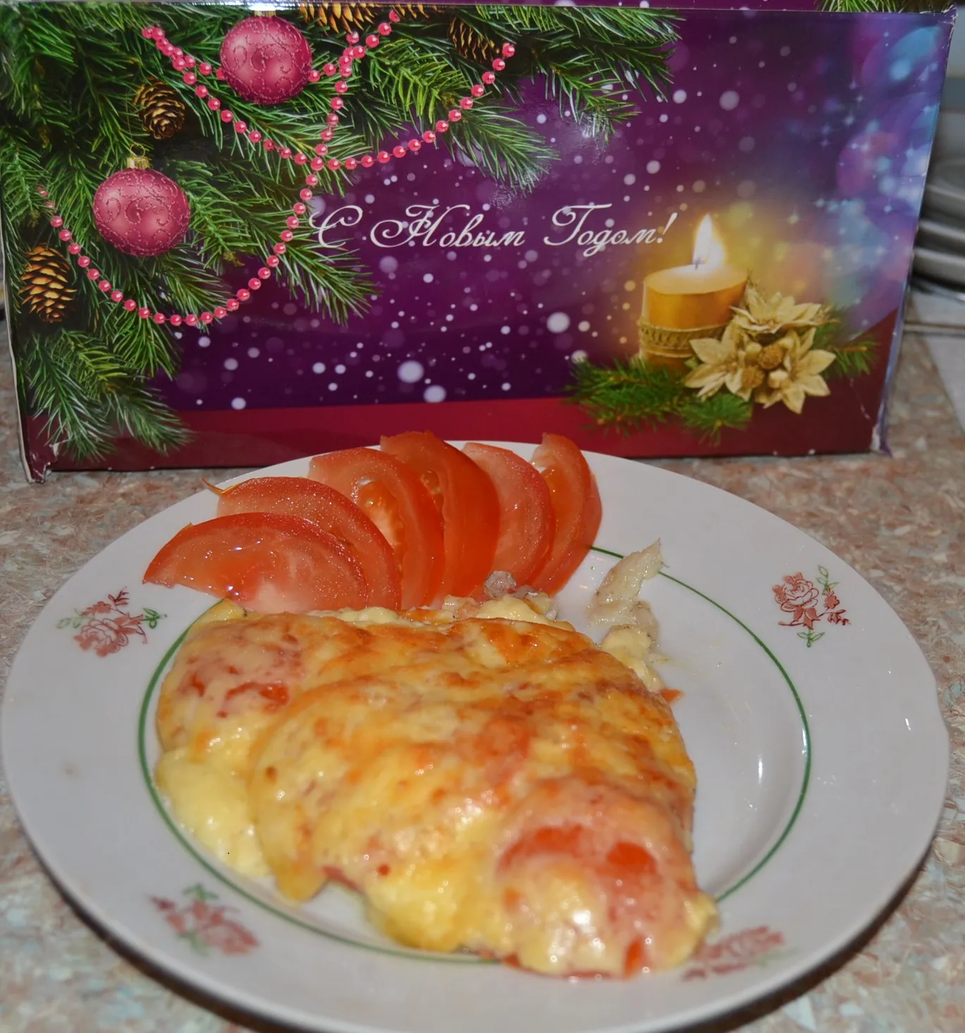 В ёмкости смешайте сырое яйцо, рубленую зелень и майонез, смажьте рыбу, а затем разложите нарезанный лук. Сверху выложите порезанные дольками помидоры. Посыпьте сыром и отправьте в духовку.