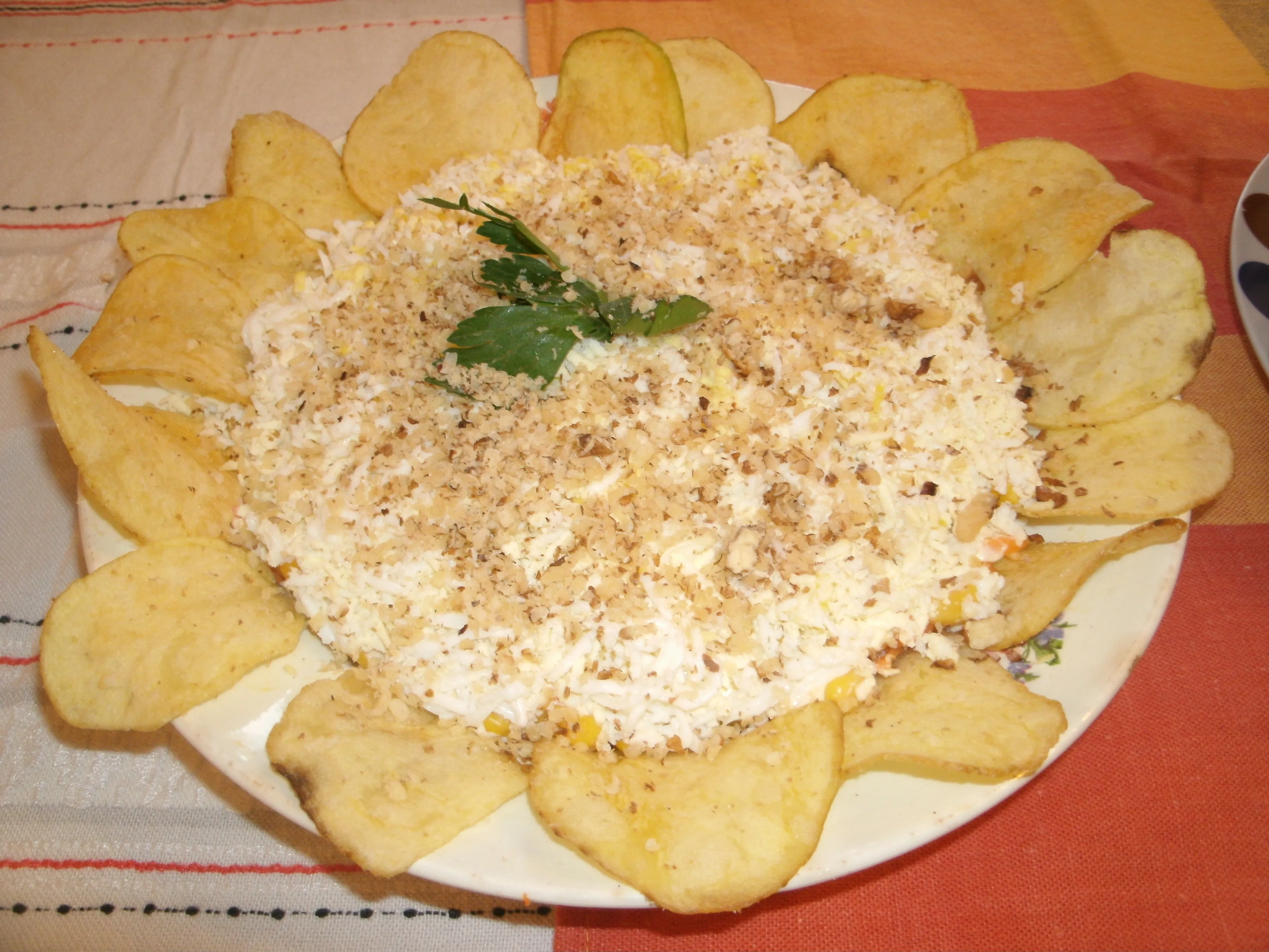 Выложите салат горкой на плоское блюдо. Вокруг выложите чипсы. Посыпьте салат сверху оставшимися грецкими орехами.