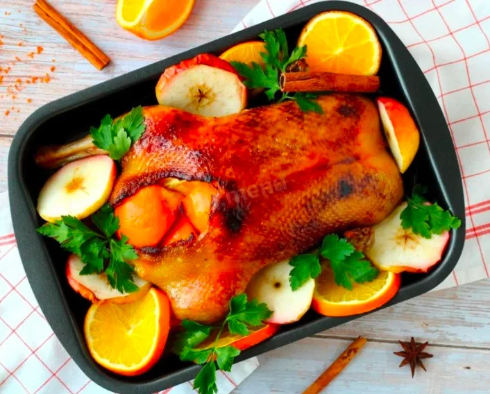 По желанию можно дополнительно порезать апельсин и яблоко кружочками и выложить их к утке за 15 минут до конца приготовления.