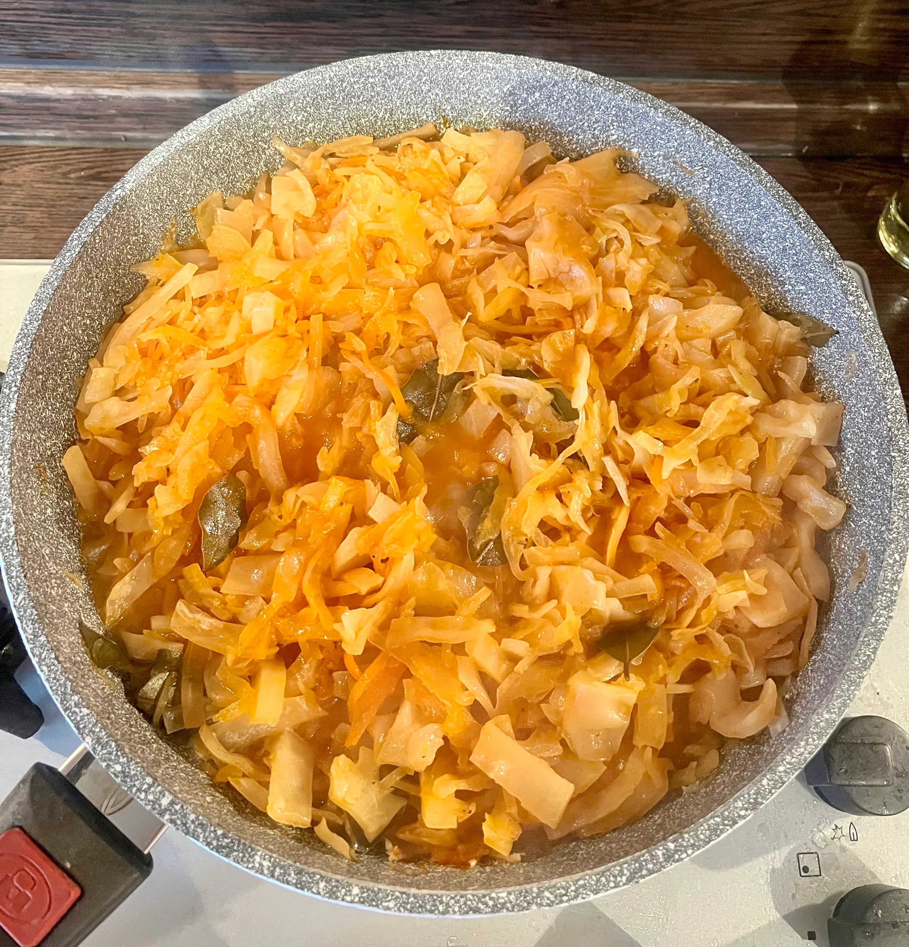 В глубокой сковороде смешайте готовую квашеную и свежую, тонко нашинкованную капусту, добавьте немного воды, лавровый лист, кетчуп, тушите на медленном огне 2 часа.